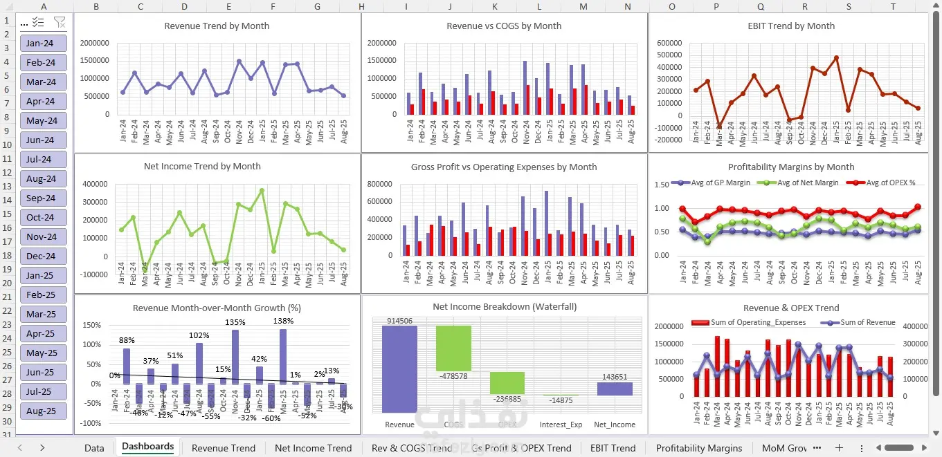هذا نموذج لعمل قمت بتنفيذه لأحد العملاء، حيث تم تحليل بيانات مالية شاملة تشمل الإيرادات، المصروفات، تكلفة البضاعة، الأرباح التشغيلية وصافي الدخل لعدة أشهر. تفاصيل العمل المنفذ: تنظيف وإعداد البيانات المالية وتجهيزها للتحليل. إنشاء داشبورد تفاعلية تشمل: اتجاه الإيرادات Revenue Trend مقارنة Revenue vs COGS اتجاه EBIT اتجاه صافي الدخل Net Income هامش الربحية Profitability Margins معدل النمو الشهري Month-over-Month Growth مخطط Waterfall لتحليل مكونات الربح مقارنة بين OPEX والإيرادات إضافة Slicers للتصفية حسب الفترة. تصميم احترافي يسهل على الإدارة قراءة الوضع المالي خلال ثوانٍ. نتيجة المشروع: العميل حصل على لوحة مالية تساعده في: تتبع الأداء المالي شهريًا. معرفة اتجاهات الربحية والخسائر. اتخاذ قرارات مبنية على بيانات واضحة. عرض معلوماته المالية بشكل محترف أمام الإدارة.