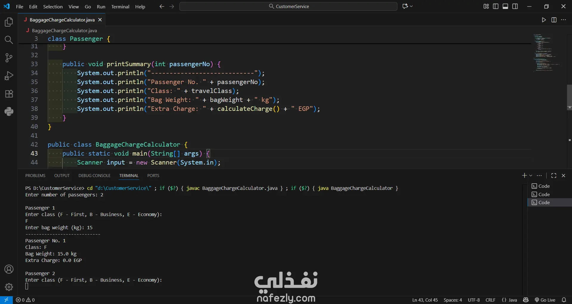تطبيق بلغة Java يقوم بحساب التكلفة الإضافية للوزن الزائد حسب درجة السفر وعدد الركاب. البرنامج يعتمد على البرمجة الكائنية (OOP) ويتيح إدخال بيانات كل راكب (الدرجة – الوزن) ثم يعرض التكلفة بدقة. الوظائف: تحديد عدد الركاب. إدخال درجة السفر (First / Business / Economy). إدخال وزن الحمولة لكل راكب. حساب الوزن الزائد وسعره (10 جنيه لكل كجم زائد). عرض ملخص منسق لكل راكب. التقنيات: Java / OOP / Console / Scanner