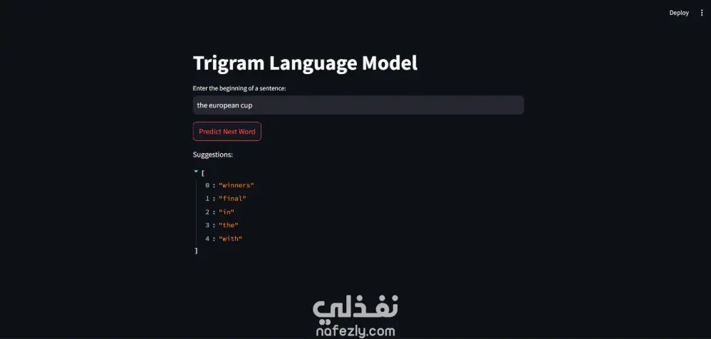 يقوم هذا المشروع بتنفيذ نموذج لغة ثلاثي الكلمات (Trigram) باستخدام لغة بايثون وتقنيات معالجة اللغة الطبيعية. يقوم المشروع بمعالجة مجموعة نصوص، توليد ثلاثيات الكلمات (Trigrams)، حساب احتمالاتها باستخدام تسوية لابلاس (Laplace Smoothing)، وتقييم أداء النموذج من خلال قياس التعقيد (Perplexity). كما يتضمن المشروع تطبيق ويب باستخدام Streamlit يتيح للمستخدمين إدخال جمل والحصول على توقعات للكلمة التالية بناءً على احتمالات الثلاثيات. يعرض هذا المشروع مهارات معالجة النصوص، نمذجة الـ n-grams، تقدير الاحتمالات، وبناء تطبيقات تفاعلية لمعالجة اللغة الطبيعية لتوقع الكلمات وتحليل النصوص بشكل مباشر.