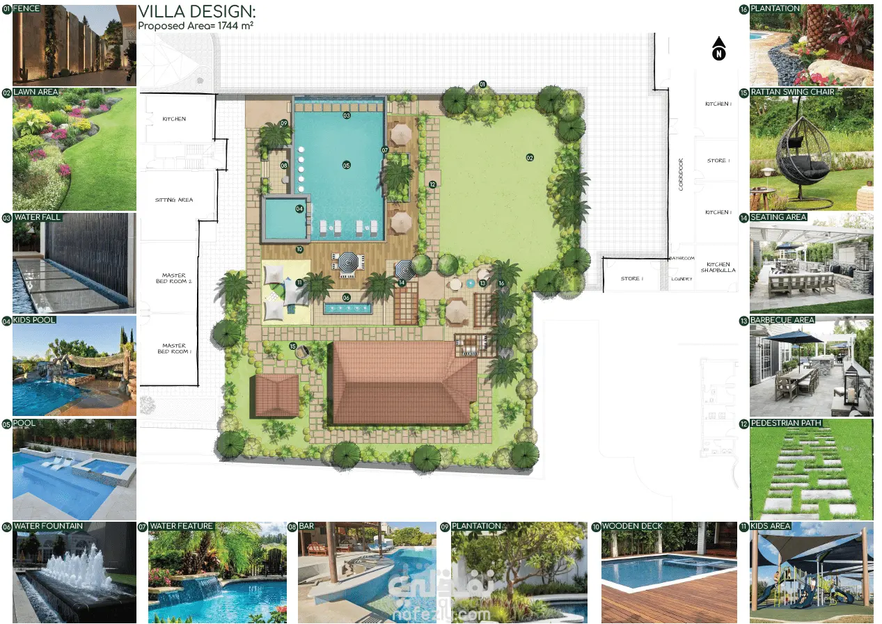 تصميم 2d لحديقة خاصة بطراز مودرن وتوضيح مكان : -حمام السباحة . -التبليطات المستخدمة في المشروع. -أماكن الجلوس ومنطقة لعب الأطفال. -توزيع عناصر النبات المستخدمة. منطقة lawn في المشروع.