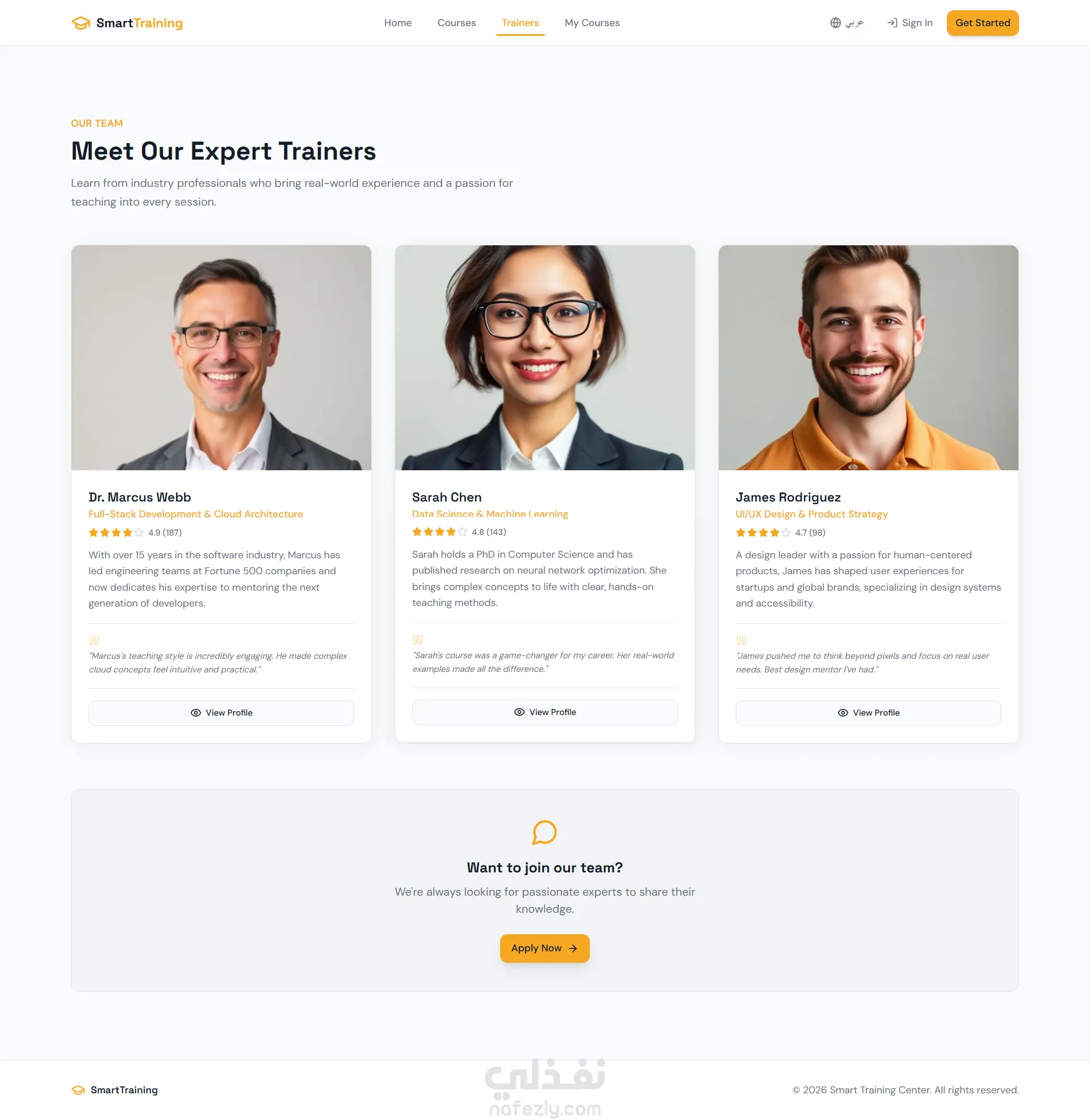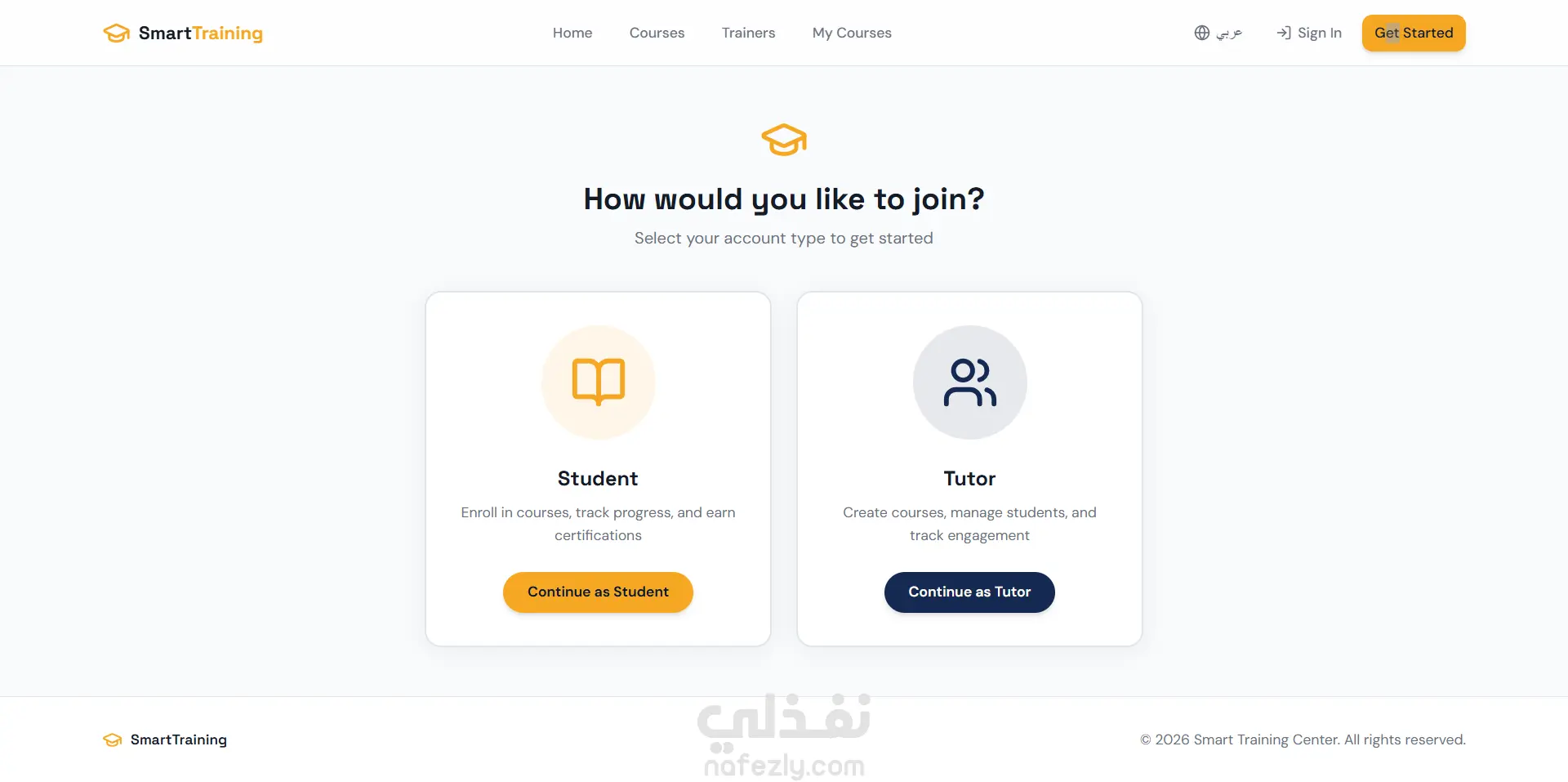 هو نظام إدارة تعلم متكامل وعصري، تم تصميمه لربط المدربين والطلاب في بيئة تعليمية تفاعلية. يركز المشروع على تقديم تجربة مستخدم (UX) استثنائية من خلال واجهات نظيفة وبسيطة، مع لوحات تحكم متقدمة لإدارة الدورات، تتبع التقدم، وتحليل البيانات. **المميزات الرئيسية للنظام: 1. تجربة الطالب (Student Experience): تصفح الدورات: واجهة لعرض الدورات التدريبية مع فلاتر ذكية (مبتدئ، متوسط، متقدم). صفحة تفاصيل الدورة: تشمل المنهج الدراسي، معلومات المحاضر، ومتطلبات الدورة، ونظام تقييمات الطلاب. لوحة تحكم الطالب (My Courses):تتيح للطالب متابعة الدورات المسجل بها، ومعرفة نسبة الإنجاز في كل دورة بشكل مرئي . نظام تسجيل مرن: دعم التسجيل عبر البريد الإلكتروني أو الربط مع Google. 2. لوحة تحكم المدرب (Trainer Dashboard): الإحصائيات العامة: عرض إجمالي عدد الطلاب، الإيرادات، والتقييمات، وعدد الدورات النشطة. إدارة الطلاب: جدول تفصيلي لمتابعة تقدم كل طالب بشكل فردي (حالة الالتحاق، نسبة الإكمال). تحليل الأداء (Analytics):رسوم بيانية توضح اتجاهات التسجيل الشهرية وتوزيع التقييمات. إدارة المحتوى: واجهة لإدارة ورفع الدورات التدريبية ومتابعة العوائد المالية لكل دورة. 3. الخصائص التقنية والتصميمية: تصميم متجاوب (Responsive Design): يعمل بكفاءة عالية على جميع الأجهزة (شاشات الكمبيوتر، التابلت، والجوال). دعم اللغات:المنصة تدعم الواجهات باللغة العربية والإنجليزية هوية بصرية قوية: استخدام متناسق للألوان والرموز لتعزيز هوية العلامة التجارية