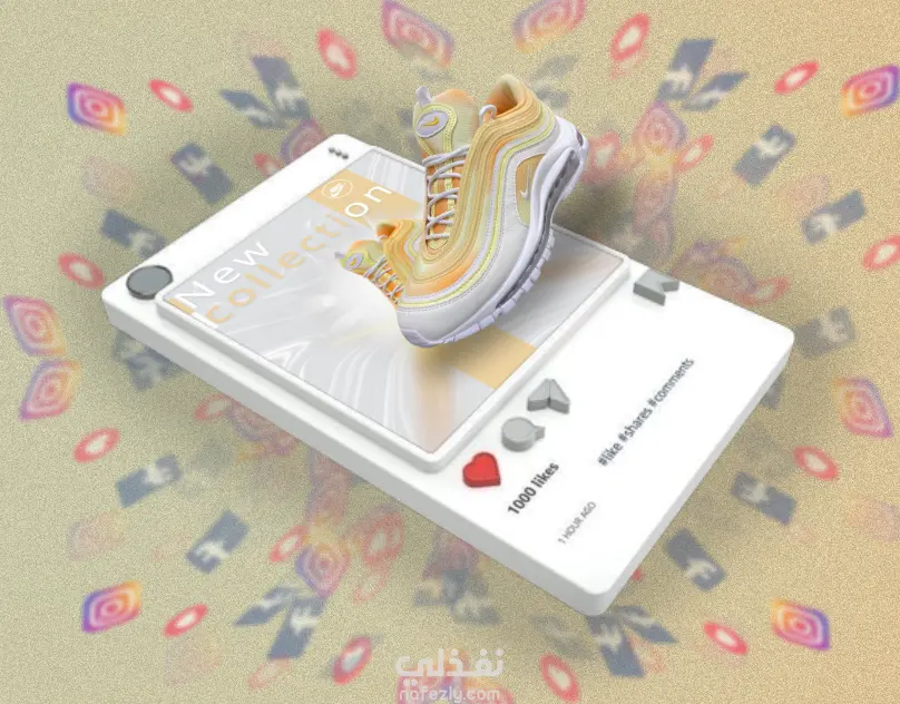 في هذا العمل تم إبراز الحذاء بأسلوب يُظهر التفاصيل والملمس بدقة، مع دمج عناصر تصميمية احترافية مثل الإضاءة الناعمة والتدرجات اللونية، إضافة إلى صياغة نصوص بسيطة تُعزز هوية العلامة.