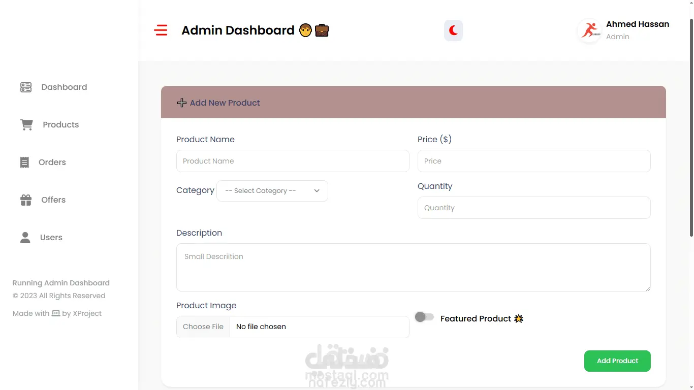 Dynamic dashboard statistics, including total products, orders, admins, users, and offers.