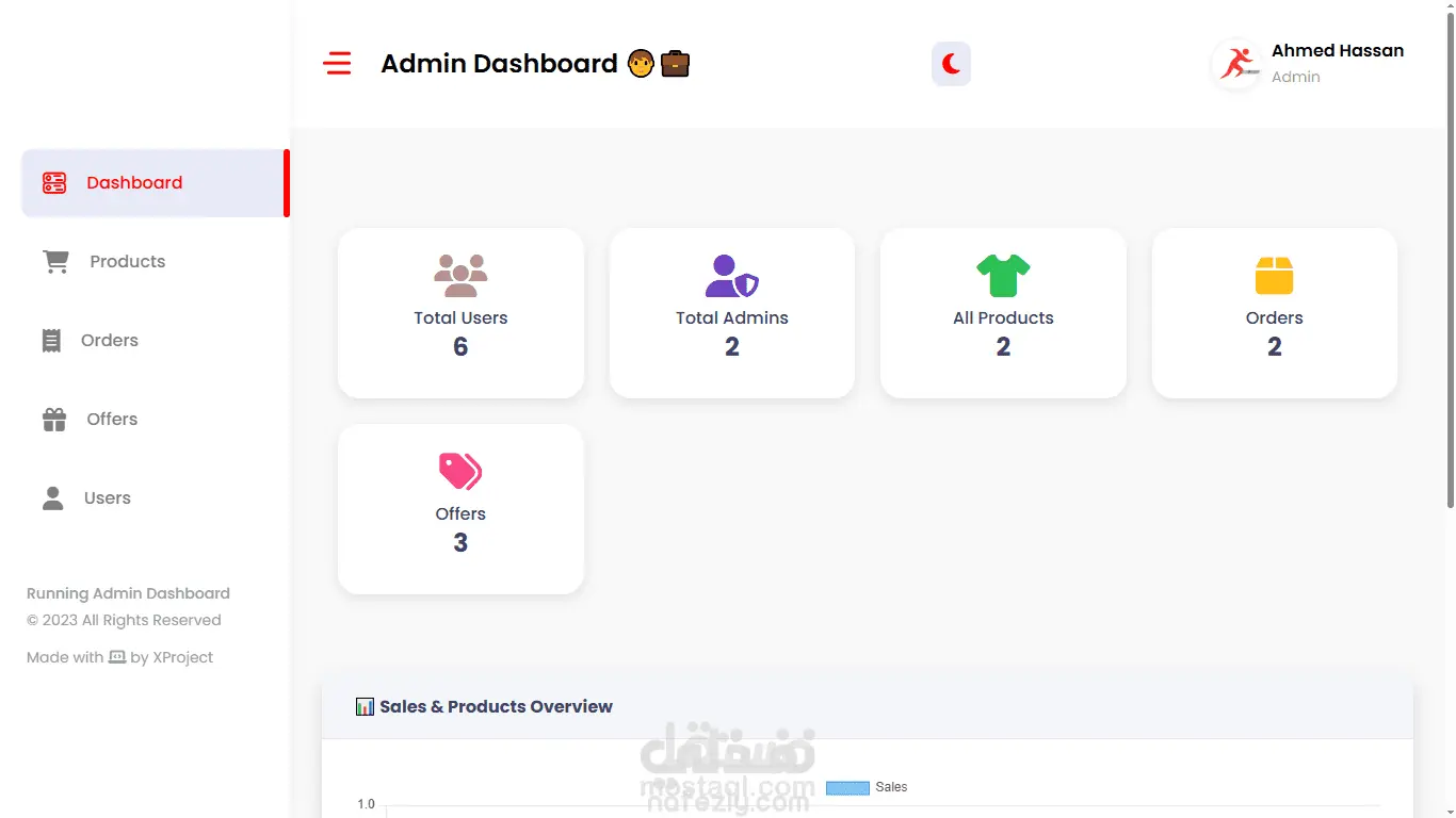 إحصائيات ديناميكية داخل لوحة التحكم تشمل عدد المنتجات، الطلبات، المستخدمين، الإداريين، والعروض.