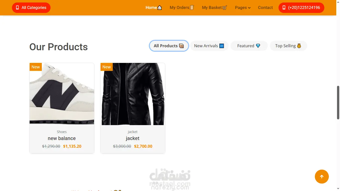 واجهة مستخدم سهلة واحترافية لعرض المنتجات مع التصنيفات، العروض الخاصة، تفاصيل المنتج، وعربة التسوق.