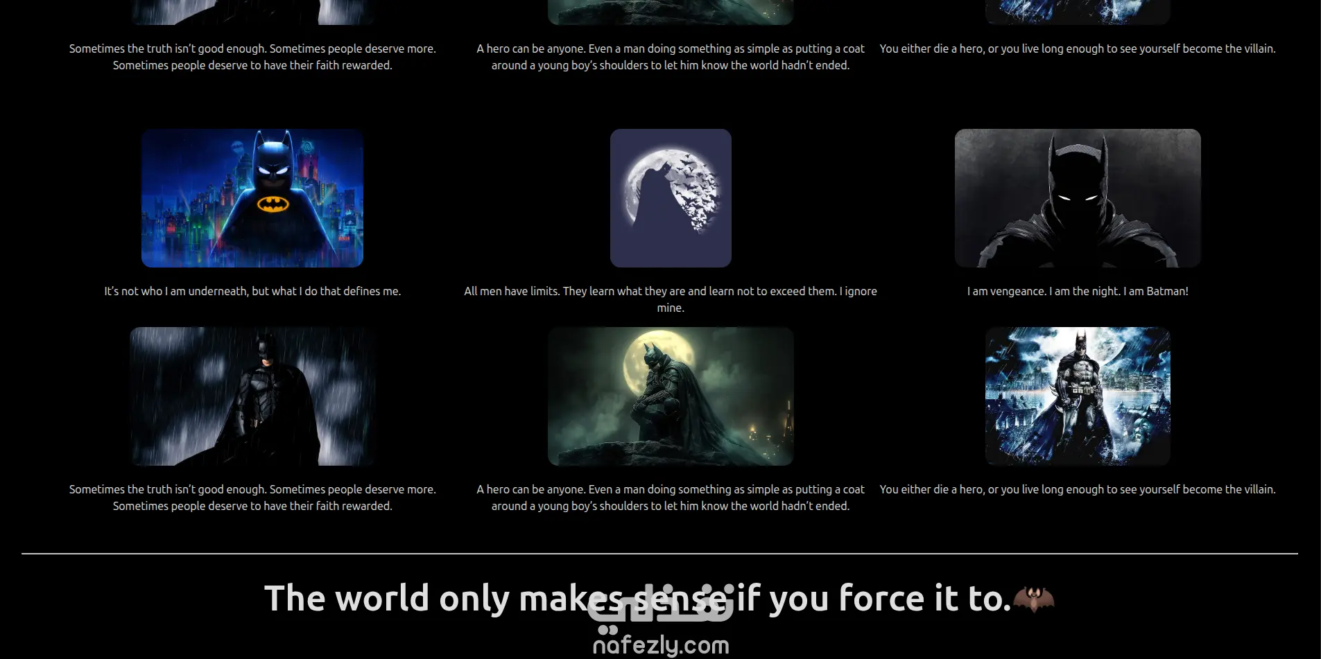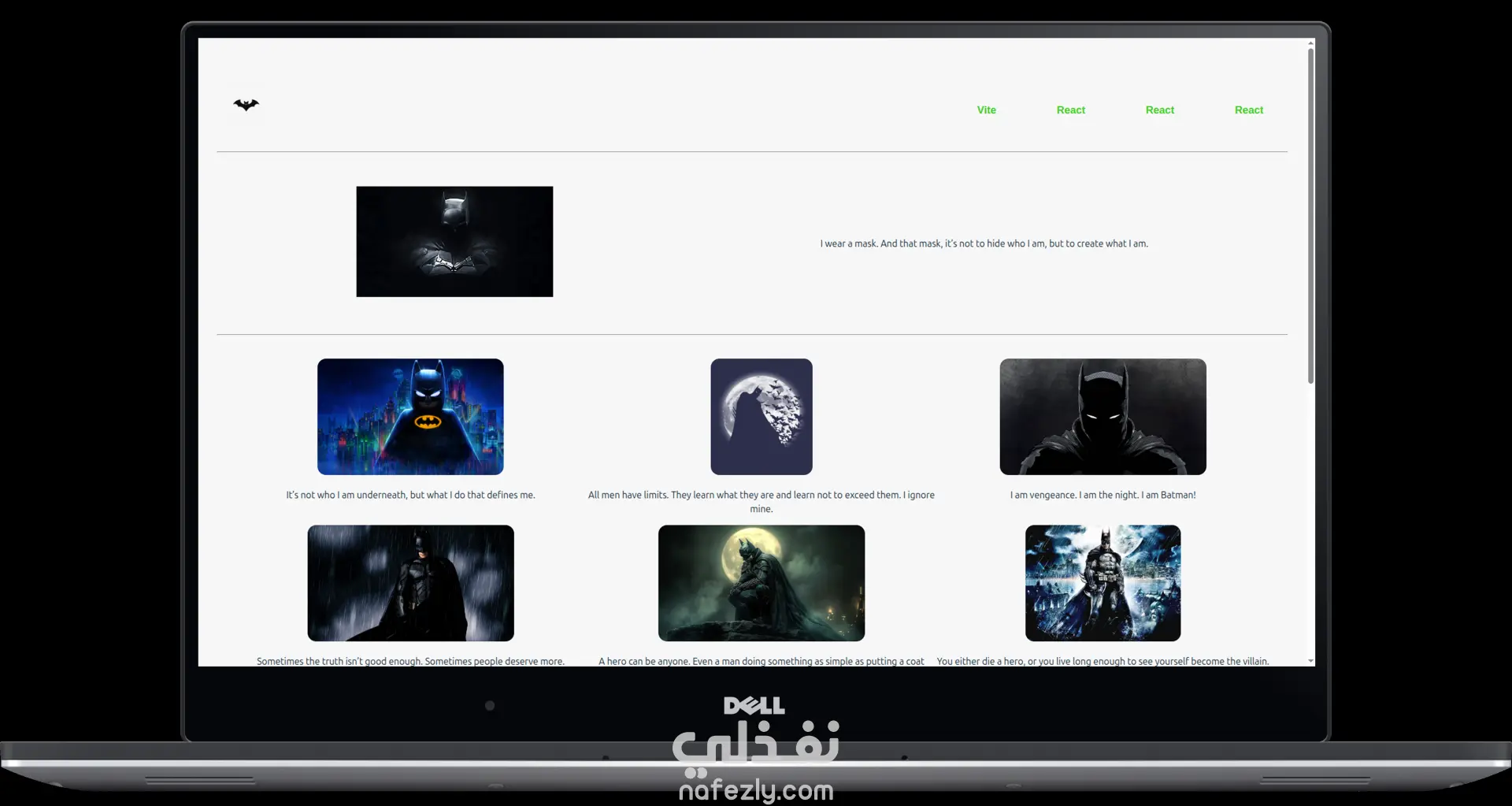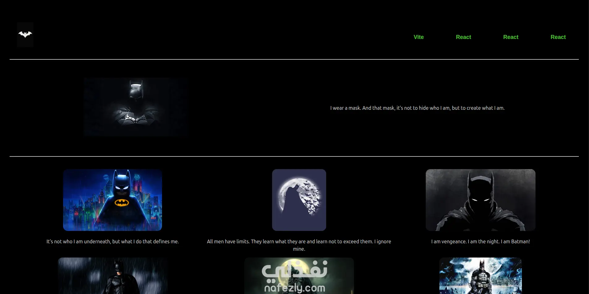 يعرض التطبيق معلومات عن أفلام وشخصيات باتمان بطريقة تفاعلية، من خلال استخدام المكوّنات (Components) و الخصائص (Props) و إدارة الحالة (State Management) لعرض محتوى ديناميكي.