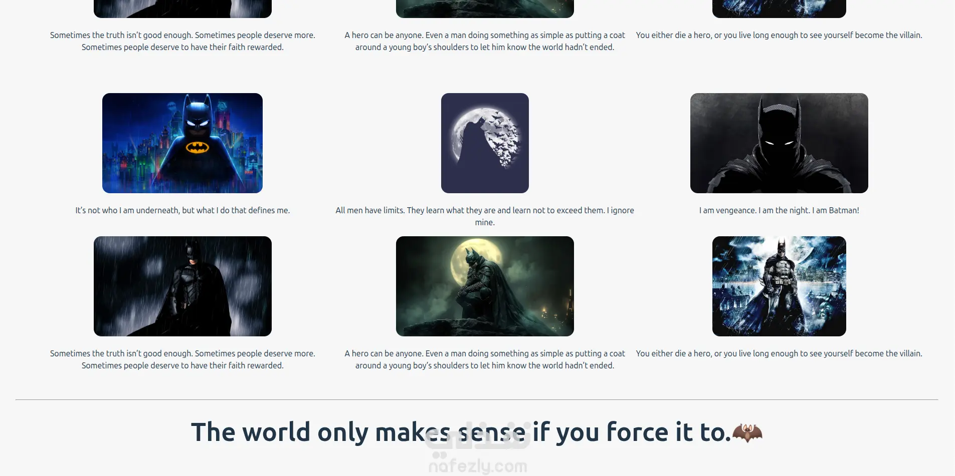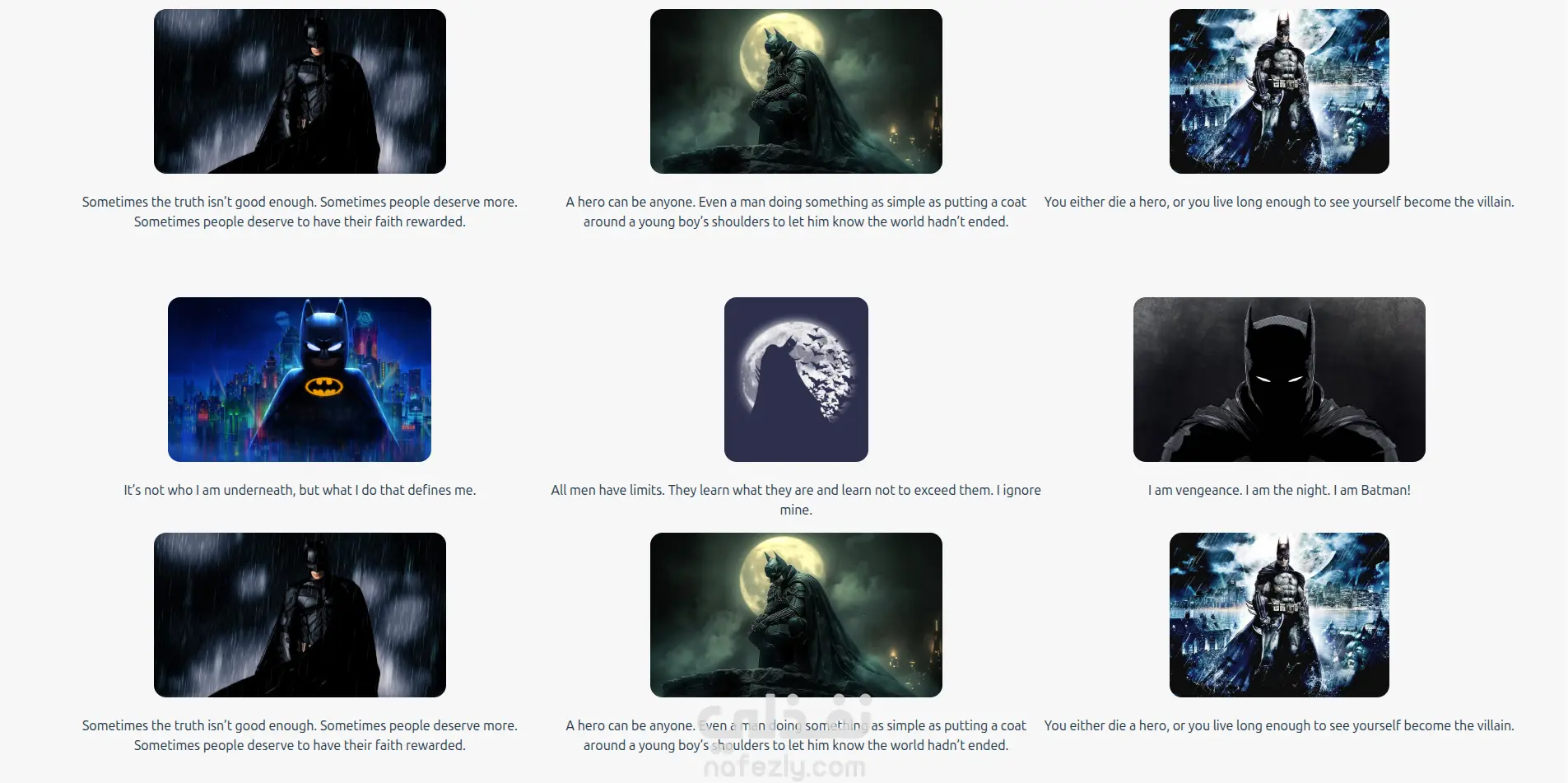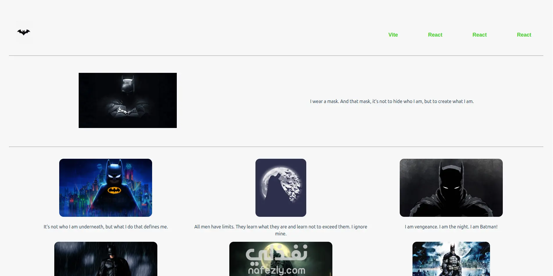 يعرض التطبيق معلومات عن أفلام وشخصيات باتمان بطريقة تفاعلية، من خلال استخدام المكوّنات (Components) و الخصائص (Props) و إدارة الحالة (State Management) لعرض محتوى ديناميكي.