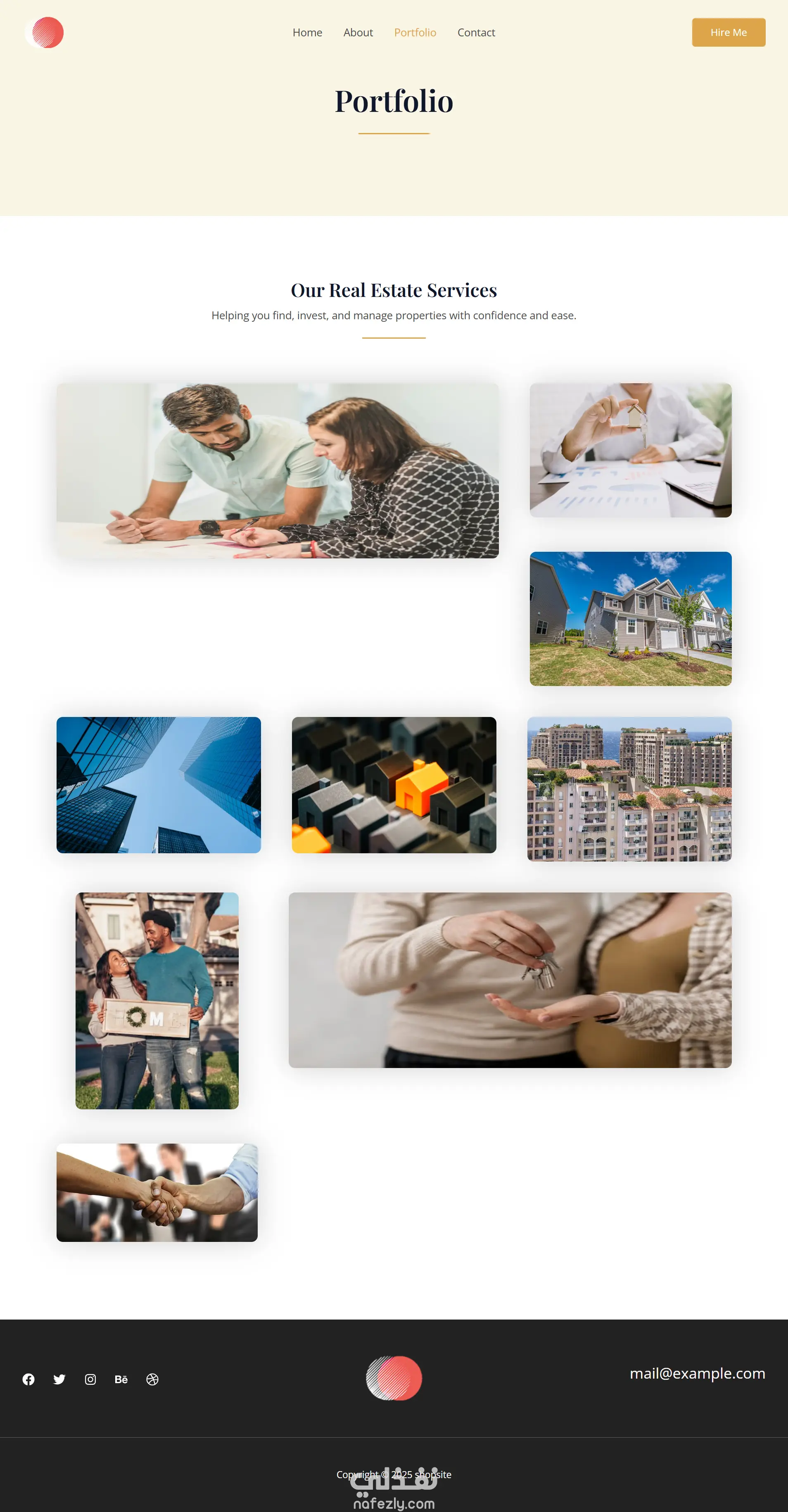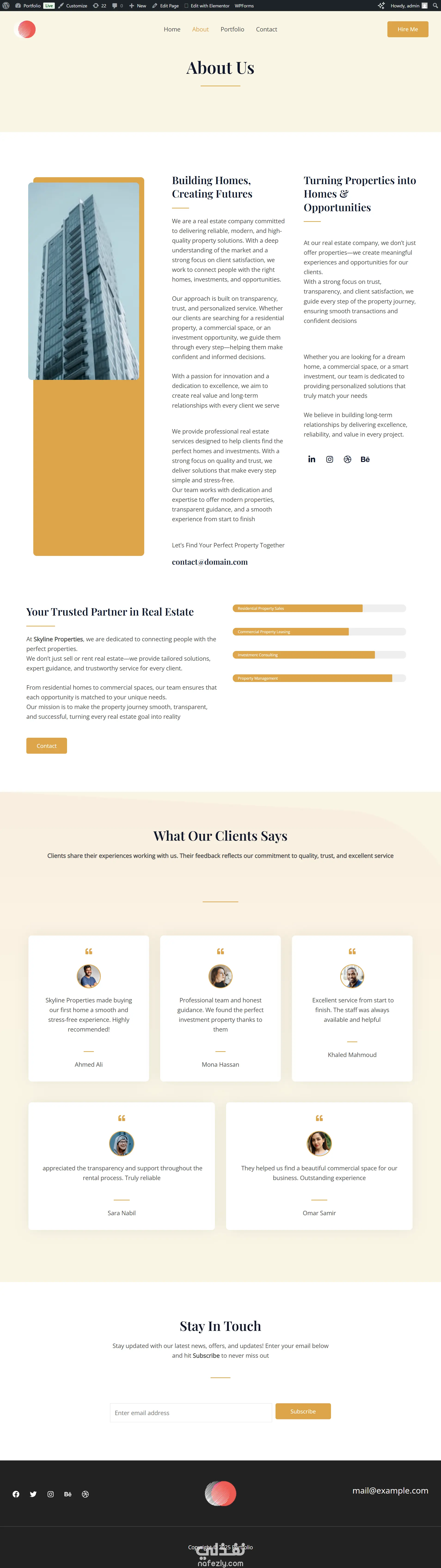قمت بتصميم بورتفوليو متكامل يتكوّن من صفحات Home, About Us, Profile, و Contact، بهدف عرض الهوية الرقمية بطريقة احترافية ومنظّمة. اهتميت بتقديم واجهة حديثة وسهلة الاستخدام، مع توزيع واضح للأقسام يسهّل على الزائر التعرّف على الخدمات والمعلومات الأساسية بسرعة. التصميم متجاوب بالكامل ويعكس مظهرًا بصريًا نظيفًا يناسب الشركات والمشاريع العقارية.