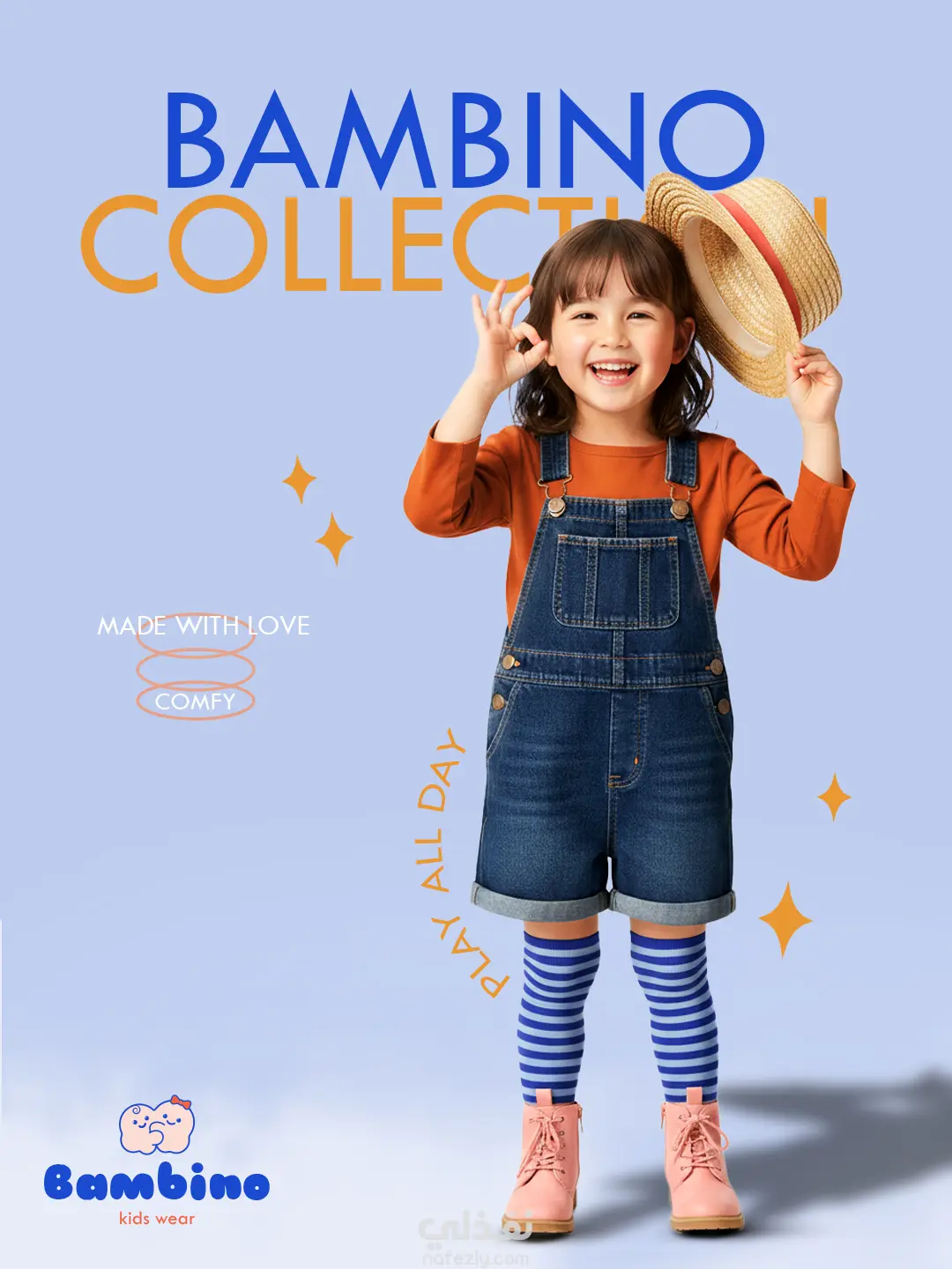 تصميم إعلان سوشيال ميديا لبراند ملابس الأطفال Bambino Kids Wear، بيعتمد على ستايل playful & comfy علشان يوصل رسالة البساطة والراحة اللي بتميز البراند. التصميم بيعرض موديل طفلة بستايل لطيف ومبهج بملابس كاجوال مريحة، مع توزيع عناصر بصريّة خفيفة زي النجوم والدوائر لإضافة روح مرحة. استخدمت درجات الأزرق والبرتقالي كألوان أساسية للهوية، وده عمل توازن بصري جذاب وملفت. العنوان الرئيسي “BAMBINO COLLECTION” معمول بخط عصري وواضح، مع عبارة جانبية “Play All Day” اللي بتعبر عن فكرة إن اللبس مريح للأطفال طول اليوم. كمان تم إدراج عناصر نصية بسيطة زي “Made With Love – Comfy” لتعزيز إحساس الجودة والاهتمام. التصميم مناسب للإعلانات على منصات التواصل الاجتماعي، وبيعكس هوية البراند بشكل لطيف وبريء ويتماشى مع جمهور الأطفال.