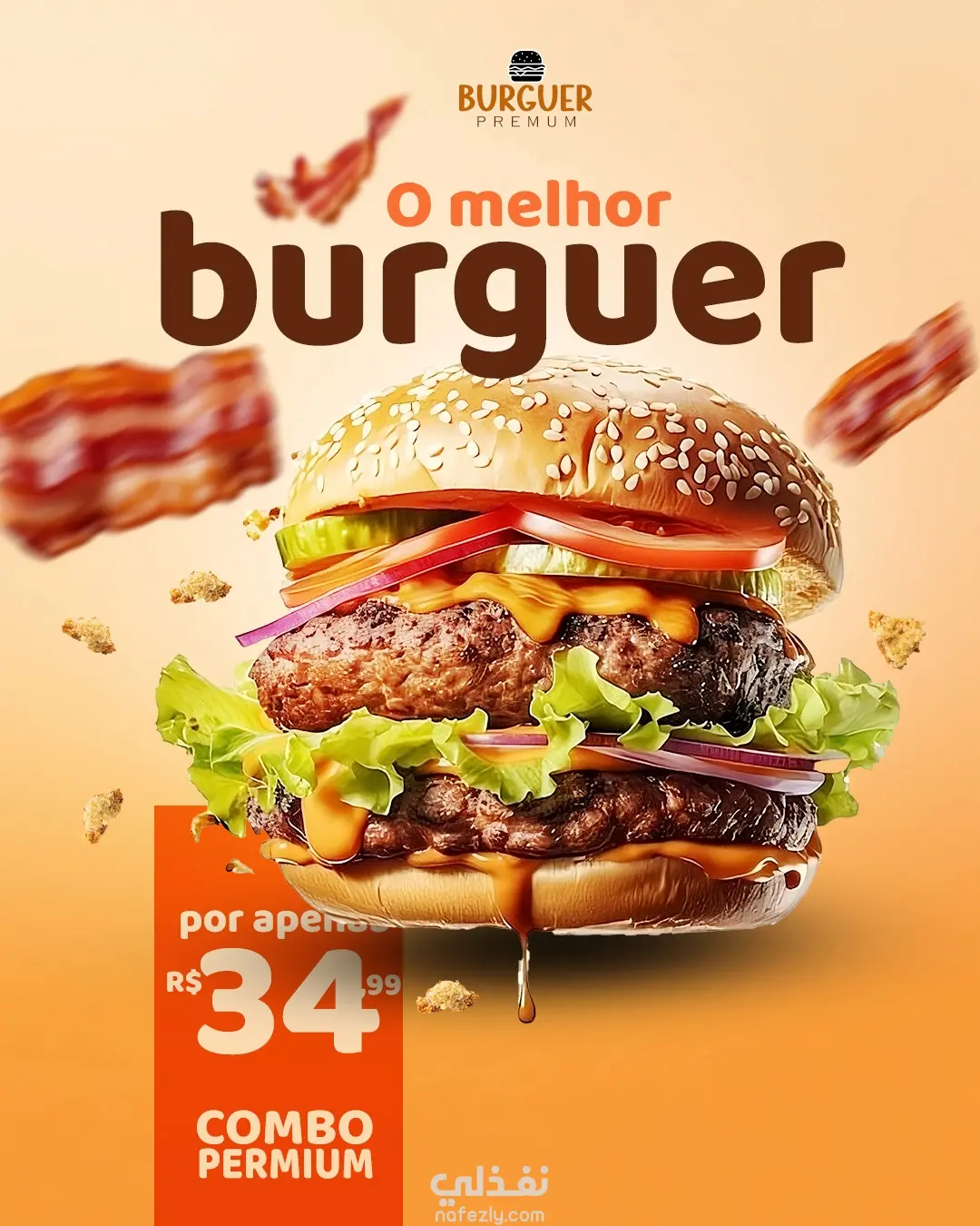 تصميم إعلان سوشيال ميديا لبراند الأطعمة Burger Premium، بيعتمد على ستايل جذاب ومشهي يبرز شكل البرجر بشكل واقعي ومغري. تم استخدام صورة برجر عالية الجودة بمكوّنات واضحة وتفاصيل لذيذة زي الصوص السايح، طبقات الخضار الطازجة، والخبز بالسمسم لإبراز فخامة المنتج. العنوان الرئيسي “O melhor burguer” معمول بخط عريض وواضح علشان يجذب انتباه المشاهد مباشرة، مع خلفية بلون برتقالي دافئ يعزز الإحساس بالشهية. كمان تم إضافة عناصر طايرة زي قطع البيكون والكرانش علشان تدّي إحساس ديناميكي وحيوي للتصميم. السعر واضح داخل بوكس لوني قوي لإبراز عرض Combo Premium بشكل يخلي العميل ياخد قرار الشراء بسرعة. التصميم مناسب للإعلانات على إنستغرام وفيسبوك وبيعكس جودة البراند بطريقة احترافية وجذابة.