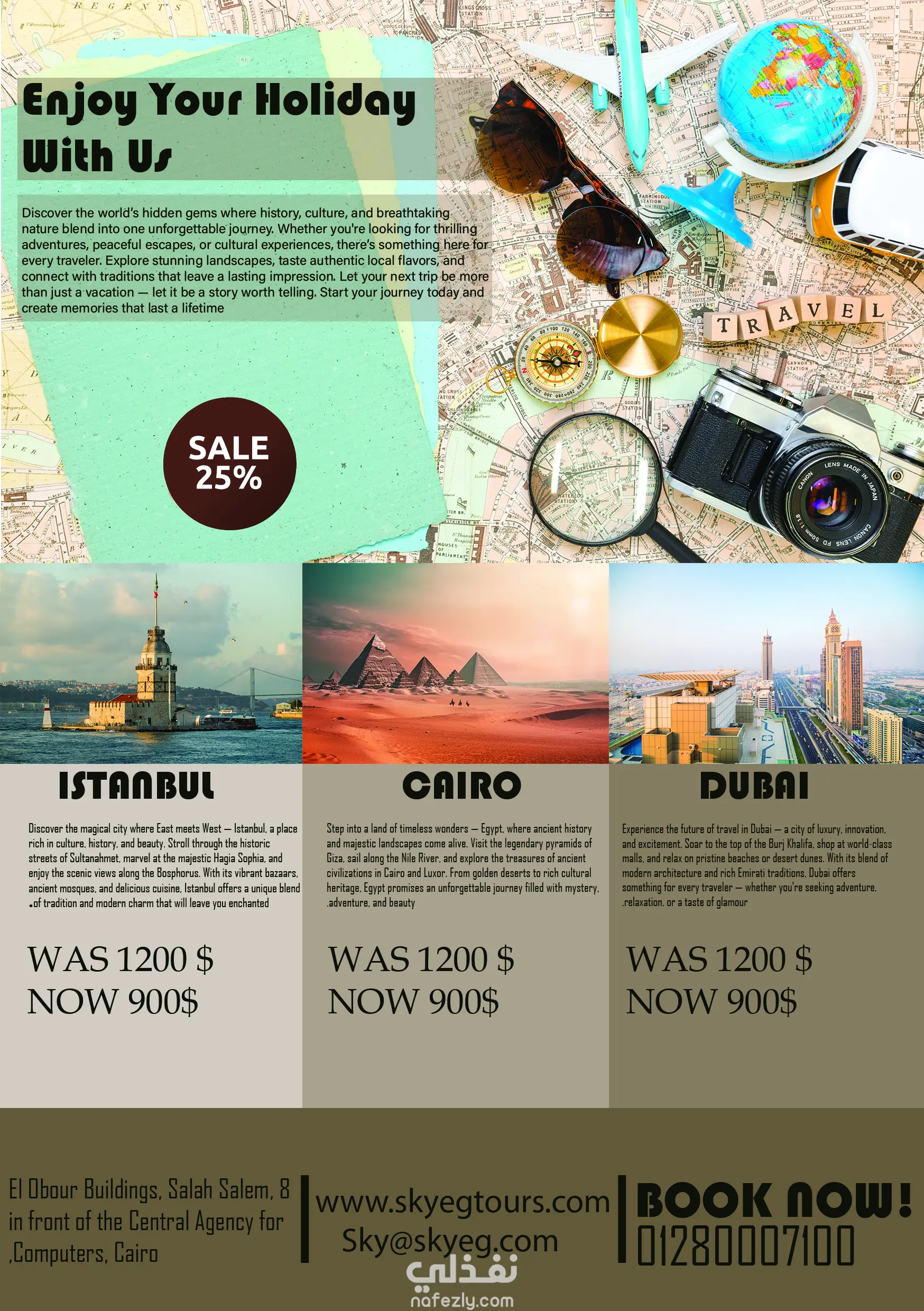 قمت بتنفيذ إعلان ترويجي متكامل لشركة سياحية بهدف جذب عملاء جدد وزيادة الحجوزات خلال الموسم. ركّزت في تصميم الإعلان على إبراز الوجهات السياحية بطريقة جذابة، مع استخدام عناصر بصرية واضحة وألوان مريحة تعكس روح السفر والمتعة. دوري في العمل تطوير الفكرة الأساسية للإعلان كتابة النص الترويجي (Copy) تصميم العناصر البصرية اختيار الصور والمشاهد المناسبة للوجهات السياحية تنسيق الإعلان ليتناسب مع منصات التواصل الاجتماعي