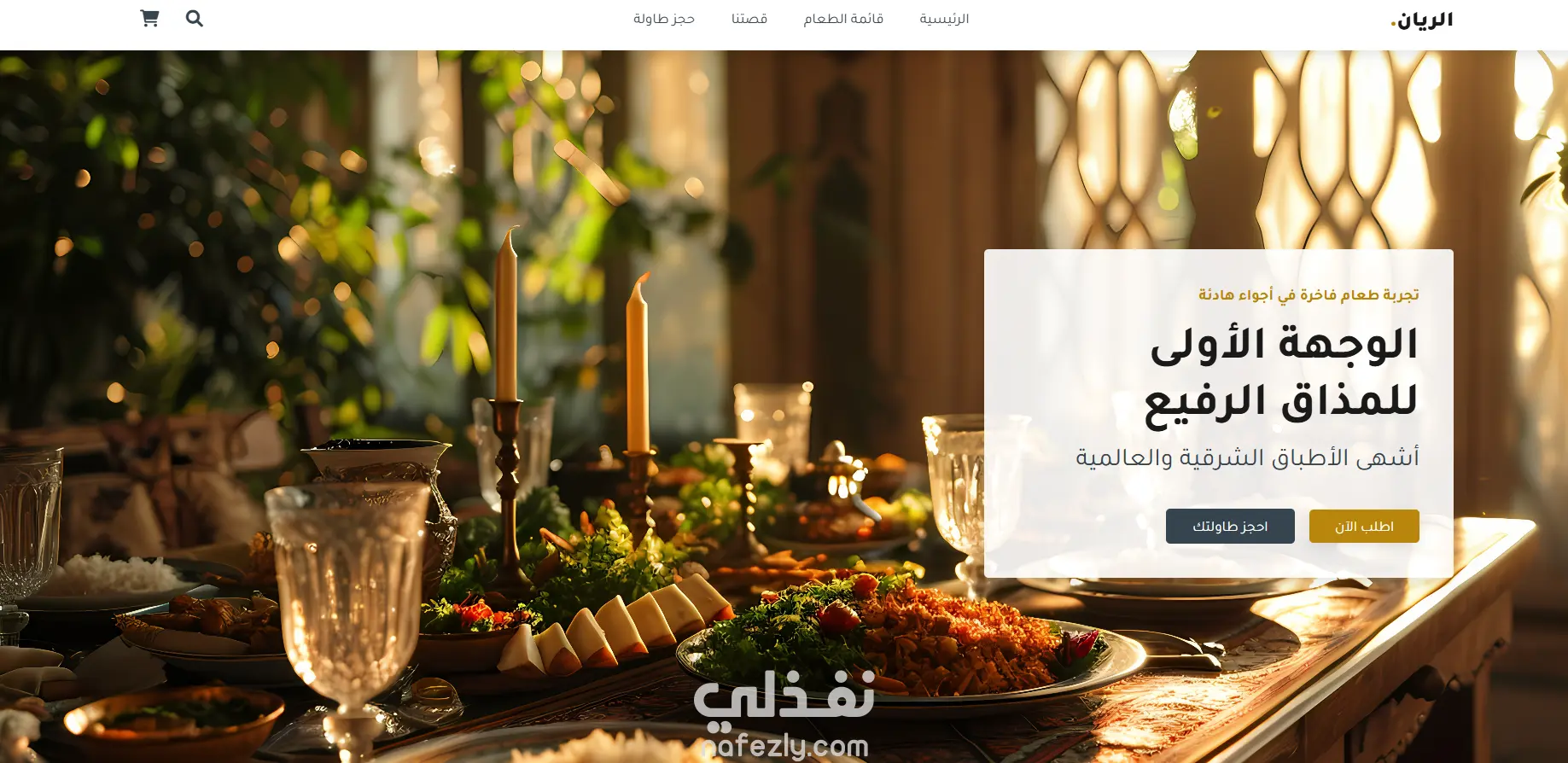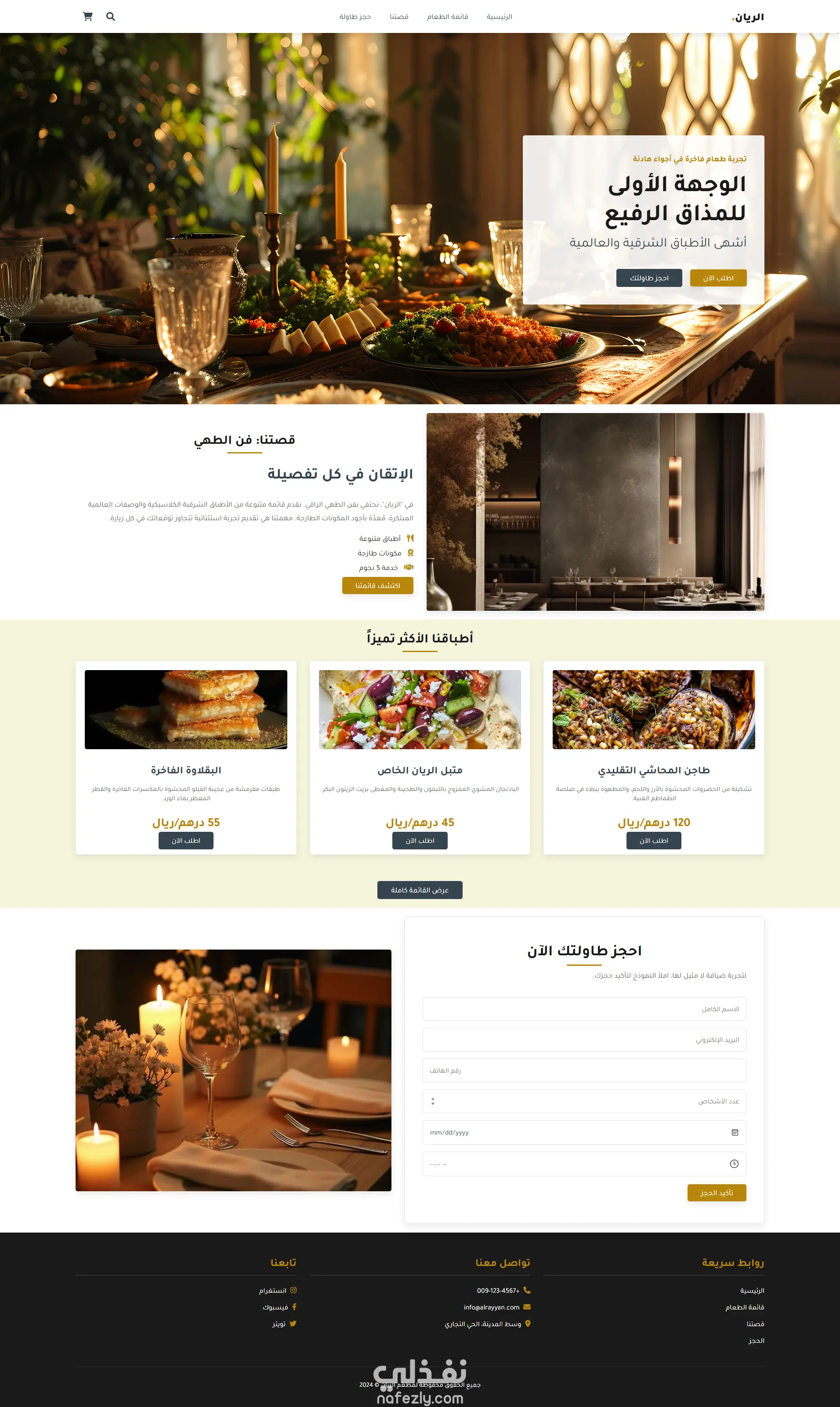 تم تطوير هذه الصفحة كصفحة هبوط تعريفية احترافية لمطعم عربي فاخر باسم "الريان"، بهدف تعزيز الهوية البصرية الراقية للمطعم وزيادة معدلات حجز الطاولات وطلب الوجبات.