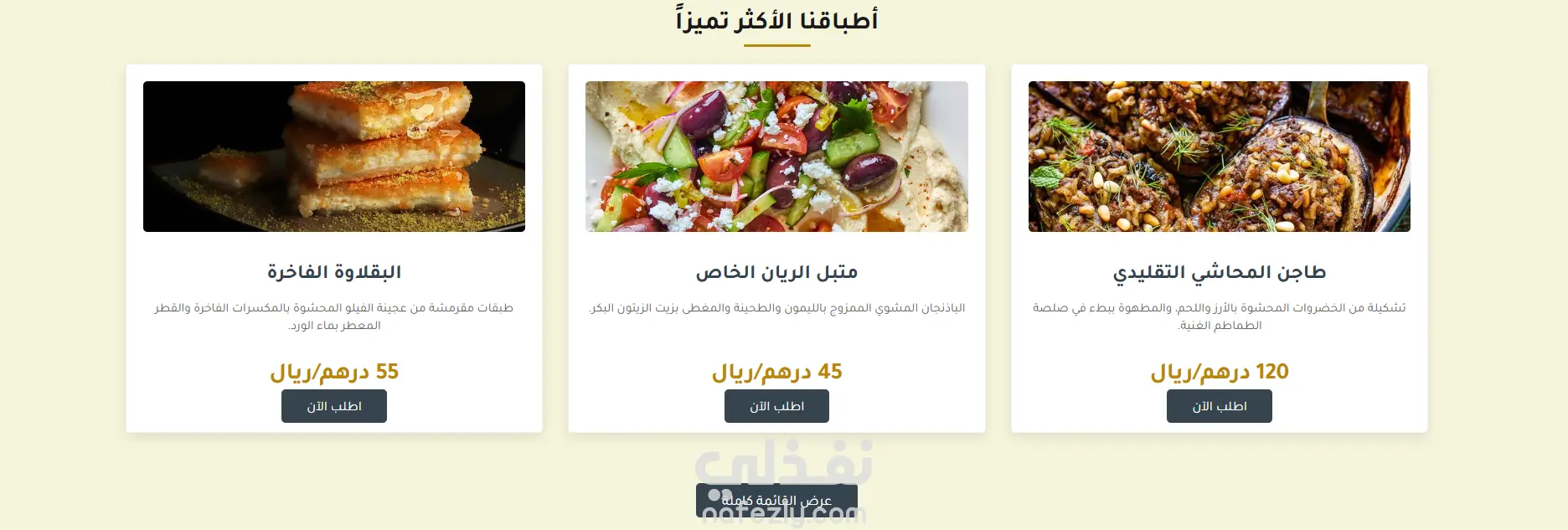 _قائمة الطعام (Highlights): عرض لأبرز الأطباق الرئيسية والمقبلات والحلويات.