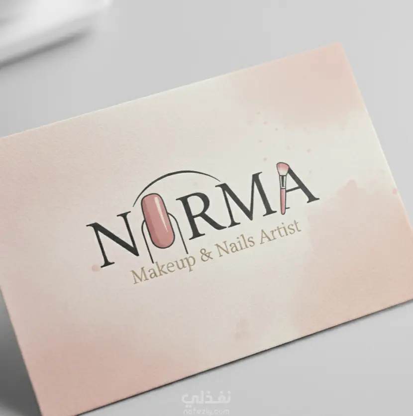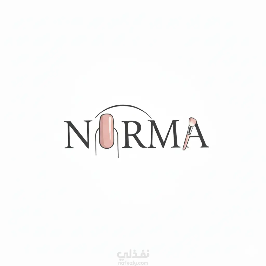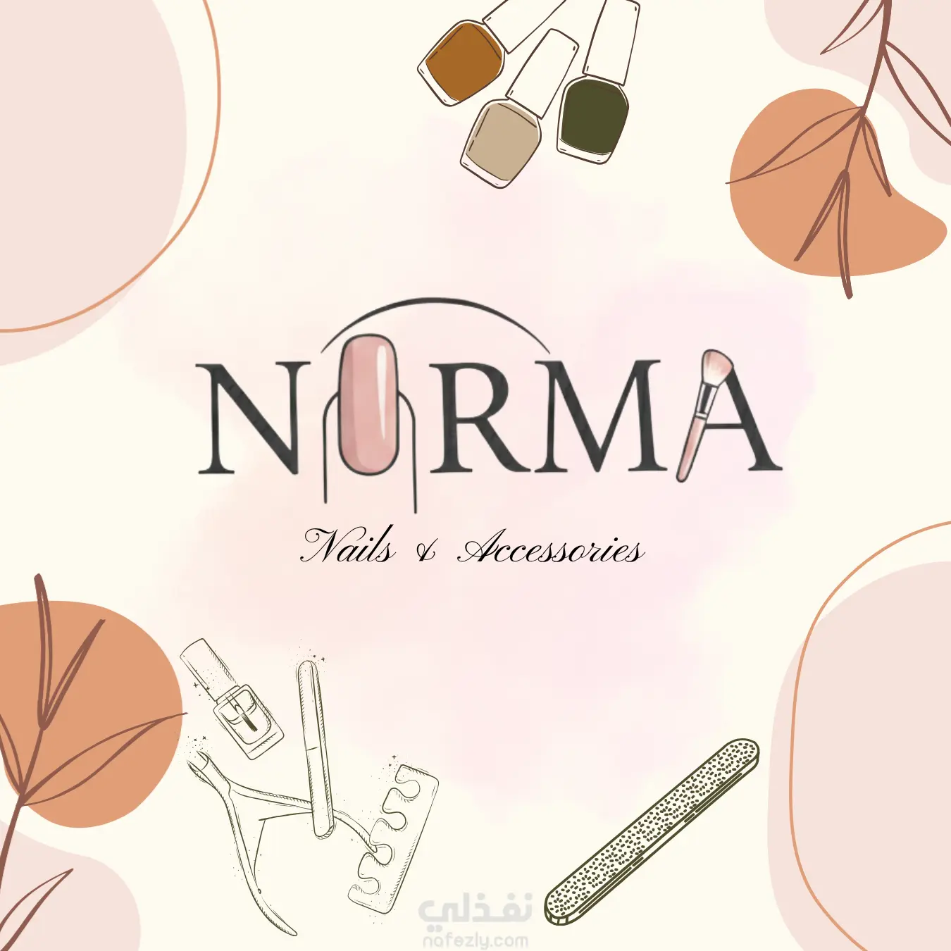 - **اسم العلامة "NORMA"** مكتوب بخط واضح وجريء، مع لمسة فنية في حرف "O" الذي تم تحويله إلى شكل ظفر مطلي باللون الوردي، مما يربط مباشرة بمجال العناية بالأظافر.