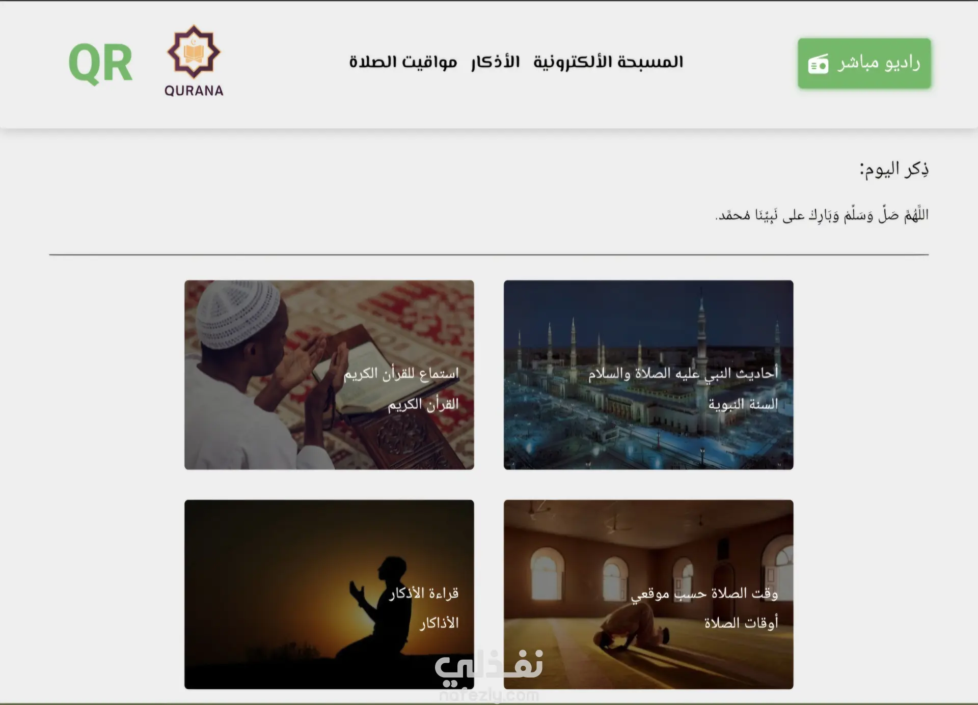 موقع Qurana أقسام الموقع: -القرأن الكريم كامل (قراءة وأستماع) -أوقات الصلاة (في جميع محافظات مصر) -أحاديث نبوية شريفة -أذكار (ذكر بيتحدث كل دقيقة بذكر أخر) -أذكار (الصباح والمساء،أذكار الصلاة) -سبحة إلكترونية -بث راديو للقرأن الكريم (لأكثر من محطة و قارئ)