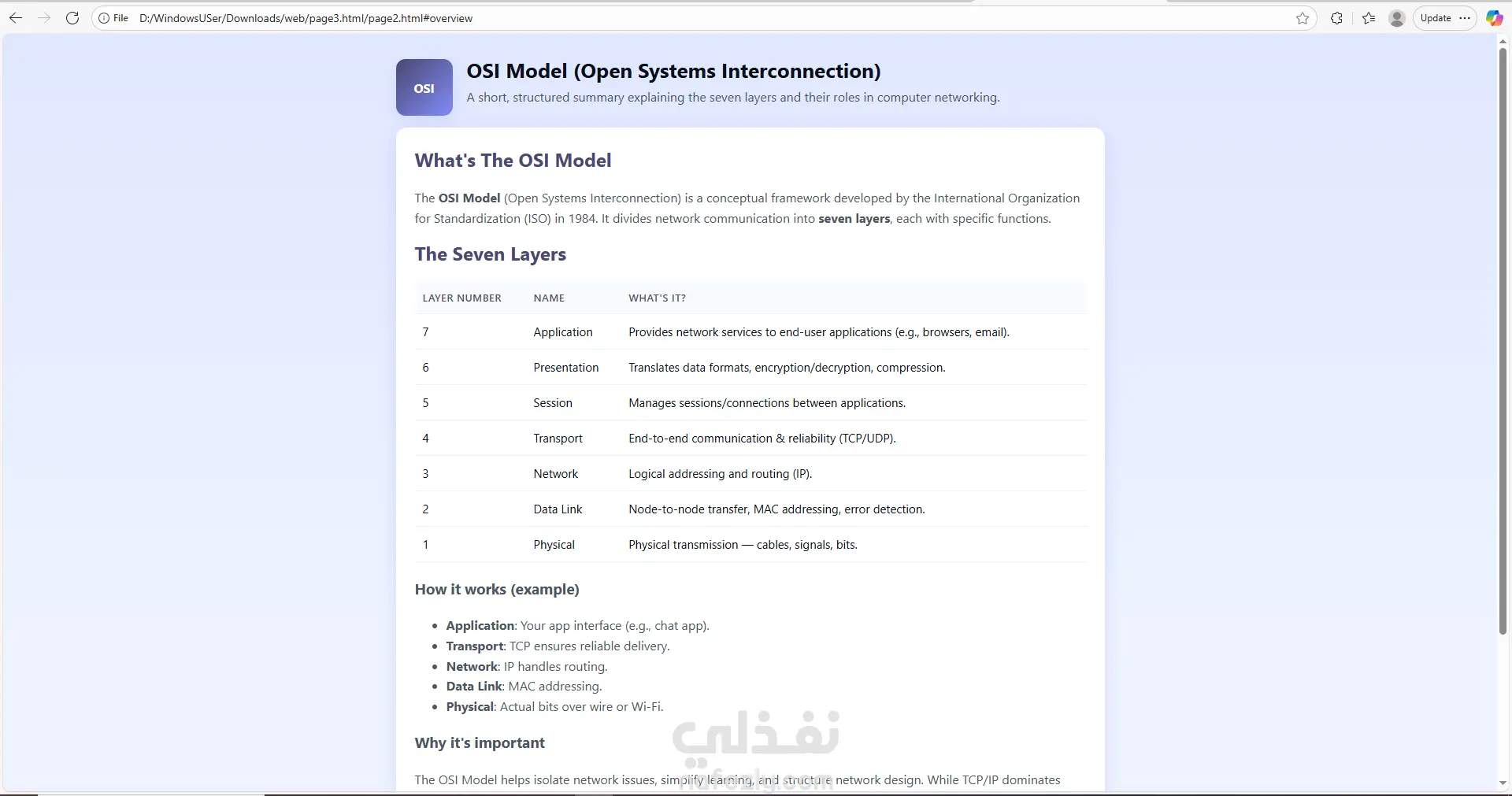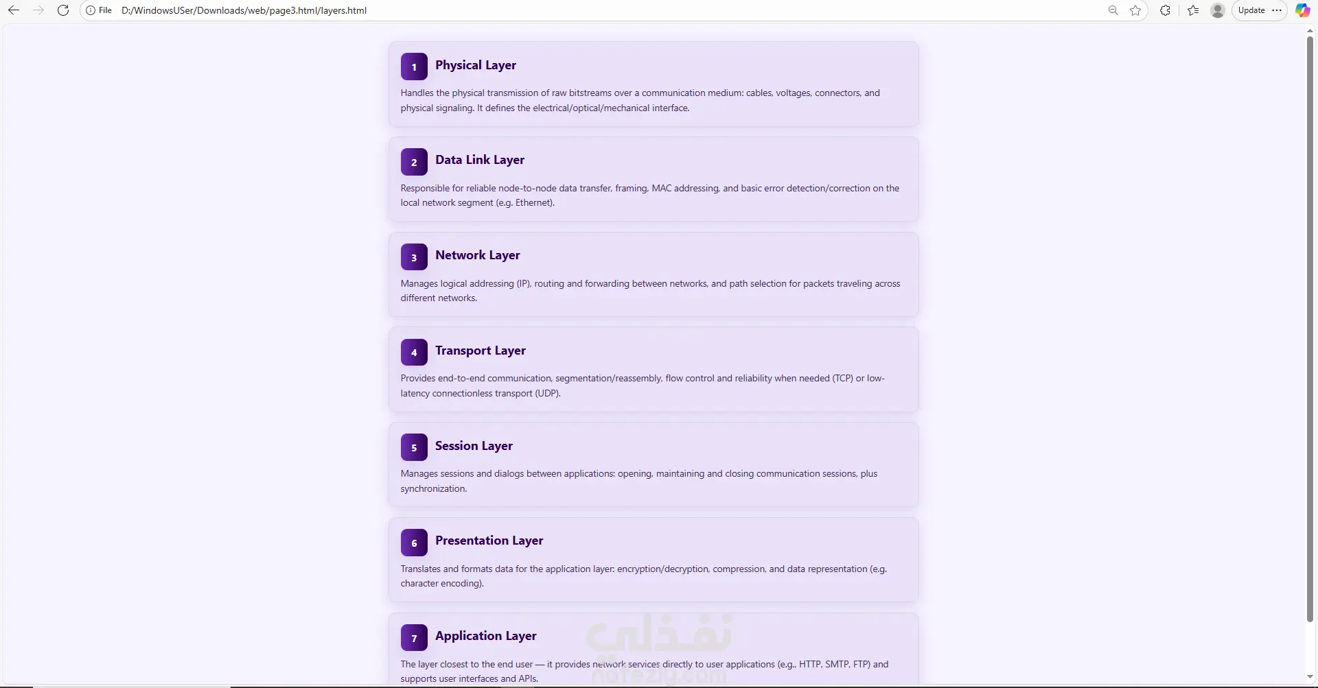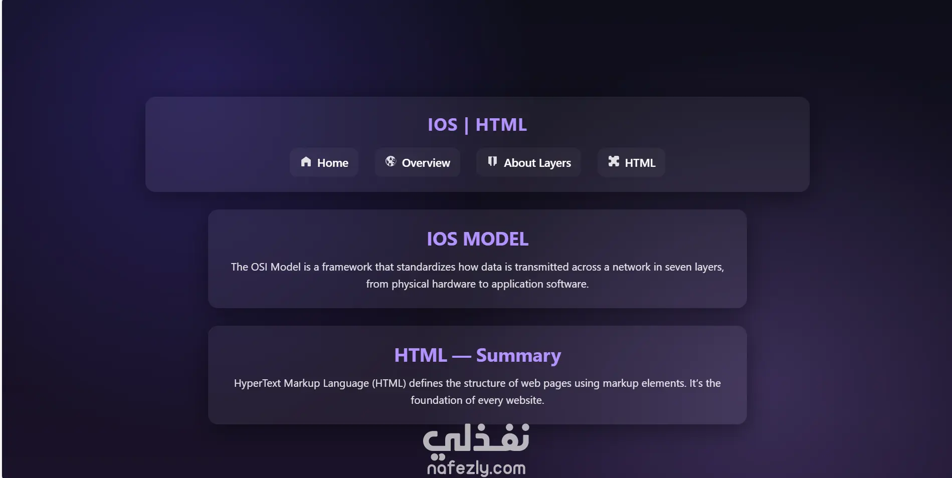 قمت بتطوير موقع تعليمي تفاعلي مصمّم لتقديم أساسيات الويب وشبكات الحاسب بطريقة مبسّطة ومنظمة. يعتمد الموقع على واجهة أمامية (Front-End Only) مع تجربة مستخدم سلسة وسهلة التصفّح. يتكوّن الموقع من ثلاثة أجزاء رئيسية: 1️⃣ قسم تعليمي لأساسيات HTML يتضمن شرحًا مبسّطًا وواضحًا لأهم عناصر لغة HTML مع أمثلة عملية، بحيث يساعد المستخدمين المبتدئين على فهم البنية الأساسية لصفحات الويب. 2️⃣ قسم خاص بشرح نموذج الشبكات OSI Model يشمل تقسيم الطبقات السبعة، وظيفتها، وأمثلة للاستخدام، مع تقديم المحتوى بطريقة بصرية وسهلة الاستيعاب. 3️⃣ كويز تفاعلي لاختبار مهارات HTML اختبار بسيط يساعد المتعلم على تقييم فهمه من خلال مجموعة أسئلة مباشرة مع عرض النتيجة فورًا.