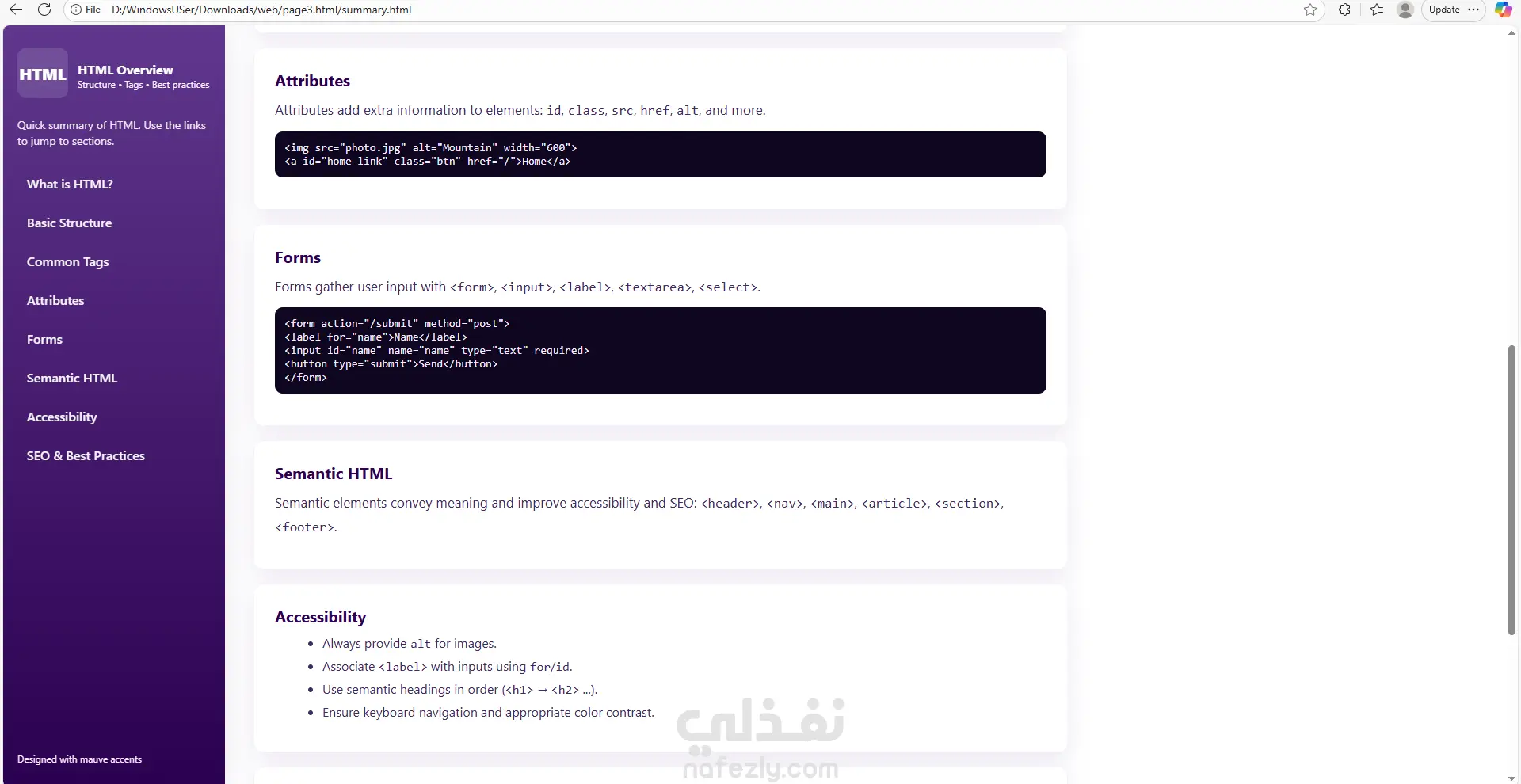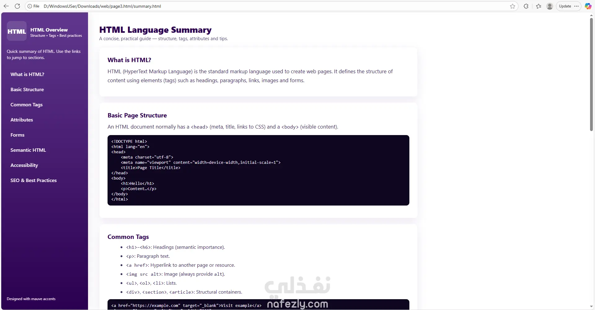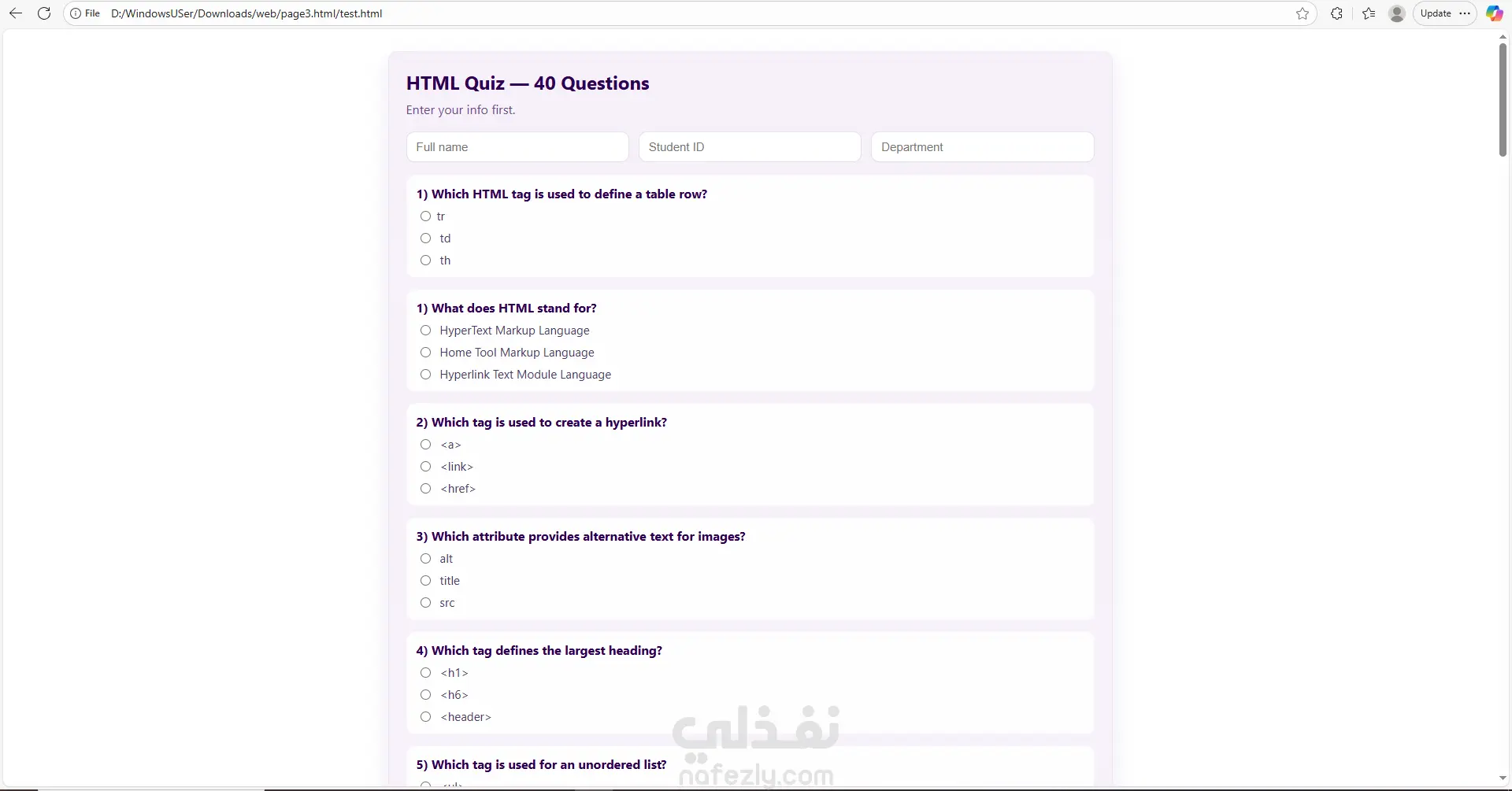قمت بتطوير موقع تعليمي تفاعلي مصمّم لتقديم أساسيات الويب وشبكات الحاسب بطريقة مبسّطة ومنظمة. يعتمد الموقع على واجهة أمامية (Front-End Only) مع تجربة مستخدم سلسة وسهلة التصفّح. يتكوّن الموقع من ثلاثة أجزاء رئيسية: 1️⃣ قسم تعليمي لأساسيات HTML يتضمن شرحًا مبسّطًا وواضحًا لأهم عناصر لغة HTML مع أمثلة عملية، بحيث يساعد المستخدمين المبتدئين على فهم البنية الأساسية لصفحات الويب. 2️⃣ قسم خاص بشرح نموذج الشبكات OSI Model يشمل تقسيم الطبقات السبعة، وظيفتها، وأمثلة للاستخدام، مع تقديم المحتوى بطريقة بصرية وسهلة الاستيعاب. 3️⃣ كويز تفاعلي لاختبار مهارات HTML اختبار بسيط يساعد المتعلم على تقييم فهمه من خلال مجموعة أسئلة مباشرة مع عرض النتيجة فورًا.