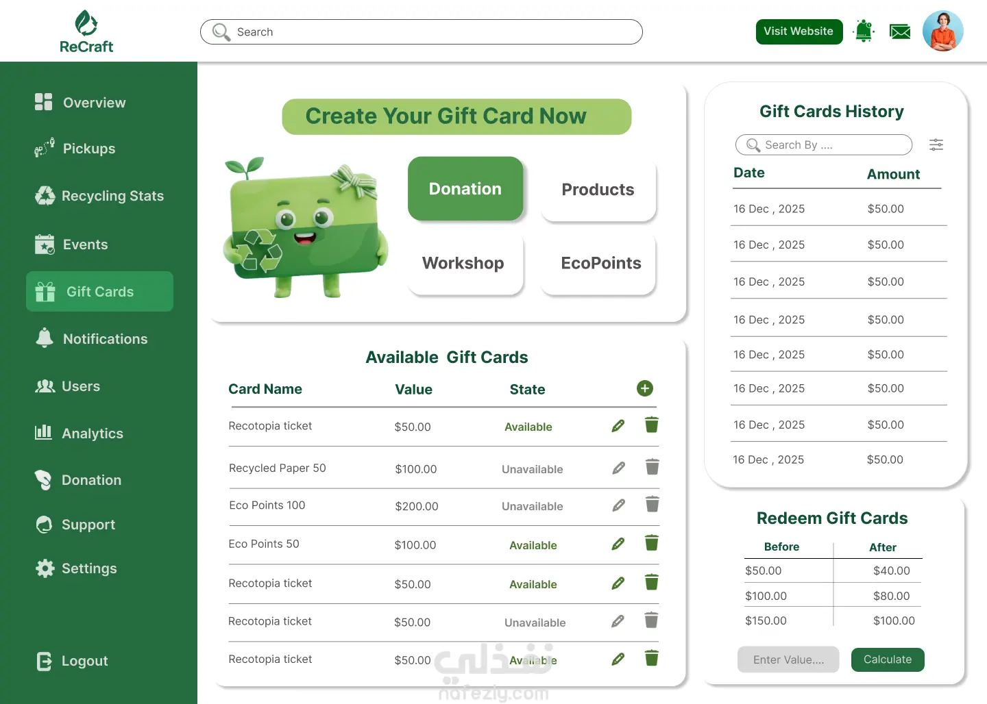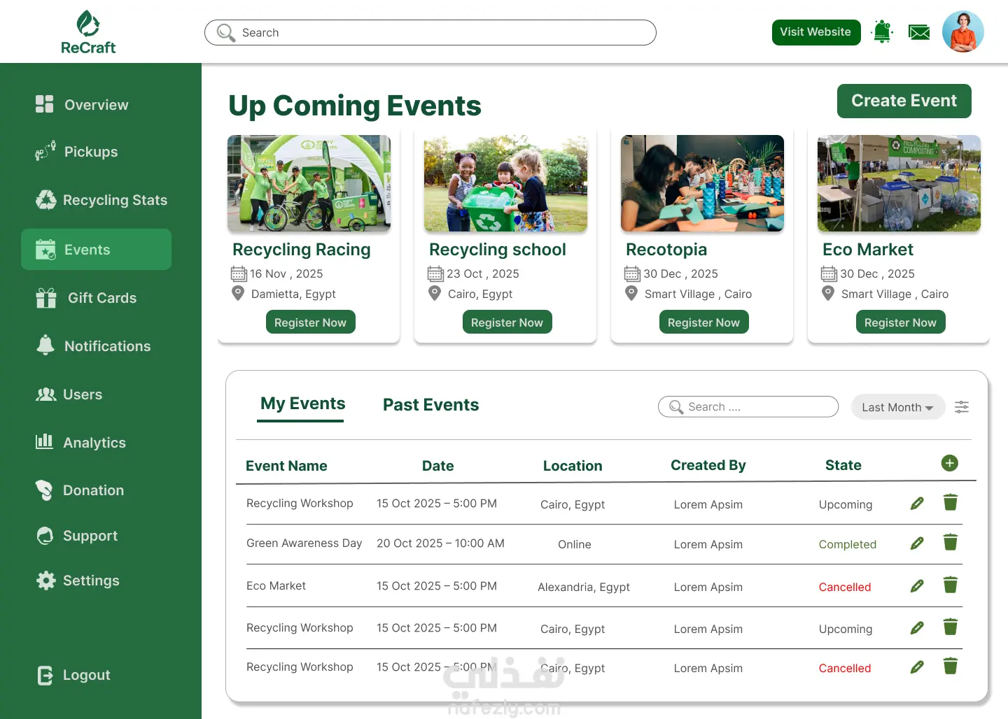 تصميم واجهة Dashboard لموقع إعادة التدوير – ReCraft
