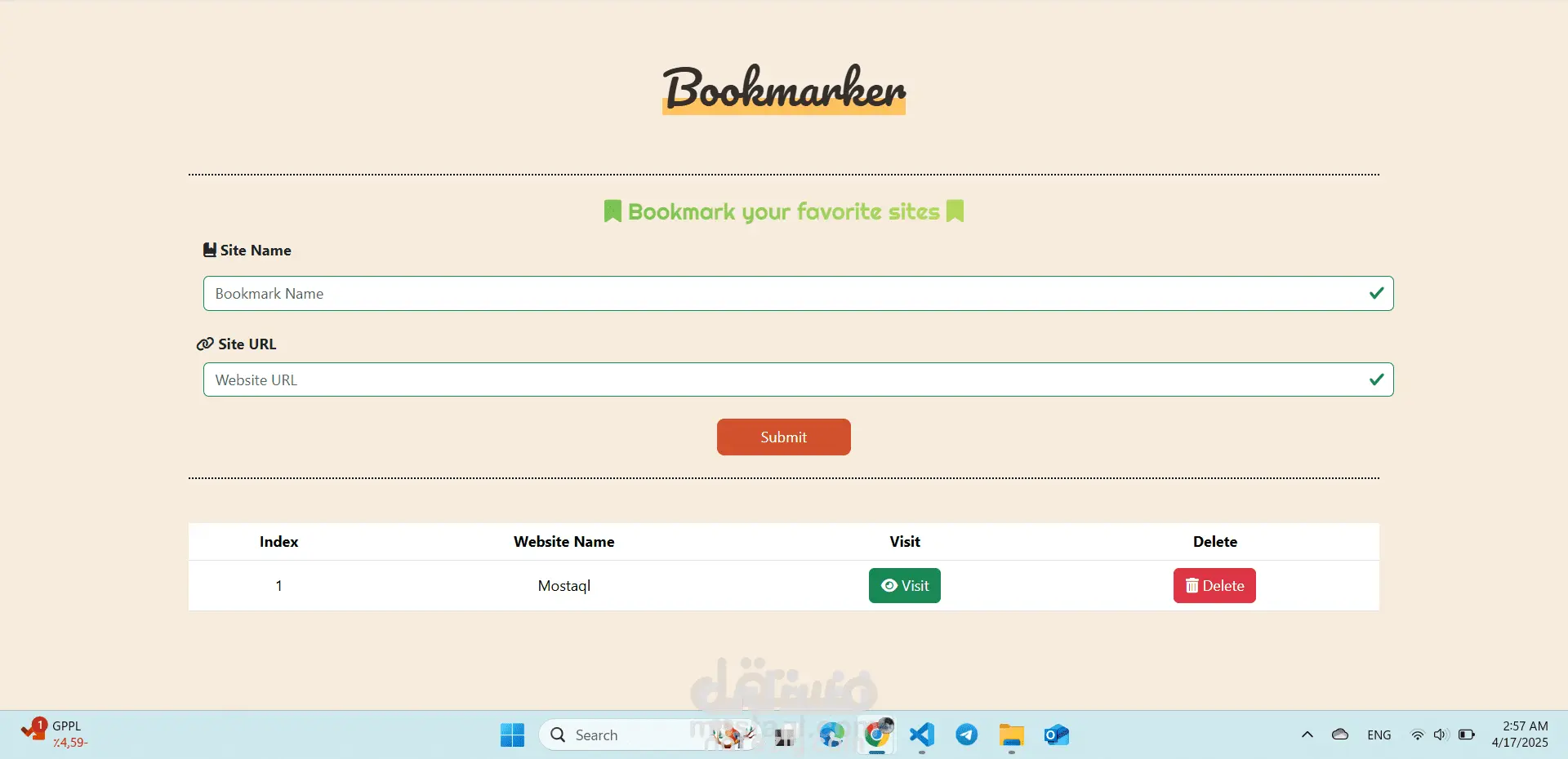 تطبيق ويب بسيط وفعّال لحفظ وإدارة الروابط المفضلة. يمكنك من خلاله إضافة روابط مواقع بسهولة، عرضها، أو حذفها، مع حفظ البيانات في متصفح المستخدم باستخدام LocalStorage دون الحاجة إلى خادم خارجي. التطبيق مصمم باستخدام HTML و CSS و JS