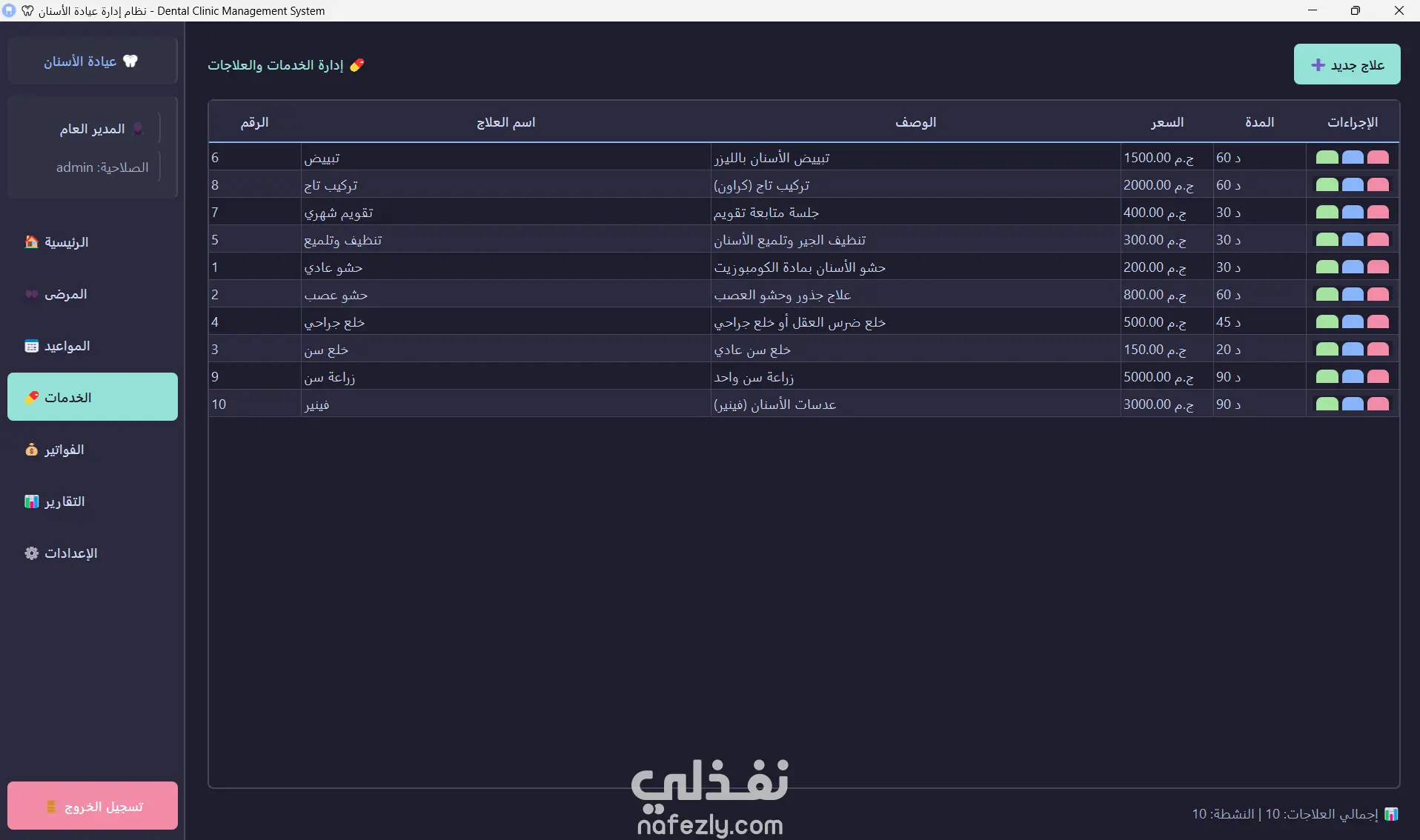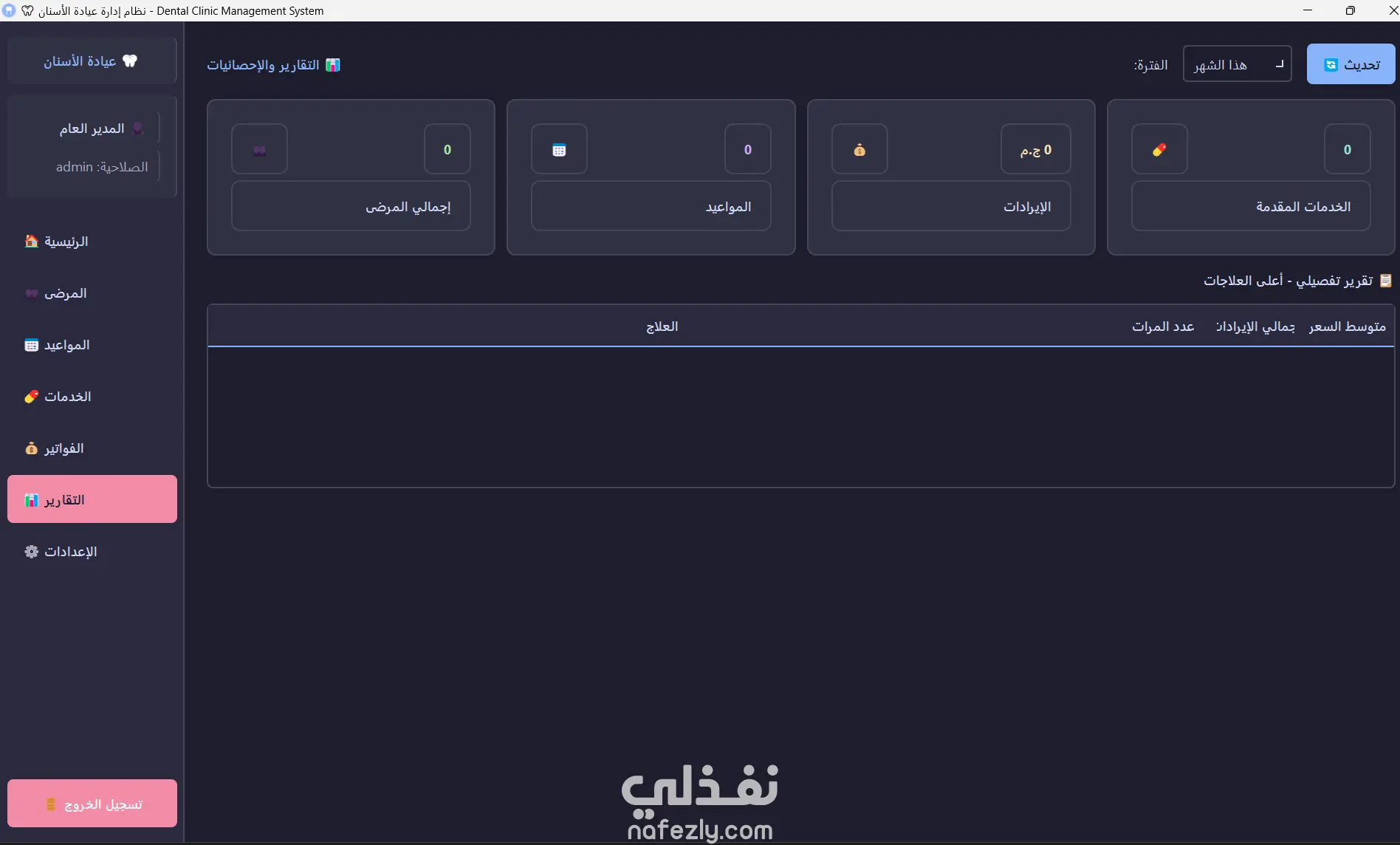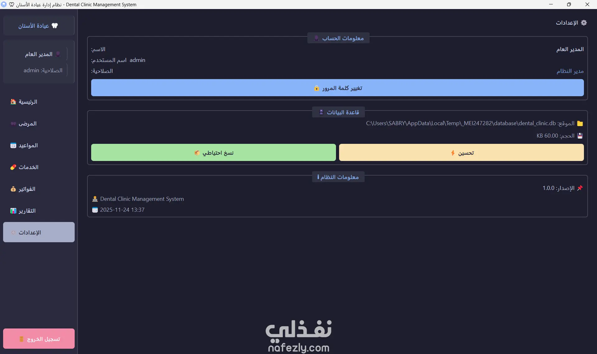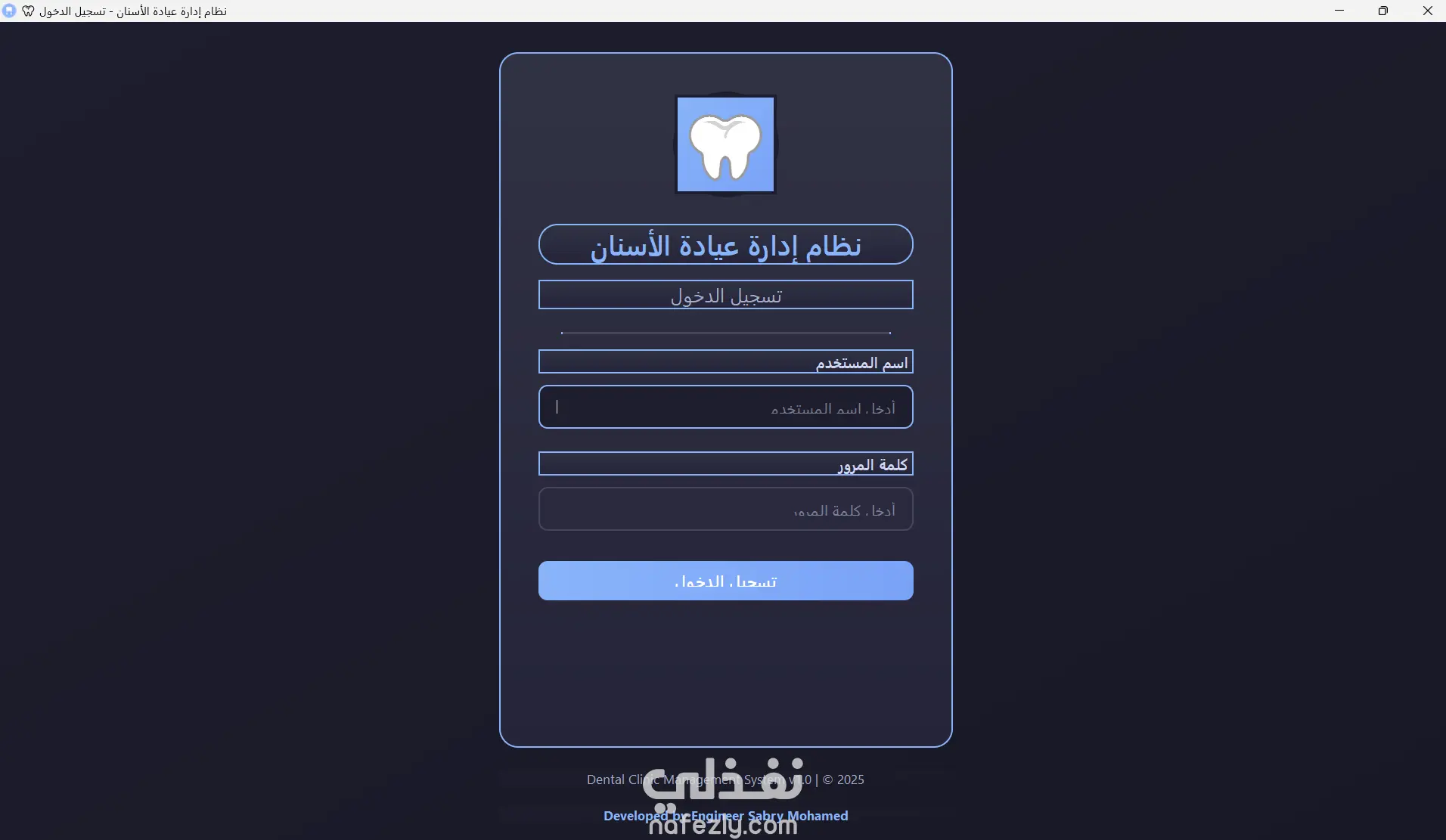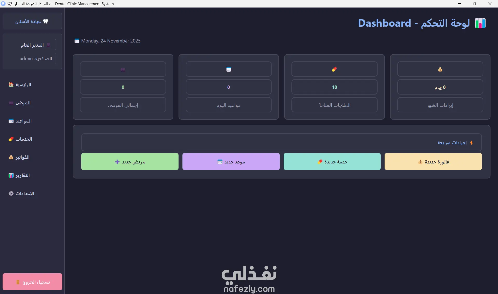 📋 نظرة عامة | Overview نظام إدارة عيادة الأسنان هو تطبيق سطح مكتب شامل مصمم لتبسيط عمليات عيادات الأسنان. مبني بـ Python و PyQt5 مع واجهة داكنة حديثة ودعم كامل للغة العربية. Dental Clinic Management System is a comprehensive desktop application designed to streamline dental clinic operations. Built with Python and PyQt5, featuring a modern dark theme with full Arabic language support. ✨ المميزات | Features 👥 إدارة المرضى | Patient Management إضافة وتعديل وحذف سجلات المرضى البحث بالاسم أو رقم الهاتف تتبع التاريخ الطبي سجلات العلاج 📅 جدولة المواعيد | Appointment Scheduling عرض تقويم تفاعلي إدارة الوقت تتبع الحالة (مجدول، مكتمل، ملغي) إشعارات المرضى 💊 إدارة الخدمات | Services Management 10 علاجات أسنان محملة مسبقاً إعدادات السعر والمدة إضافة خدمات مخصصة تتبع شعبية الخدمة 💳 نظام الفواتير | Billing System طرق دفع متعددة (نقدي، بطاقة ائتمان، تأمين، تحويل بنكي) إنشاء الفواتير سجل الدفع تصفية حسب التاريخ 📊 التقارير والتحليلات | Reports & Analytics تقارير يومية/أسبوعية/شهرية/سنوية إحصائيات الإيرادات تحليل أفضل العلاجات بيانات قابلة للتصدير ⚙️ الإعدادات | Settings إدارة كلمة المرور نسخ احتياطي واستعادة قاعدة البيانات تحسين النظام إدارة المستخدمين 🎯 لوحة المعلومات | Dashboard إحصائيات في الوقت الفعلي مخططات ورسوم بيانية المواعيد القادمة نظرة عامة على الإيرادات