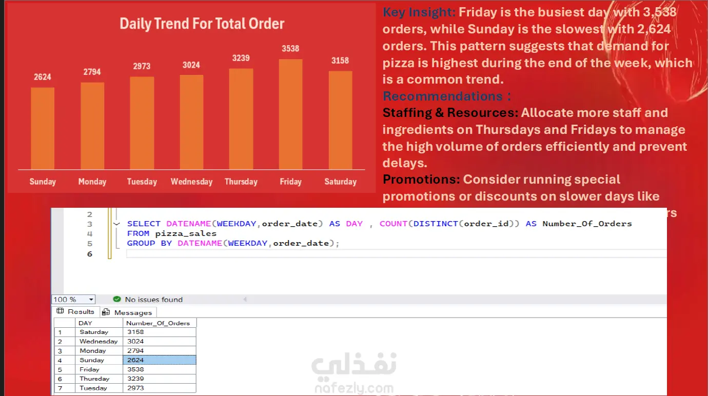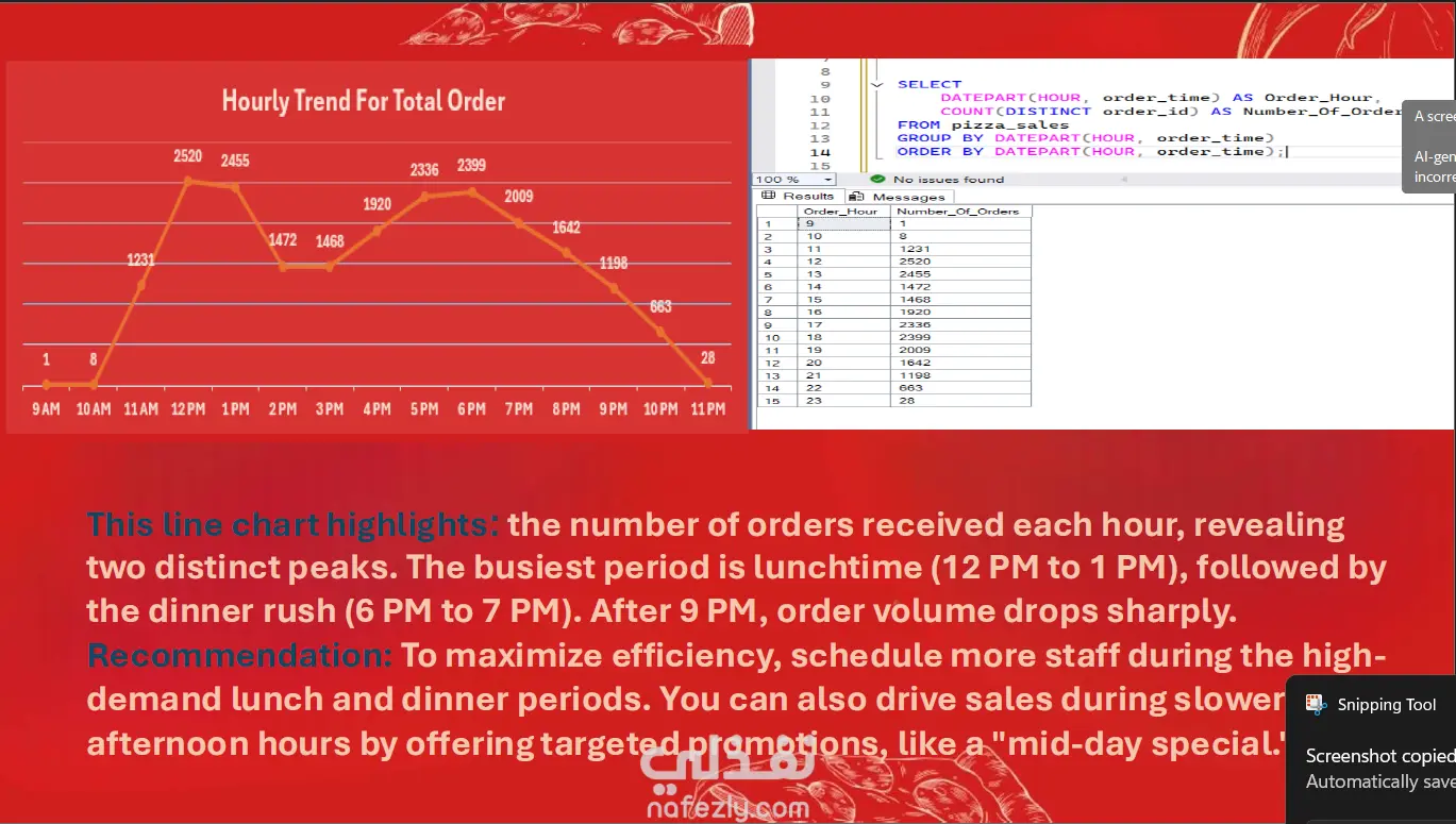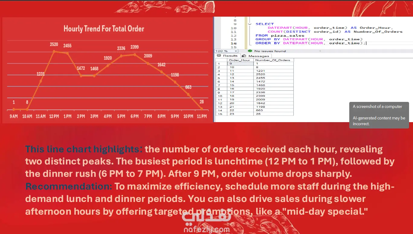 ● في هذا المشروع قمت بتحليل بيانات مبيعات مطعم بيتزا لاستخراج رؤى تساعد الإدارة في اتخاذ قرارات ذكية وتحسين الأداء. قمت بتنظيف البيانات، ثم تصميم لوحة تحكم تفاعلية (Dashboard) باستخدام Power BI تعرض أهم المؤشرات مثل: ● لأيام والأوقات الأكثر ازدحامًا. ● توزيع المبيعات حسب الفئات والأحجام. ● أفضل وأسوأ أنواع البيتزا مبيعًا. ● من خلال التحليل، قدمت مجموعة توصيات عملية مثل تحسين توزيع الموارد، وتخطيط العروض الترويجية في الأيام الهادئة، وتقليل الهدر في المقاسات الأقل مبيعًا. ● النتيجة: لوحة تحكم احترافية تعرض أداء المبيعات بوضوح وتساعد الإدارة على اتخاذ قرارات مبنية على البيانات. ● الأدوات: Power BI – Excel – Data Visualization – Business Insights