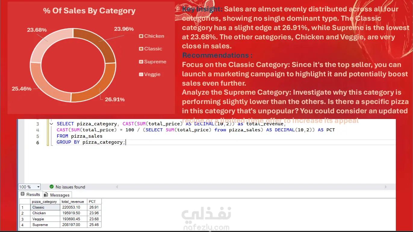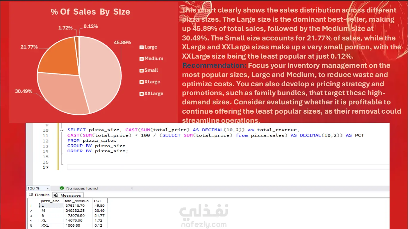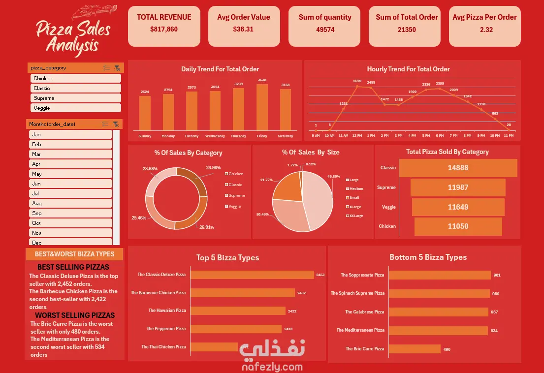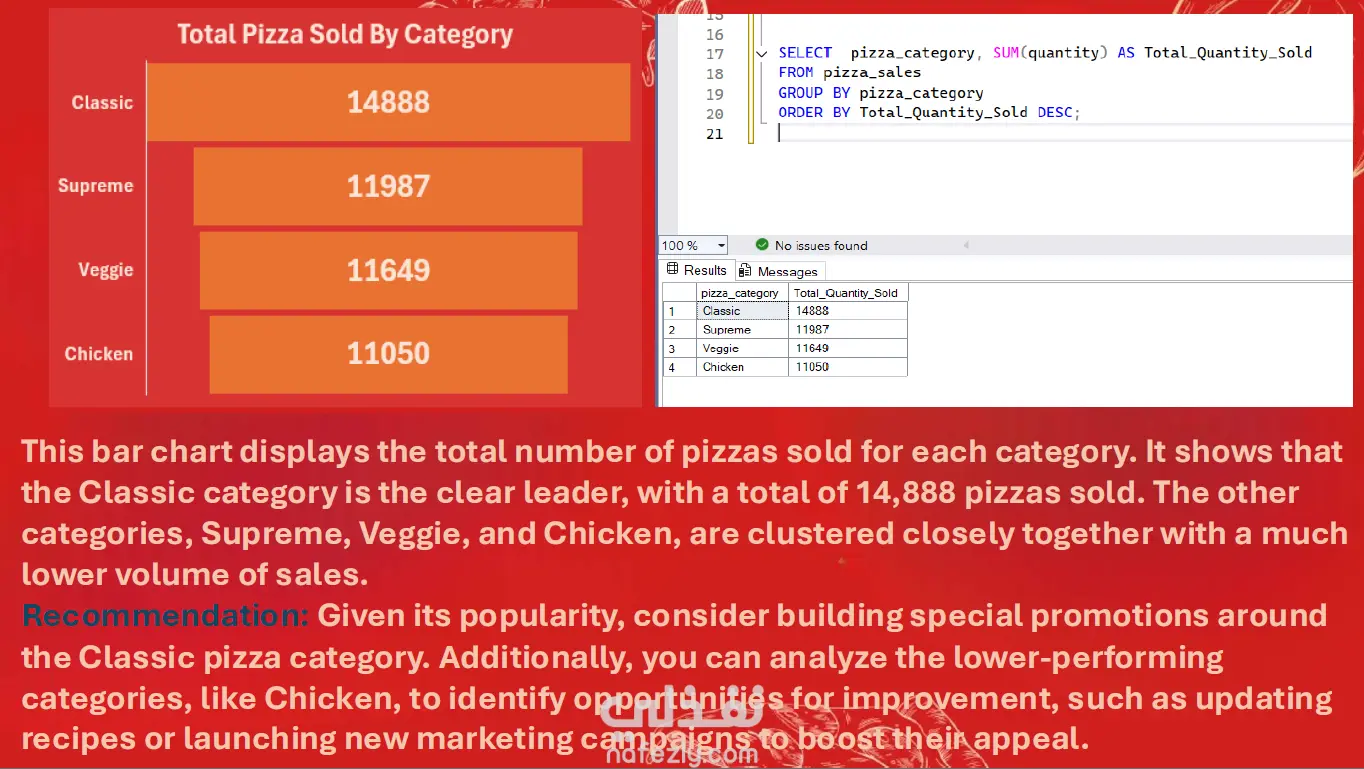 ● في هذا المشروع قمت بتحليل بيانات مبيعات مطعم بيتزا لاستخراج رؤى تساعد الإدارة في اتخاذ قرارات ذكية وتحسين الأداء. قمت بتنظيف البيانات، ثم تصميم لوحة تحكم تفاعلية (Dashboard) باستخدام Power BI تعرض أهم المؤشرات مثل: ● لأيام والأوقات الأكثر ازدحامًا. ● توزيع المبيعات حسب الفئات والأحجام. ● أفضل وأسوأ أنواع البيتزا مبيعًا. ● من خلال التحليل، قدمت مجموعة توصيات عملية مثل تحسين توزيع الموارد، وتخطيط العروض الترويجية في الأيام الهادئة، وتقليل الهدر في المقاسات الأقل مبيعًا. ● النتيجة: لوحة تحكم احترافية تعرض أداء المبيعات بوضوح وتساعد الإدارة على اتخاذ قرارات مبنية على البيانات. ● الأدوات: Power BI – Excel – Data Visualization – Business Insights