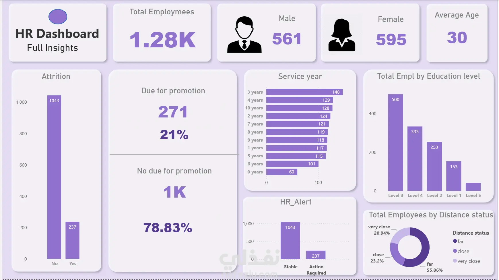 الداشبورد يعرض نظرة كاملة على قوة العمل داخل الشركة، مع إبراز أهم مؤشرات الموارد البشرية لدعم اتخاذ القرار. إجمالي الموظفين : إجمالي عدد العاملين بالشركة. توزيع الجنس:ذكور: 561 -إناث: 595 متوسط العمر (30): متوسط أعمار العاملين. معدل الاستقالة (Attrition): يوضح عدد المغادرين مقارنة بالباقين لتقييم مستوى الدوران الوظيفي. تحليل الترقيات: مستحقون للترقية: 271 موظفًا (21%) غير مستحقين للترقية: حوالي 1,000 موظف (78.83%) سنوات الخدمة: يوضّح توزيع الموظفين حسب سنوات الخبرة لفهم مستوى استقرار القوة العاملة. عدد الموظفين حسب المستوى التعليمي: يساعد على تقييم تركيبة المهارات واتخاذ قرارات التوظيف والتطوير. تنبيه الموارد البشرية (HR Alert): يقسّم الموظفين إلى: مستقرين بحاجة إلى تدخل / Action Required حالة المسافة من مقر العمل: يوضّح نسبة الموظفين القريبين، القريبين جدًا، والبعيدين، لمعرفة تأثير بُعد السكن على عوامل HR.