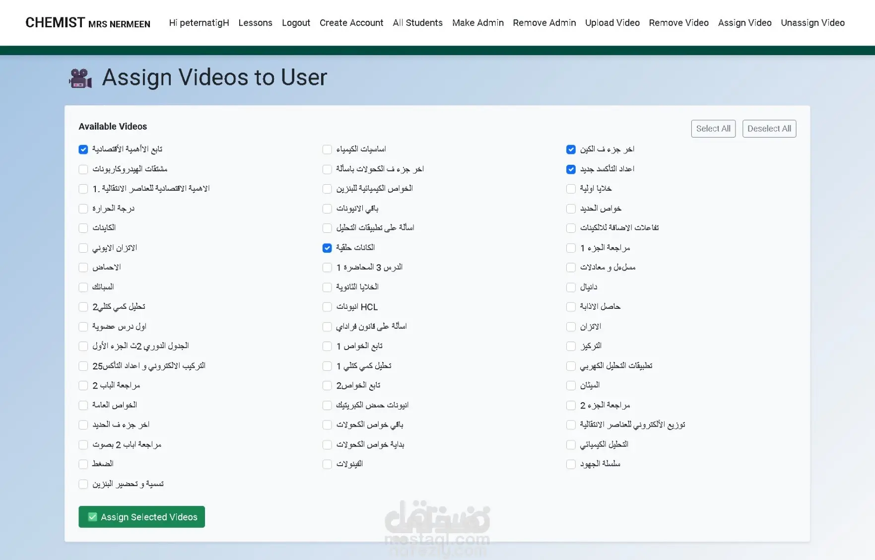 مشروع "Chemist": منصة تعليمية لإدارة الطلاب والمحتوى "Chemist" هو نظام إدارة تعلم (LMS) متكامل، قمتُ بتطويره بالكامل (Full-Stack) باستخدام ASP.NET Core MVC. المشروع ليس مجرد موقع لعرض الفيديوهات، بل هو نظام تعليمي آمن يعتمد على إدارة صلاحيات الوصول (Access Control). الميزات الرئيسية التي قمتُ ببنائها: نظام إدارة المستخدمين (Authentication): استخدام ASP.NET Core Identity لتسجيل الطلاب والمشرفين (Admins) بشكل آمن. بناء لوحة تحكم خاصة للمشرفين. إدارة المحتوى (CMS): يستطيع المشرف (المعلم) رفع الفيديوهات التعليمية، تصنيفها في دورات أو أقسام. إدارة الطلاب والاشتراكات (Authorization): هذه هي الميزة الجوهرية: قمتُ ببناء نظام لإدارة الطلاب وتعيين الصلاحيات. يستطيع المشرف التحكم في "الفيديوهات المسموحة" لكل طالب على حدة (أو لكل مجموعة طلاب). عندما يقوم الطالب بتسجيل الدخول، يرى فقط الفيديوهات التي تم السماح له بمشاهدتها، بينما تظل بقية الفيديوهات مخفية أو مقفلة. التطوير الشامل (MVC): Model: تصميم قواعد البيانات (SQL Server) لربط جداول الطلاب، الفيديوهات، وجدول الصلاحيات (Permissions Table) الذي يحدد العلاقة بينهما. View: بناء الواجهة (Razor Views) لعرض لوحة التحكم للطالب ولوحة تحكم المشرف. Controller: كتابة منطق العمل (Logic) الذي يتحقق من صلاحيات الطالب قبل عرض أي فيديو.