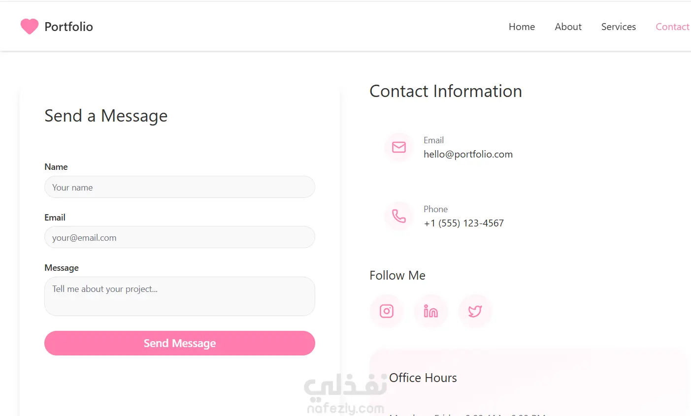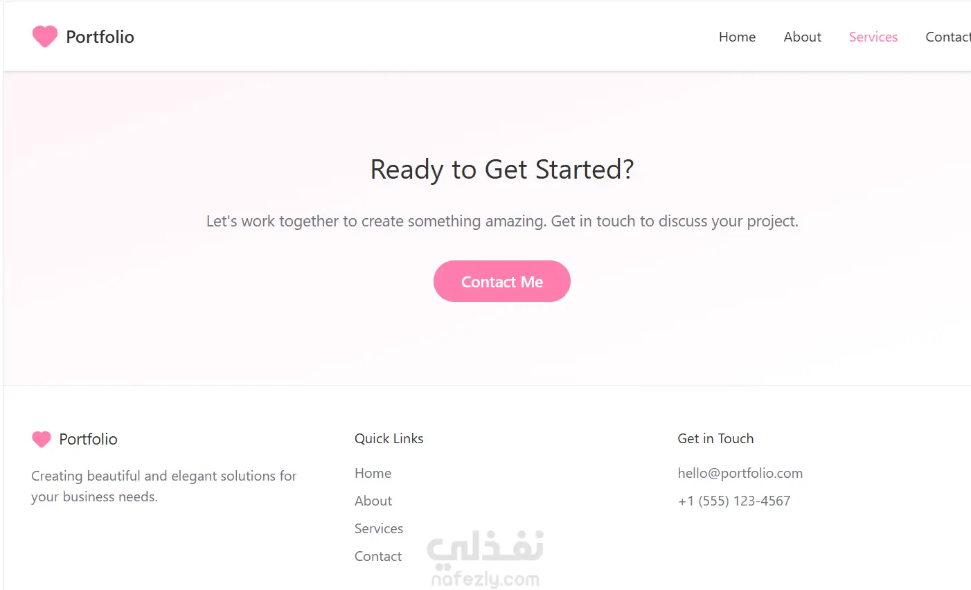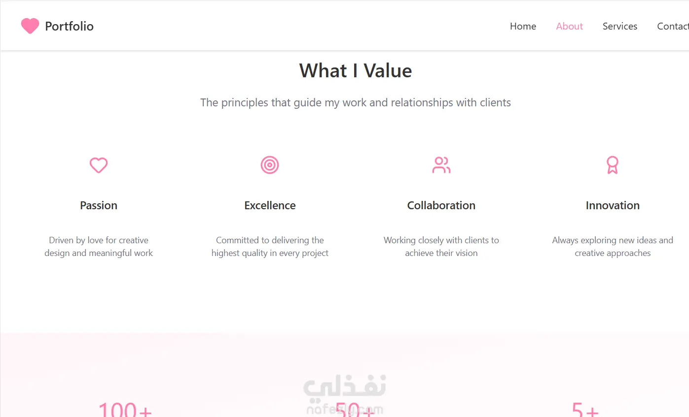 تصميم صفحة Home جذابة. صفحة About جاهزة لعرض نبذة عنك. صفحة Skills أو Tools. صفحة Projects + عرض لكل مشروع بشكل كويس. تصميم صفحة Contact بسيطة وواضحة. ألوان وهوية بصرية متناسقة. تصميم جاهز للتعديل والإضافة.