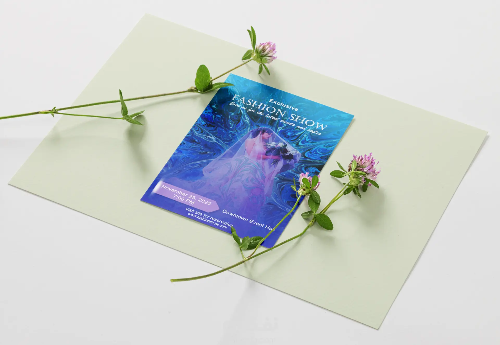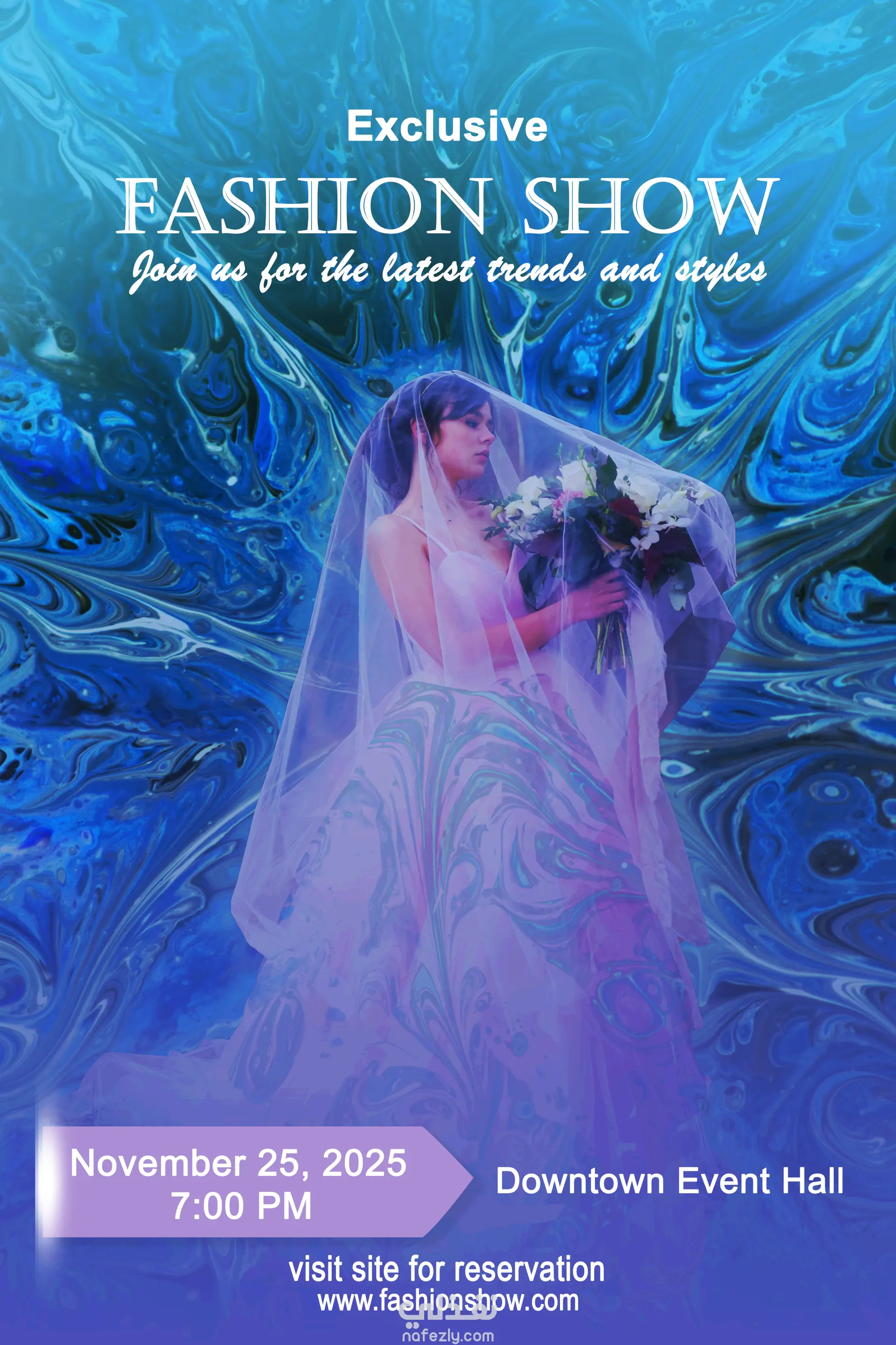 تصميم دعوة أنيق لحدث عرض أزياء حصري، يتميز بخلفية زرقاء جذابة وصورة موديل بفستان عصري. تم تنسيق الكتابة والتفاصيل بشكل واضح ليعكس الفخامة ويجذب الأنظار، ومناسب للمنشورات والمطبوعات الرقمية.