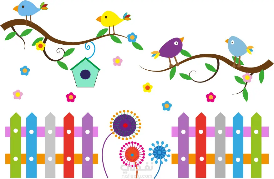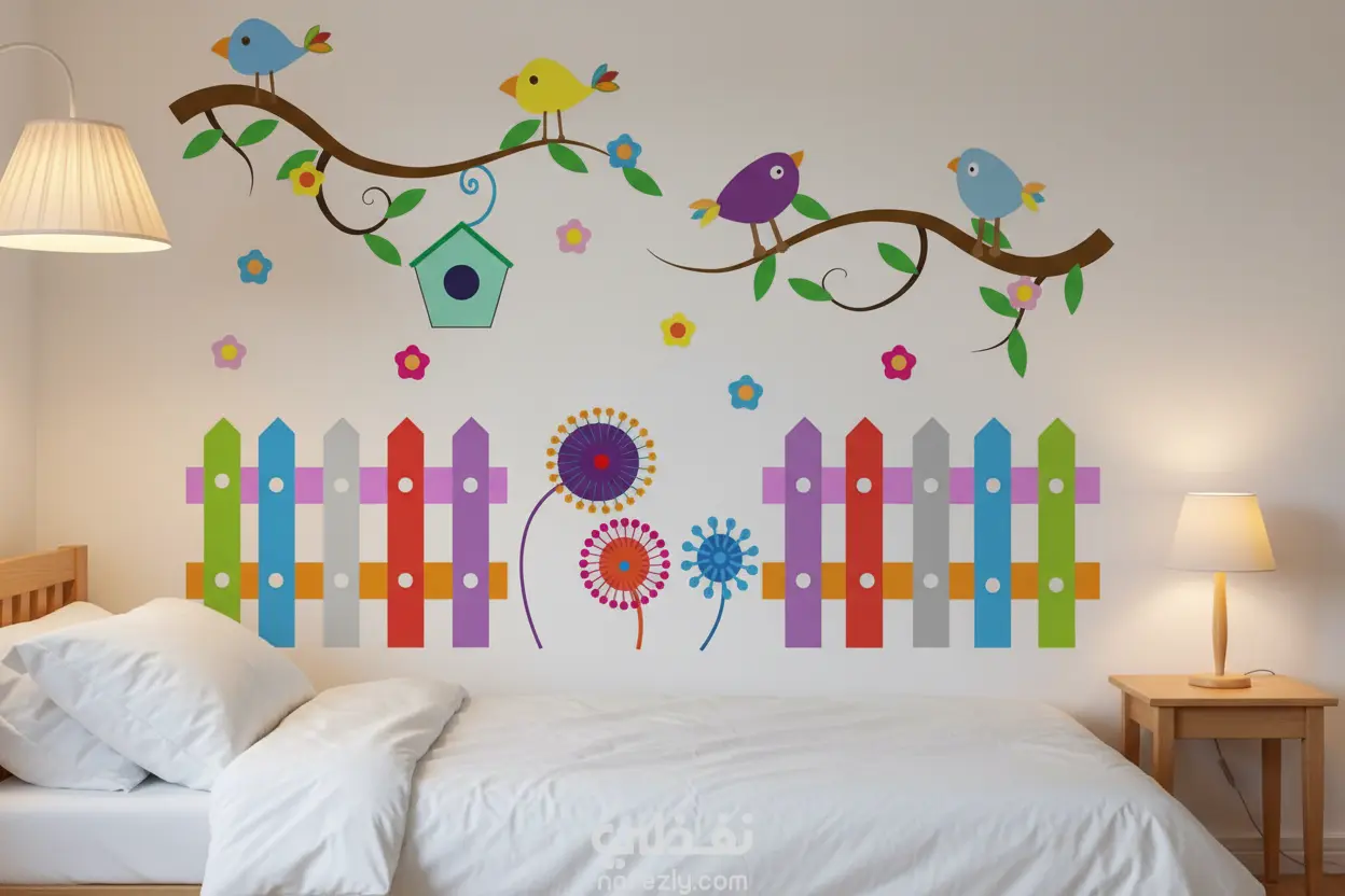 ديكور جداري لغرفة أطفال بتصميم عصري ومرح، يجمع بين أشكال عصافير ملونة وفروع أشجار وأسيجة قوس قزح وزهور، لإضفاء أجواء نابضة بالحياة وسعادة في المكان، ويحفّز خيال الطفل بصورة جذابة ومبهجة.