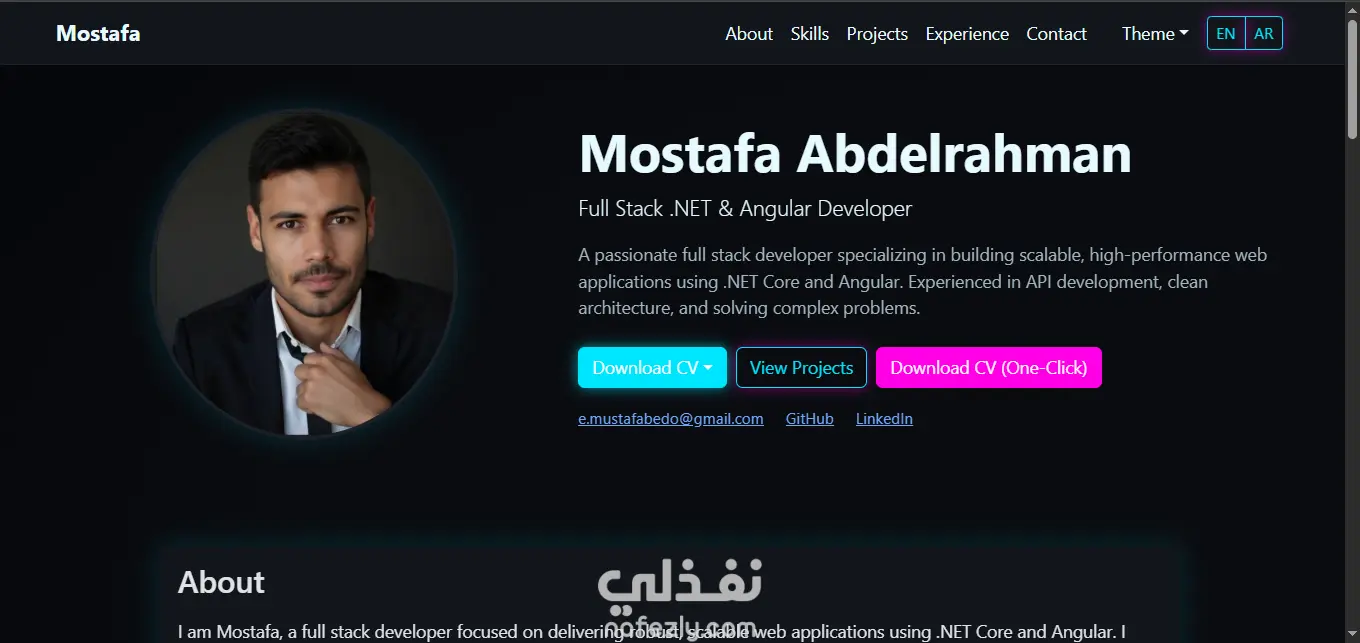 هل تحتاج إلى موقع بورتفوليو احترافي يعرض مهاراتك ومشاريعك بصورة قوية وجذابة؟ أنا مطوّر Full Stack (.NET + Angular) وأقدّم لك خدمة تصميم و طوير موقع شخصي حديث ومتكامل، يُظهر خبرتك التقنية بشكل احترافي ويُعزز فرصك في الحصول على عملاء أو فرص وظيفية. ✔ مميزات الموقع الذي سأطوره لك: تصميم عصري، سريع، ومتوافق مع جميع الأجهز واجهة مستخدم جذابة مبنية باستخدام HTML, CSS, Bootstrap, JavaScript إمكانية اختيار ستايل الموقع: Dark Mode Light Mode Glassmorphism Neon Theme صفحة Hero مميزة تعرض: صورتك الشخصية اسمك منصبك روابط التواصل قسم About احترافي مع سرد تجربتك ومهاراتك قسم Skills (لغات، تقنيات، Frameworks، أدوات) قسم Projects لعرض أعمالك (مع صور وروابط GitHub / Demo) أزرار تحميل مباشرة لملف السيرة الذاتية (CV) بصيغة PDF باللغتين قسم Contact يحتوي نموذج تواصل يعمل مع mailto: كود نظيف، منسق، وسهل التعديل دعم فني بعد التسليم لمدة أسبوع
