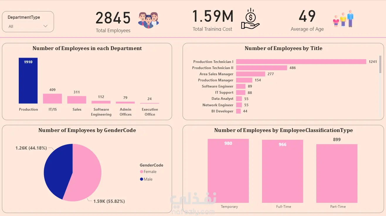 قمت بتحليل مجموعة بيانات خاصة بالموظفين وبرامج التدريب داخل مؤسسة، وصممت داشبورد تفاعلي بالكامل على Power BI بهدف توضيح أهم المؤشرات بشكل بسيط وسهل الفهم. أهم ما قدمته في المشروع: تصميم داشبورد يعرض عدد الموظفين وتوزيعهم حسب الأقسام، النوع، الحالة الاجتماعية، ونوع التوظيف. تحليل بيانات التدريب مثل عدد البرامج، متوسط مدة التدريب، التكاليف السنوية، ونسبة إتمام البرامج. إنشاء رسوم بيانية تفاعلية مع إمكانية الفلترة حسب القسم، النوع، والحالة الوظيفية.