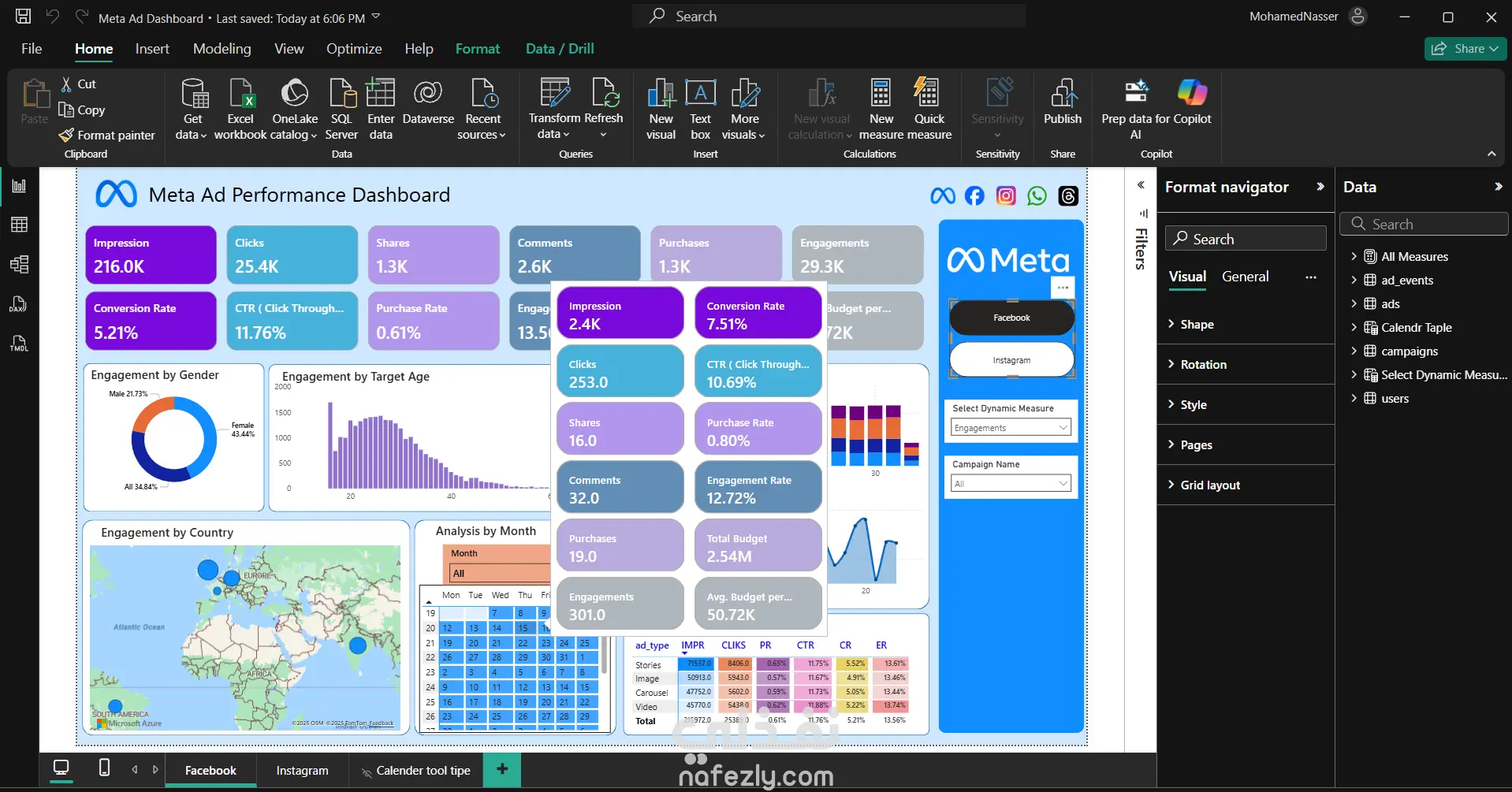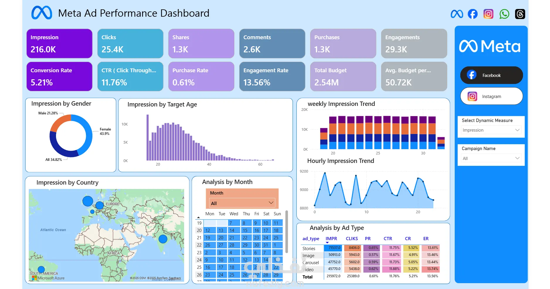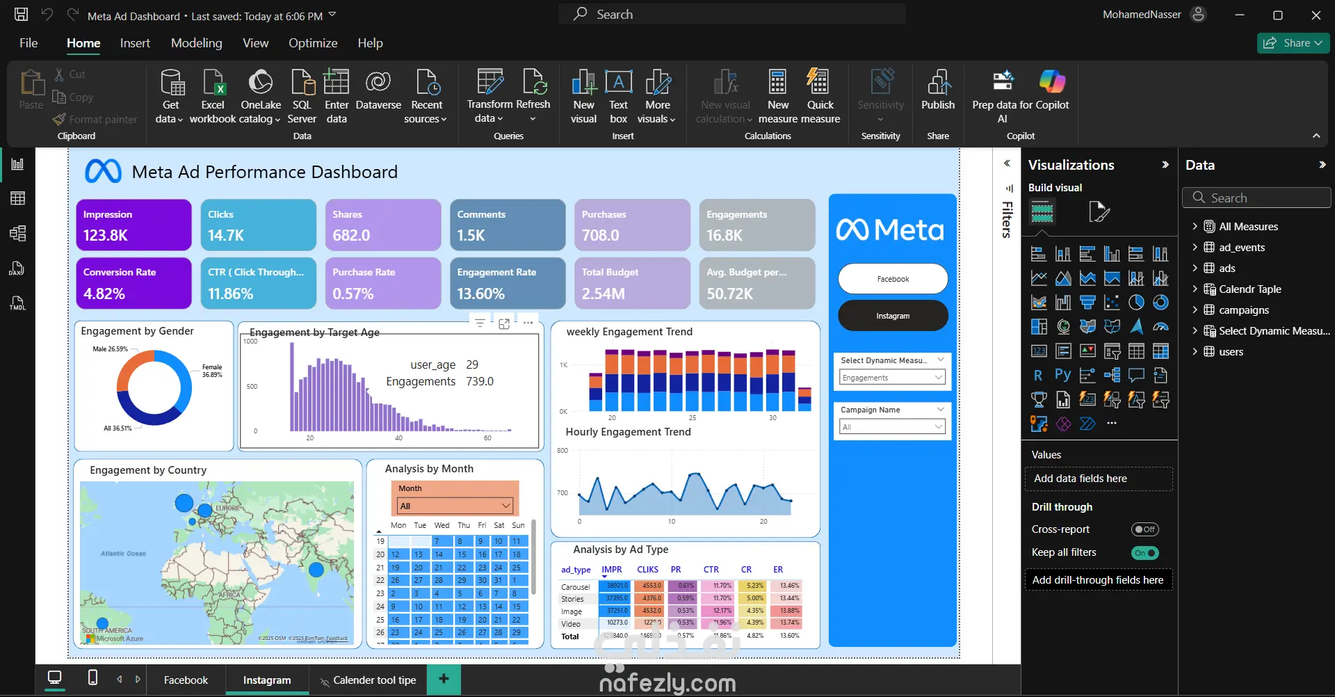 تحليل أداء الإعلانات على فيسبوك وإنستجرام باستخدام Power BI هتقدر من خلال الداشبورد تعرف: عدد المشاهدات، النقرات، والمشتريات بدقة. معدل التحويل (Conversion Rate) ومعدل التفاعل (Engagement Rate). تحليل الجمهور حسب السن – النوع – الدولة. أفضل أوقات وأيام الأداء الأعلى للحملات. مقارنة بين أنواع الإعلانات المختلفة (صورة – فيديو – ستوري). الأدوات المستخدمة: Power BI – Excel – Meta Ads Data