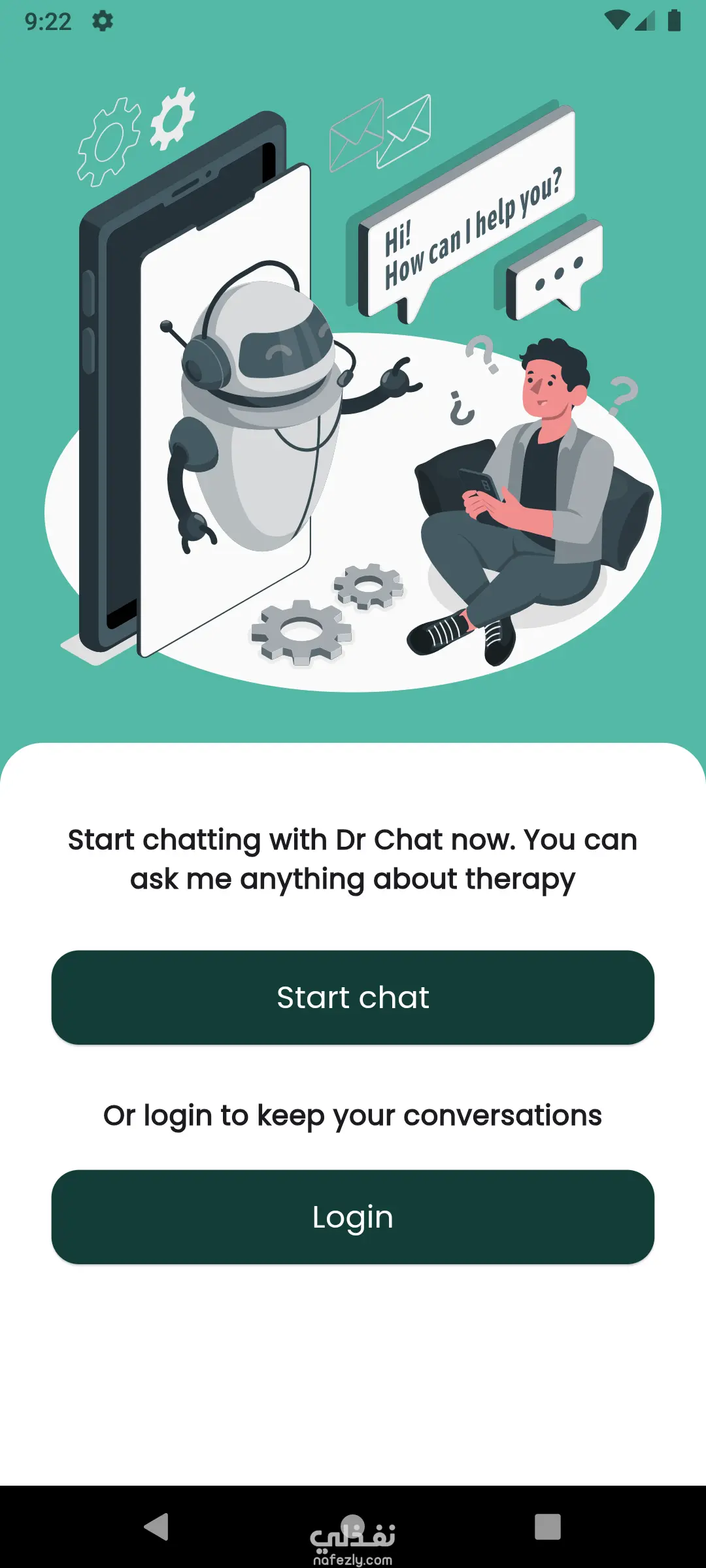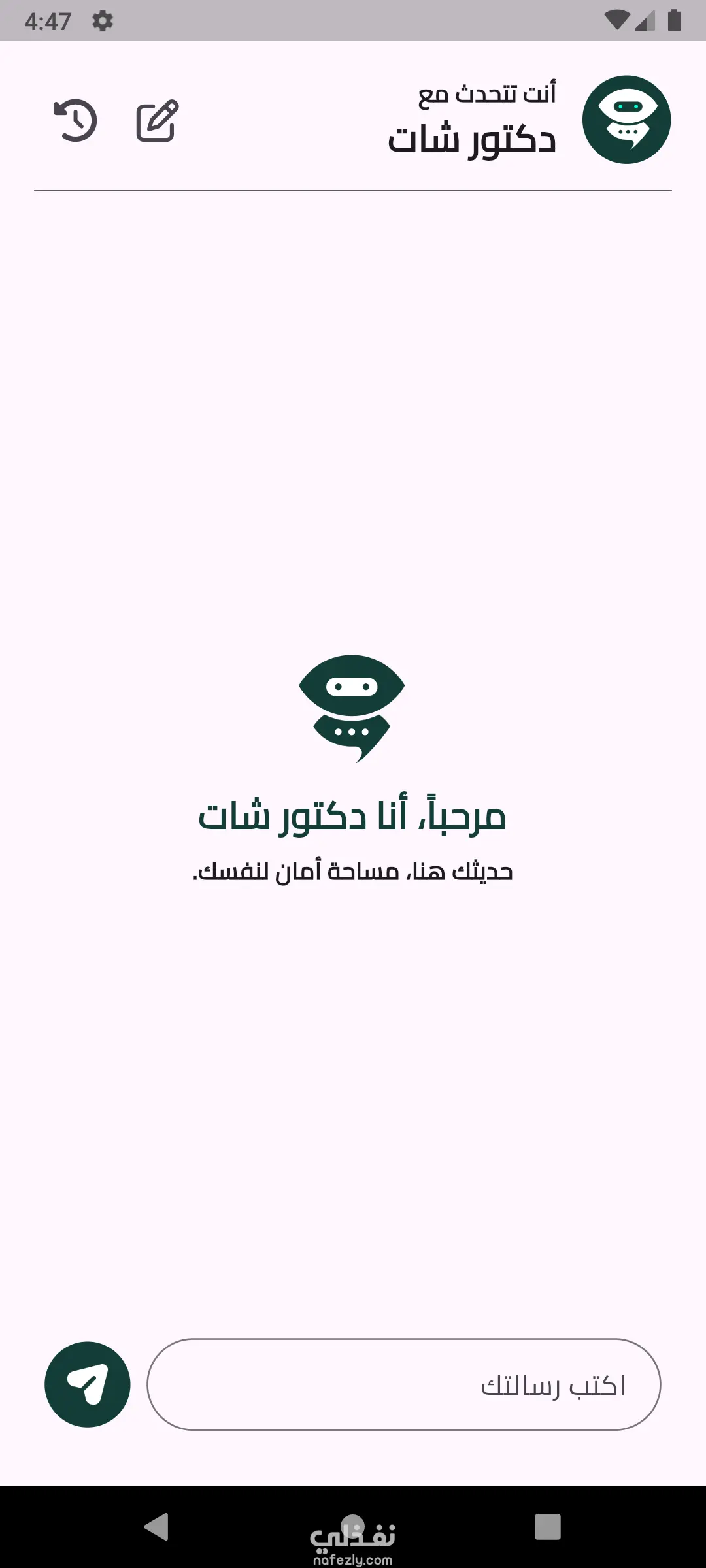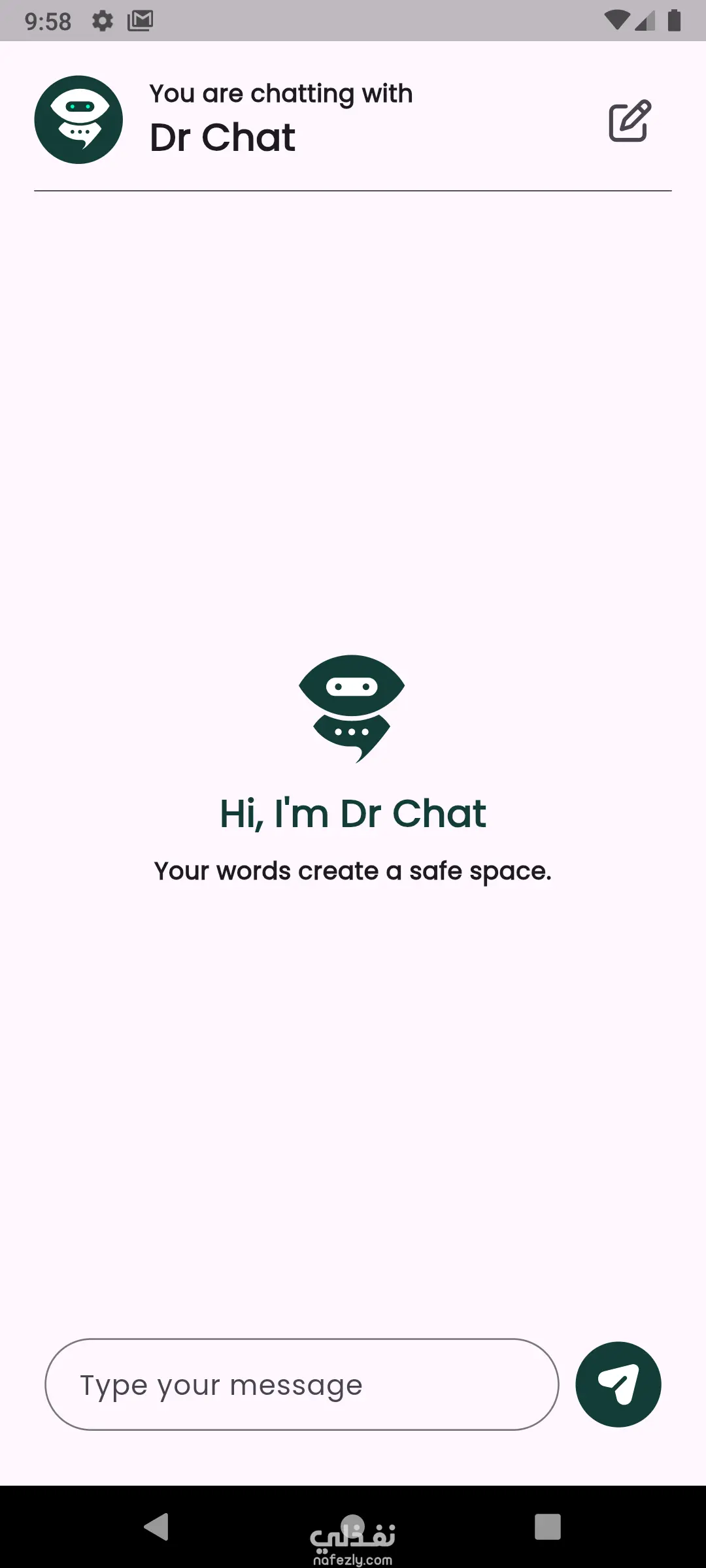 تطبيق Dr Chat— شات بوت ذكي لدكتور نفسي يعمل بالذكاء الاصطناعي، مخصّص لتقديم دعم للصحة النفسية، مساعدتك في التشخيص وتقديم نصائح فورية من خلال تجربة دردشة عصرية، سلسة، ومتجاوبة على جميع الأجهزة.