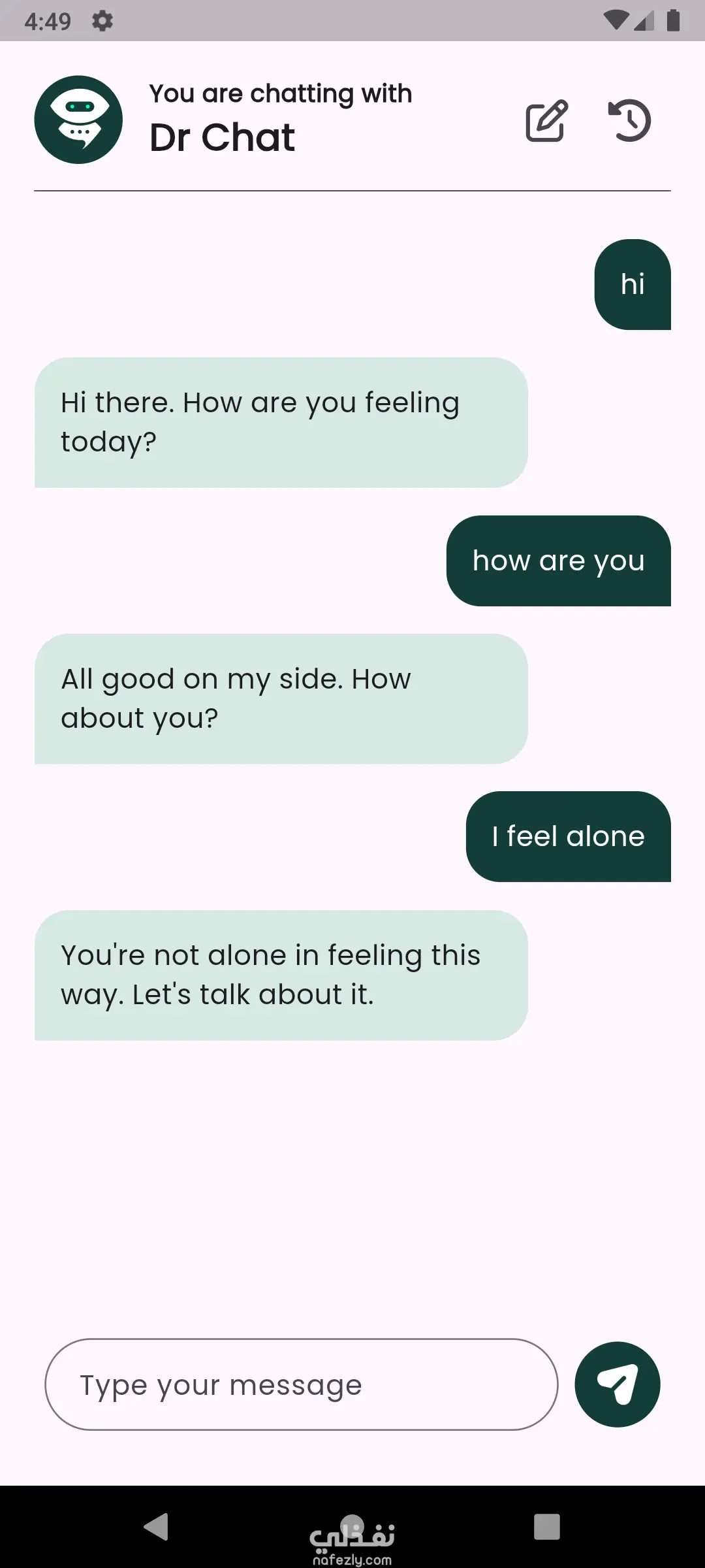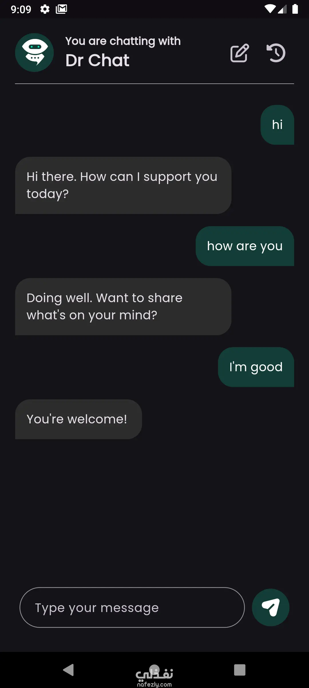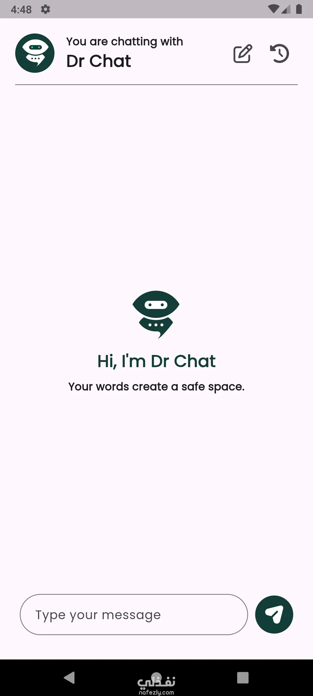 تطبيق Dr Chat— شات بوت ذكي لدكتور نفسي يعمل بالذكاء الاصطناعي، مخصّص لتقديم دعم للصحة النفسية، مساعدتك في التشخيص وتقديم نصائح فورية من خلال تجربة دردشة عصرية، سلسة، ومتجاوبة على جميع الأجهزة.