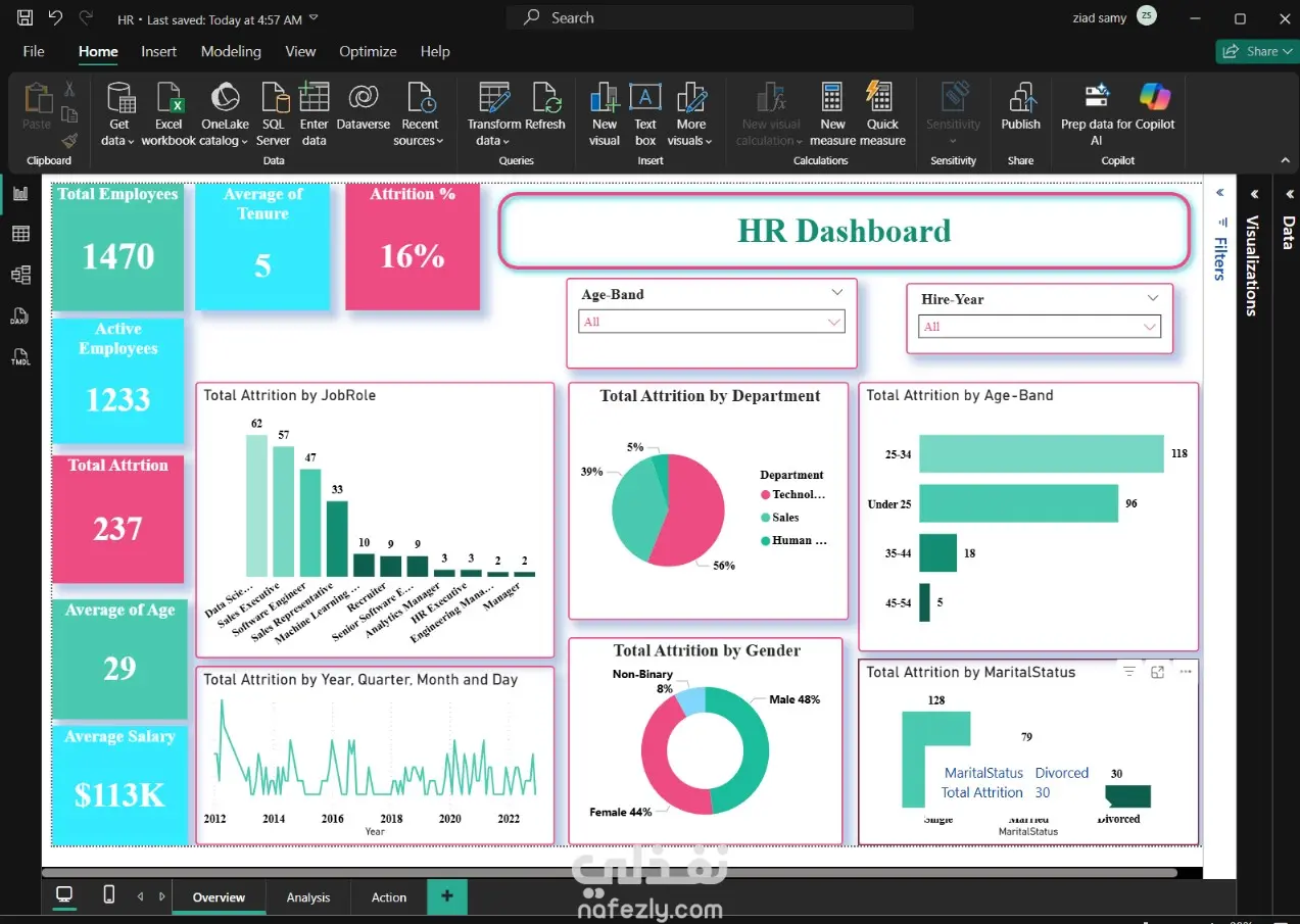 Interactivity: Allows filtering by Age-Band and Hire-Year for dynamic insights.