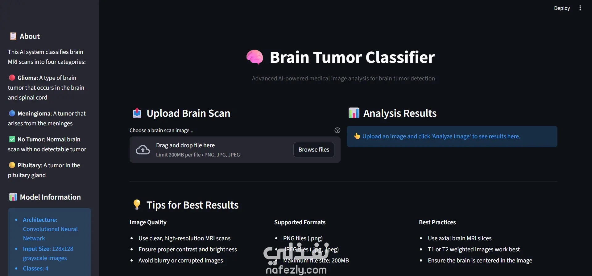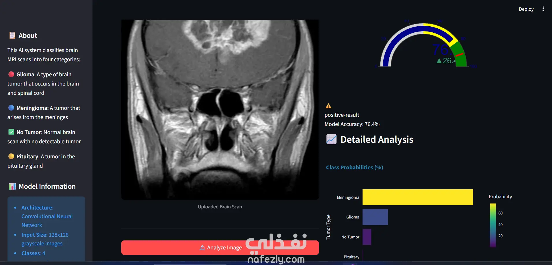 This AI-powered Brain Tumor Classifier analyzes MRI brain scans and identifies the type of tumor present. It can classify images into four categories: Glioma: Tumor in the brain or spinal cord Meningioma: Tumor originating from the meninges Pituitary Tumor: Tumor in the pituitary gland No Tumor: Normal brain scan The model uses a Convolutional Neural Network trained on preprocessed grayscale MRI images. It provides a confidence score for predictions and visualizes class probabilities and model accuracy using interactive charts. It is designed for educational and research purposes and should not be used as a medical diagnostic tool.