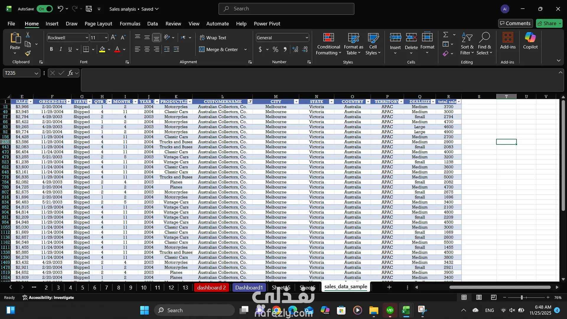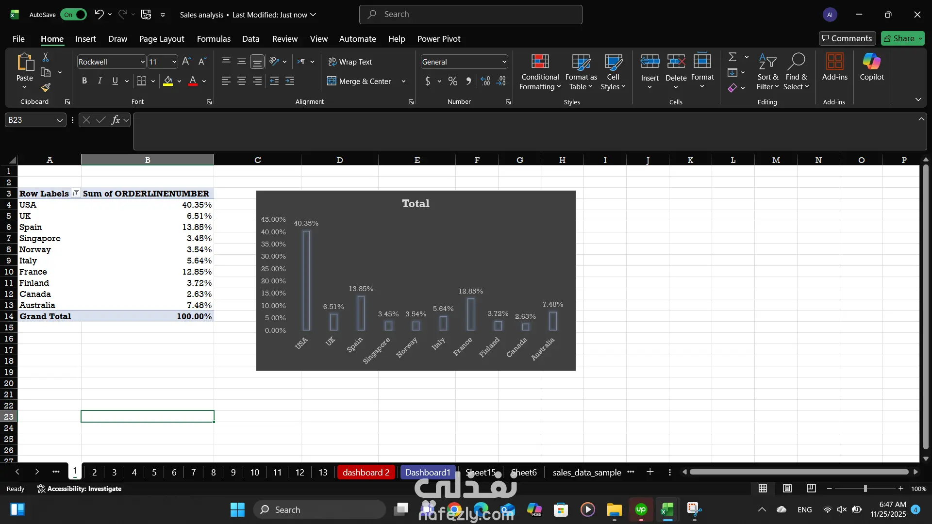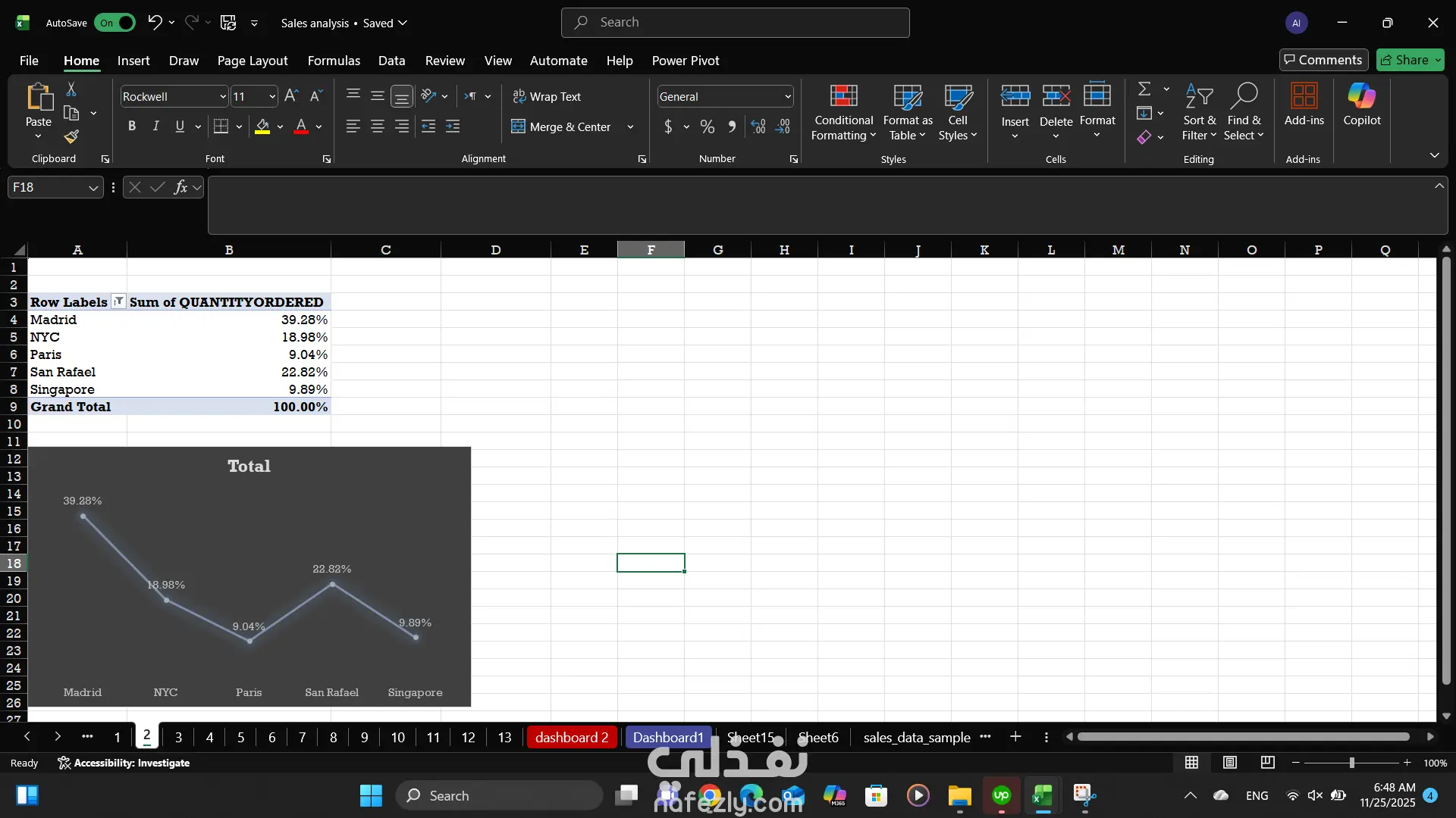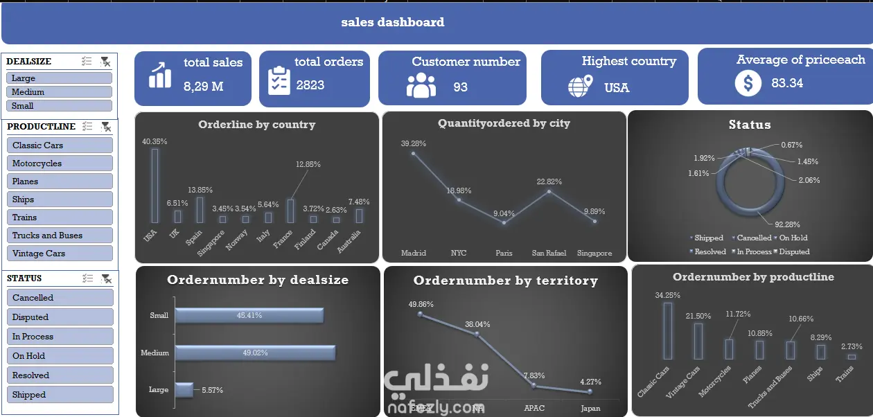 قمت بتصميم لوحة معلومات شاملة لتحليل بيانات المبيعات باستخدام Excel، بهدف عرض أداء المبيعات عبر الدول، المدن، المناطق الجغرافية، خطوط المنتجات، وأحجام الصفقات.
