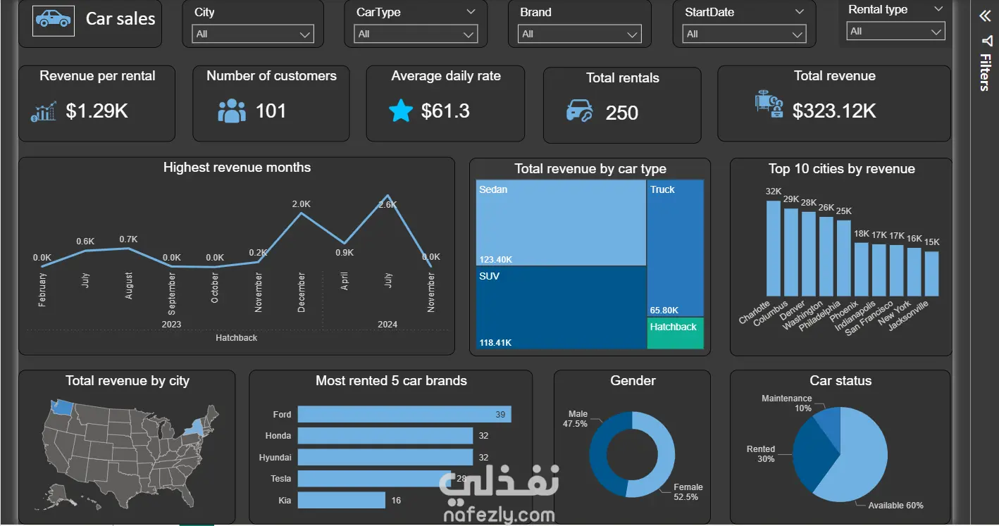 قمت بتطوير لوحة معلومات تفاعلية باستخدام Power BI لتحليل بيانات مبيعات السيارات وتوزيعها حسب المدن، العلامات التجارية، نوع الوقود، وحالة المبيعات.