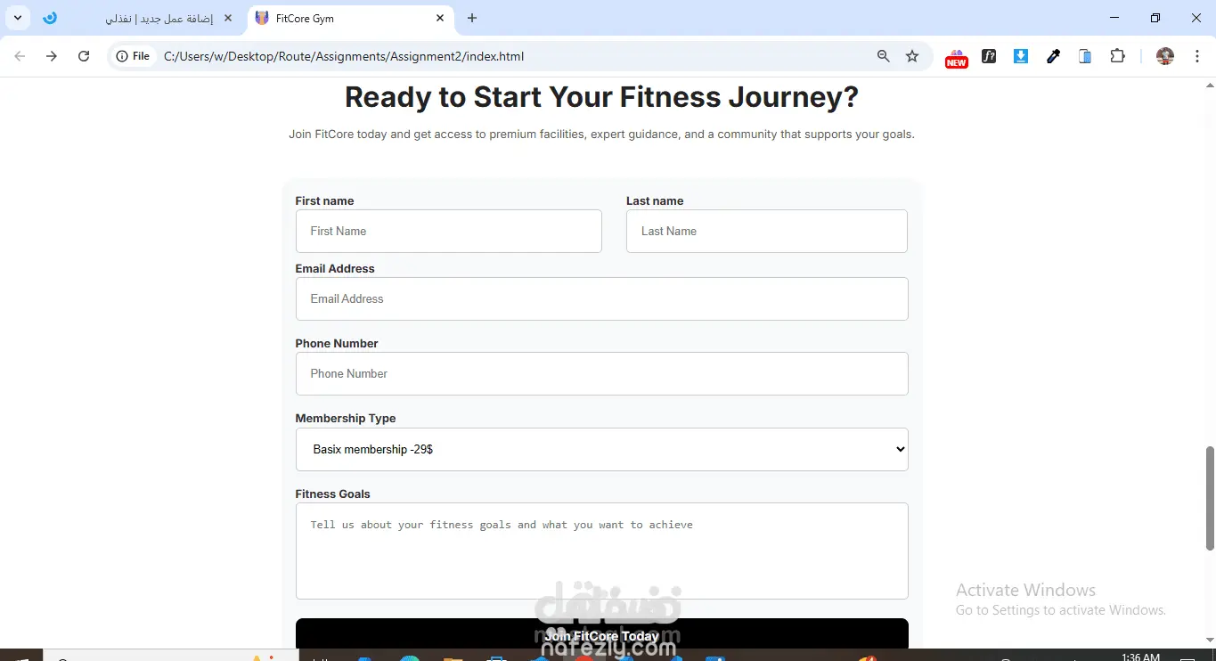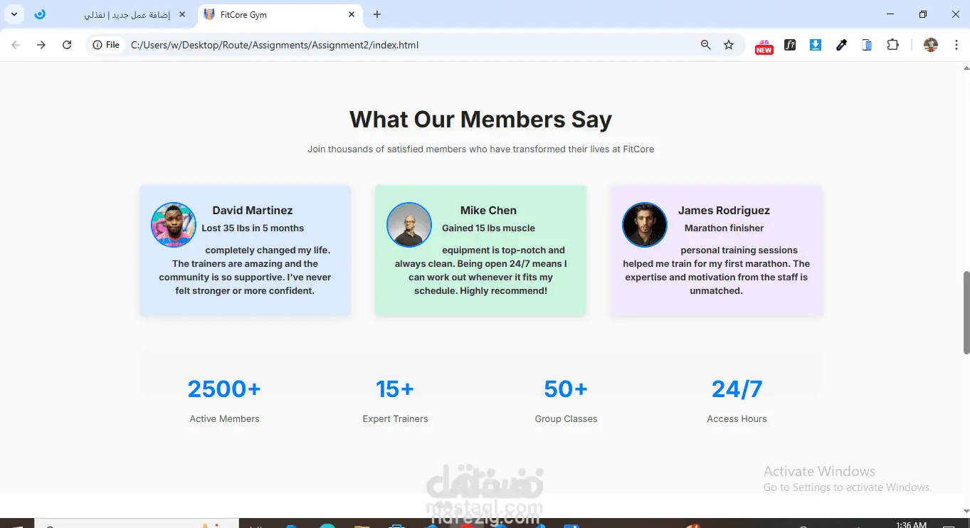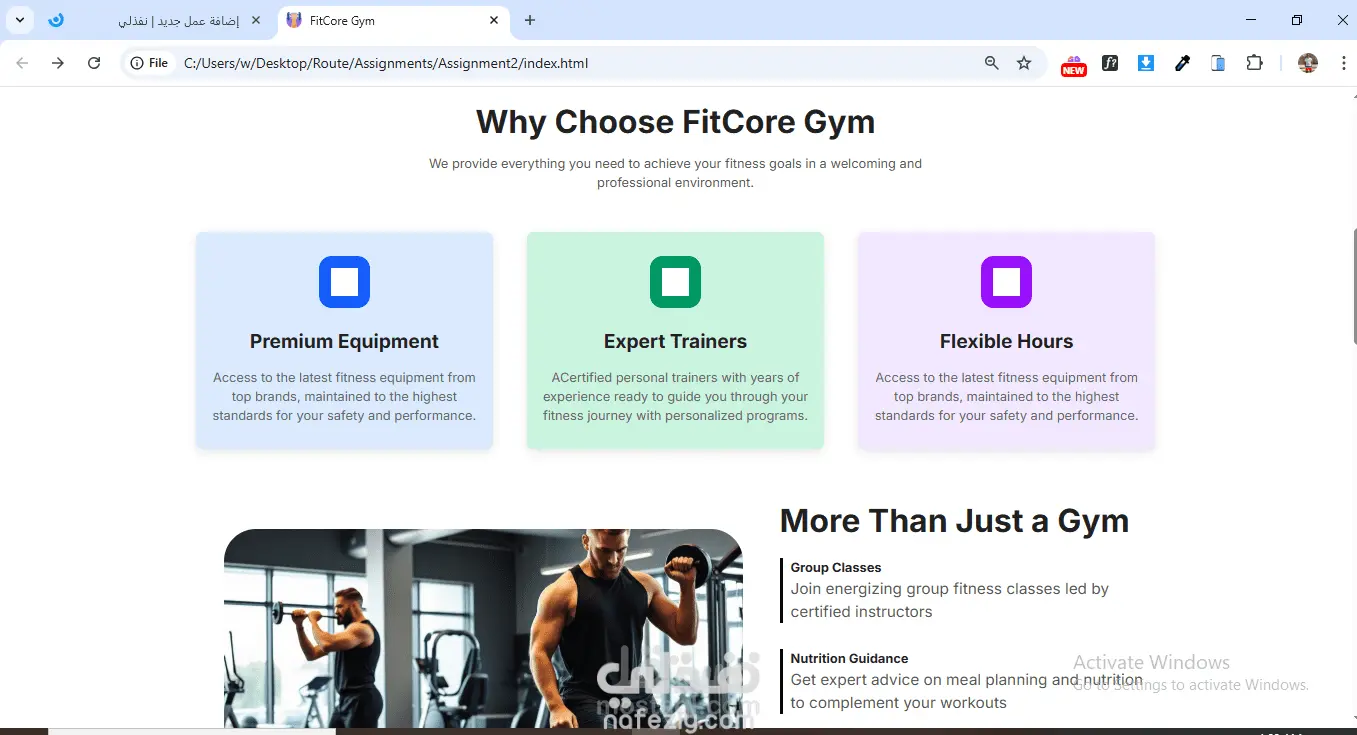 قمت بتصميم وتطوير واجهة كاملة لموقع نادي رياضي باسم FitCore Gym بتصميم عصري وجذاب يركز على الهوية البصرية للمكان. المشروع تم تنفيذه باستخدام HTML وCSS مع توزيع منسّق للعناصر، استخدام صور احترافية، وعرض المحتوى بطريقة واضحة ومريحة للمستخدم، مع مراعاة أن الموقع متجاوب (Responsive) لجميع الشاشات.