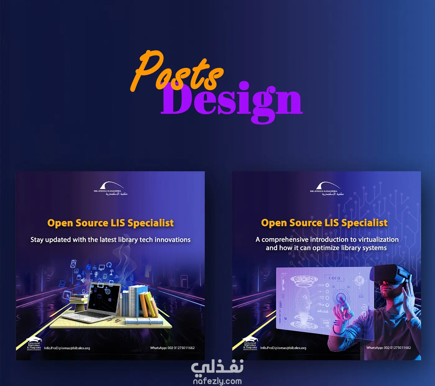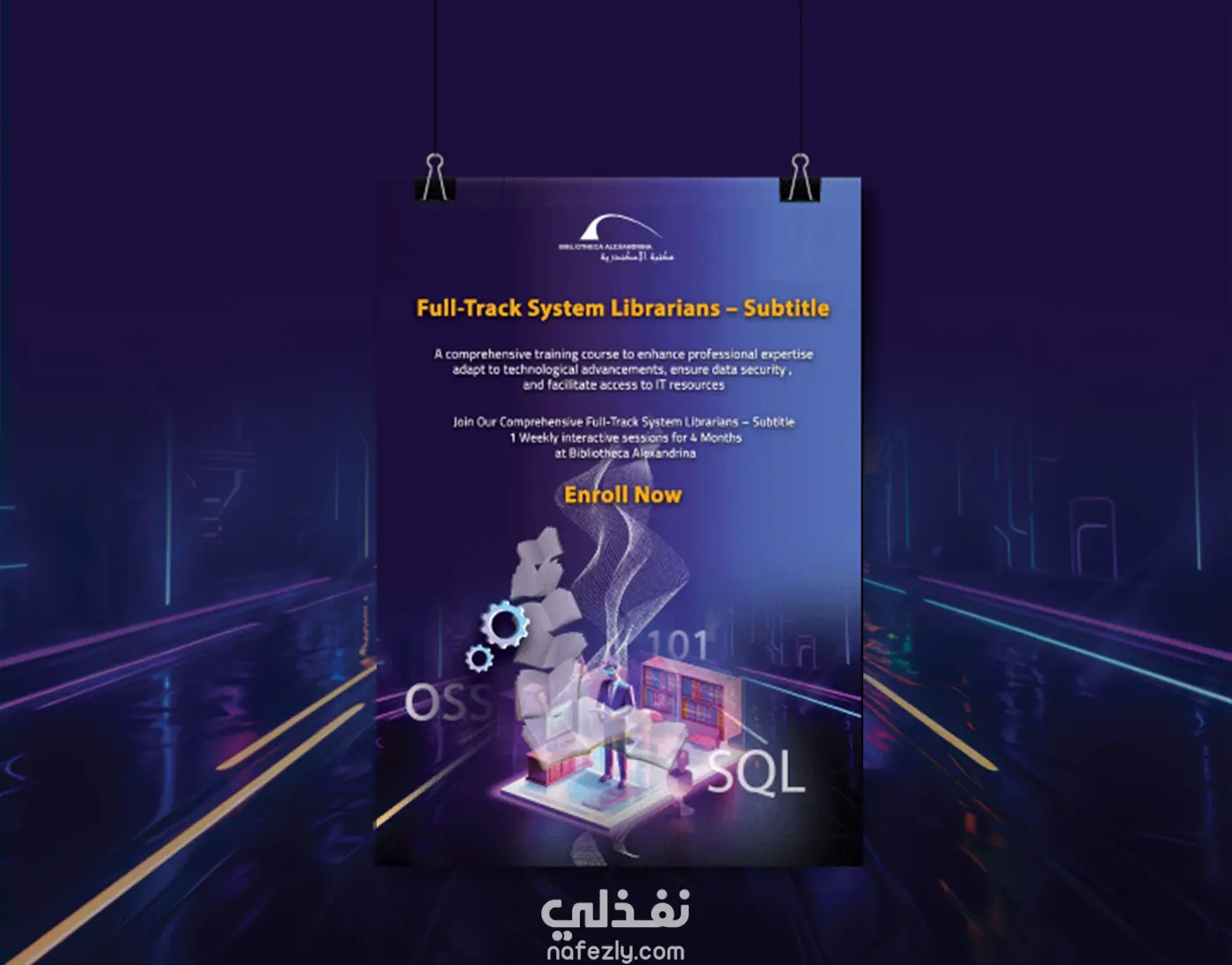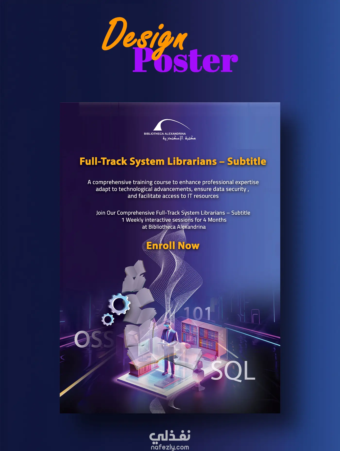 دّمت في هذا المشروع مجموعة من التصميمات الخاصة بكورس Full-Track System Librarians – Subtitle المقدم من مكتبة الإسكندرية، وركّزت خلالها على بناء أسلوب بصري واضح واحترافي يعكس الطابع التعليمي للكورس. عملت على تصميم بوستات تعريفية وترويجية متناسقة في الألوان والعناصر، مع الحفاظ على هوية بصرية موحدة تبرز محتوى الدورة وتسهّل وصول المعلومات للمشاركين