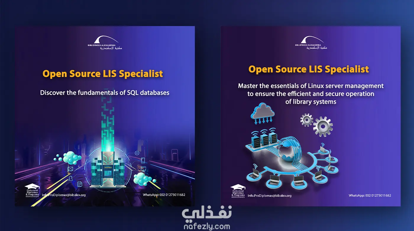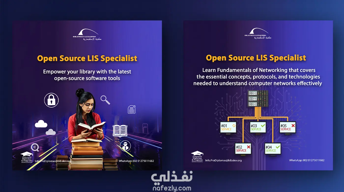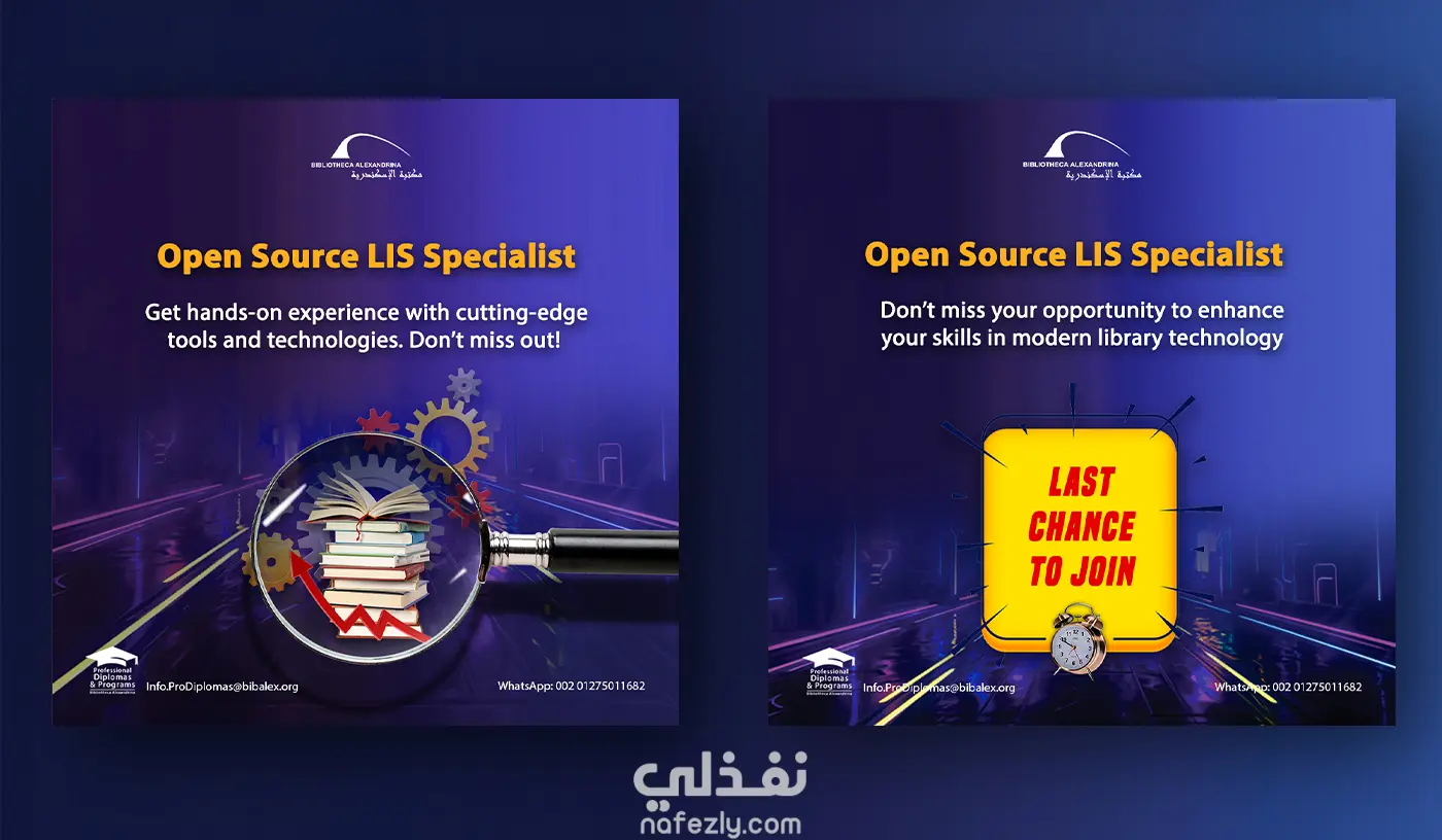 دّمت في هذا المشروع مجموعة من التصميمات الخاصة بكورس Full-Track System Librarians – Subtitle المقدم من مكتبة الإسكندرية، وركّزت خلالها على بناء أسلوب بصري واضح واحترافي يعكس الطابع التعليمي للكورس. عملت على تصميم بوستات تعريفية وترويجية متناسقة في الألوان والعناصر، مع الحفاظ على هوية بصرية موحدة تبرز محتوى الدورة وتسهّل وصول المعلومات للمشاركين
