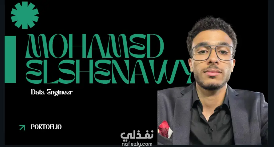 يعرض البورتفوليو معلوماتي الأساسية كمهندس بيانات، بالإضافة إلى أهم المهارات التقنية والشخصية، مع تنسيق بصري متناسق وأسلوب يعكس الاحترافية.