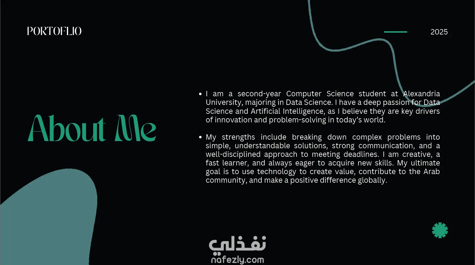 تم تصميم بورتفوليو شخصي احترافي باستخدام Canva ليكون واجهة مميزة تعكس الهوية المهنية بشكل واضح وجذاب.