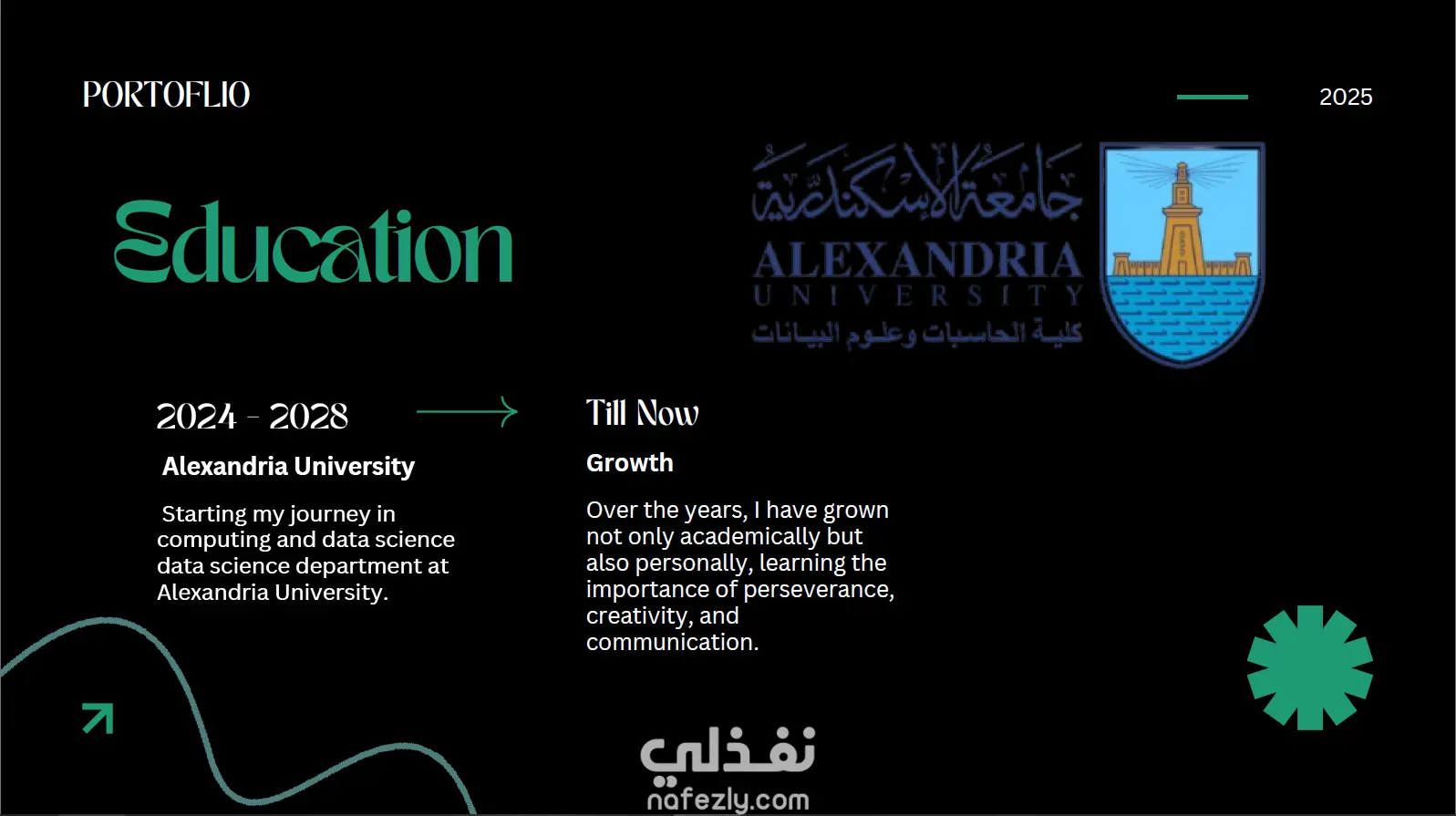 البورتفوليو قابل للتحديث والتطوير وإضافة أي أقسام مستقبلية مثل الخبرات أو المشاريع أو الروابط المهنية.
