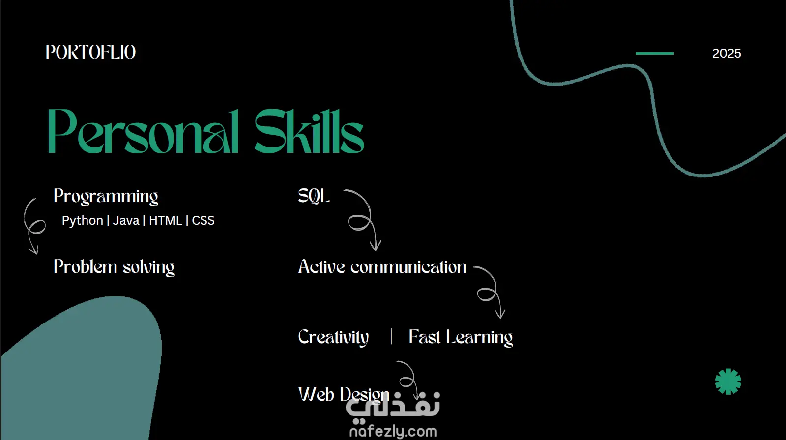 كما يشمل القسم الخاص بالمهارات عرضًا مرتبًا للقدرات التقنية مثل Python وSQL والبرمجة، إلى جانب المهارات الشخصية كالتواصل الفعّال وحل المشكلات.