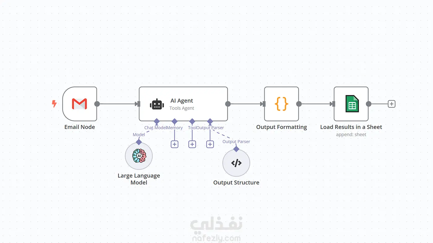 تم بناء نظام ذكي يقوم باستخراج البيانات تلقائيًا من الإيميلات باستخدام AI Agent ثم تحويلها لهيكل منظم وإرسالها مباشرة إلى Google Sheets دون أي تدخل يدوي.