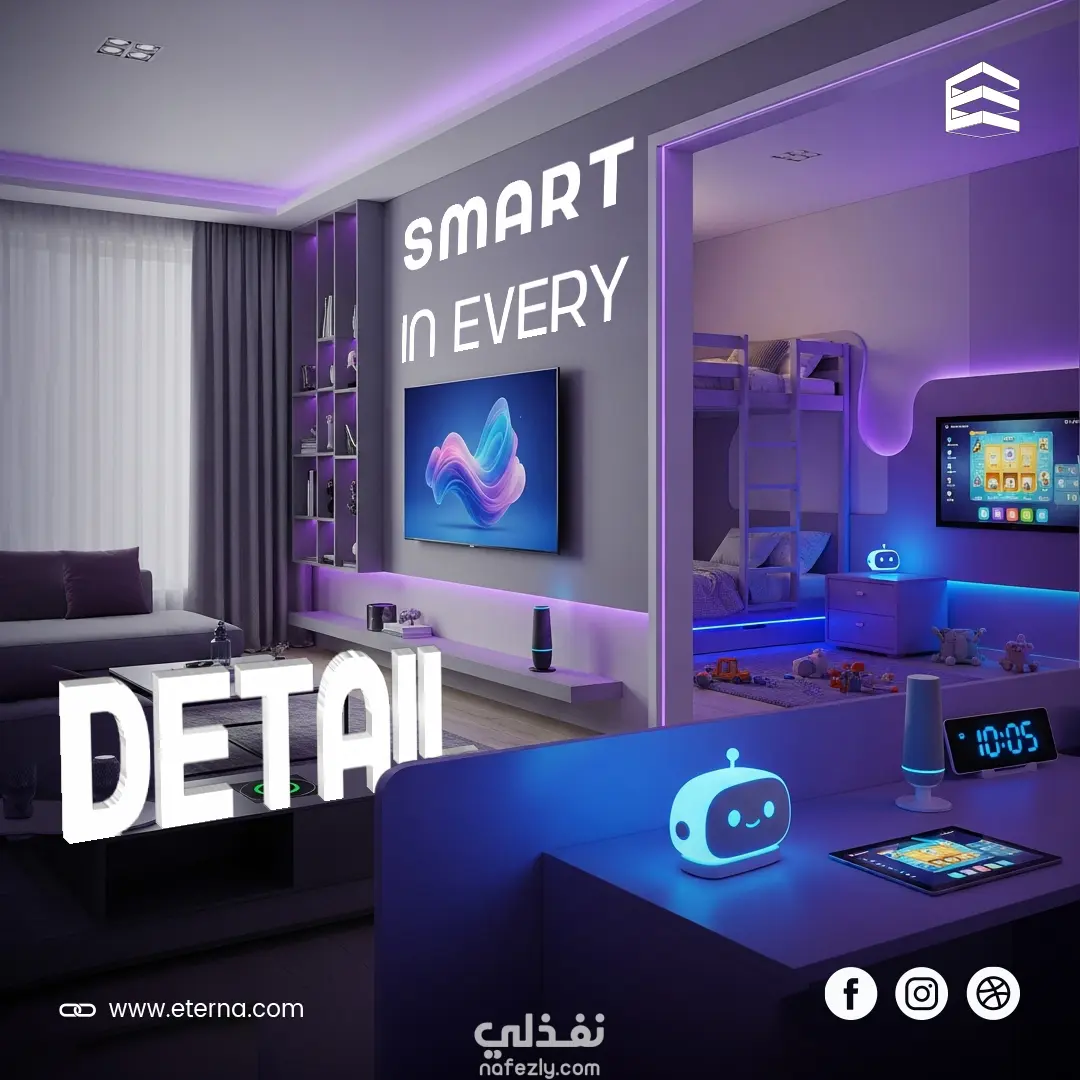 قمت بتصميم بوستر دعائي احترافي لمشروع Eterna للمنازل الذكية، بحيث يبرز مفهوم “Smart in Every Detail”. يعتمد التصميم على إبراز التكامل بين التكنولوجيا والديكور الداخلي من خلال إضاءة LED ذكية، شاشات تفاعلية، وروبوتات منزلية، مع الحفاظ على هوية لونية موحدة ولمسة مستقبلية.