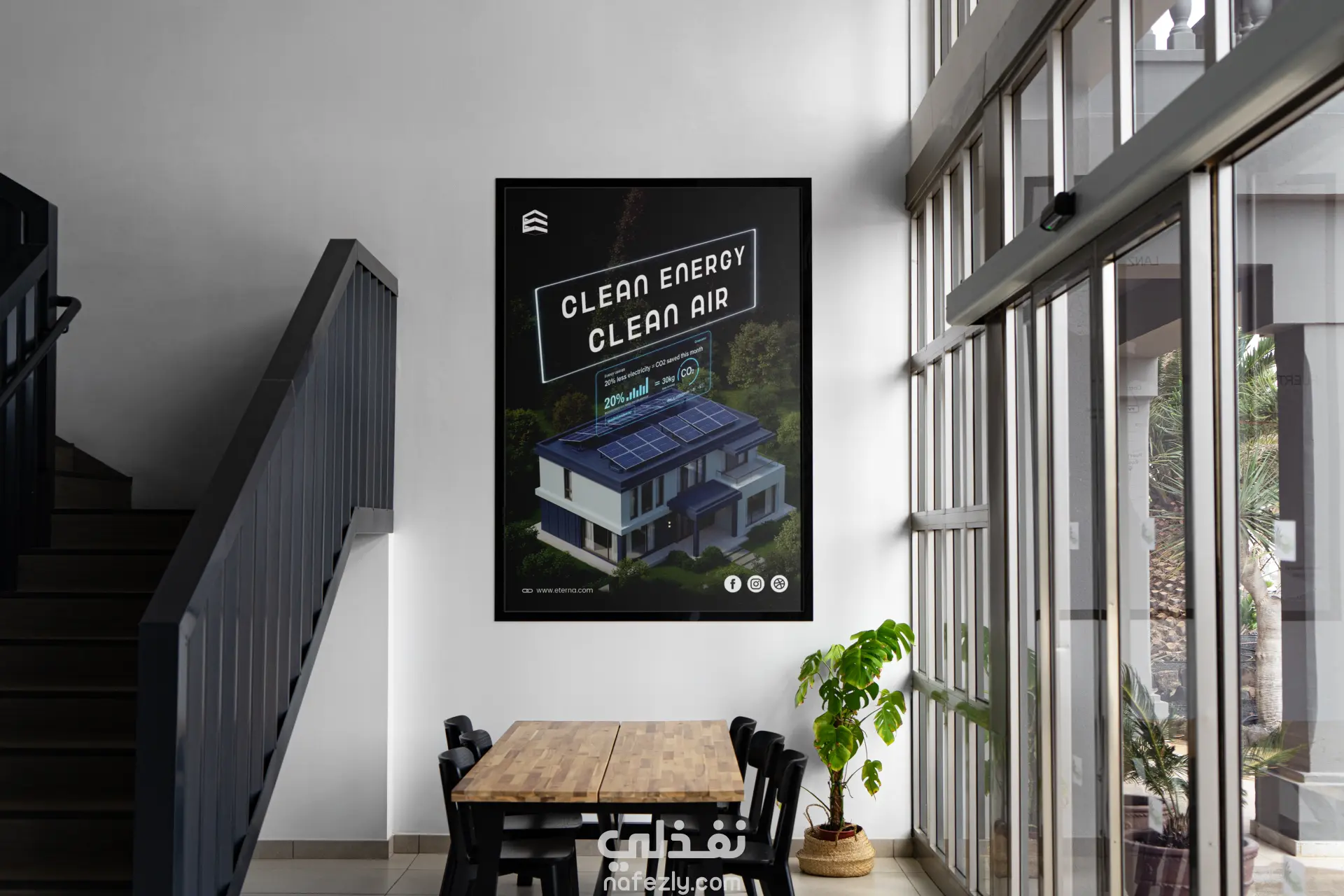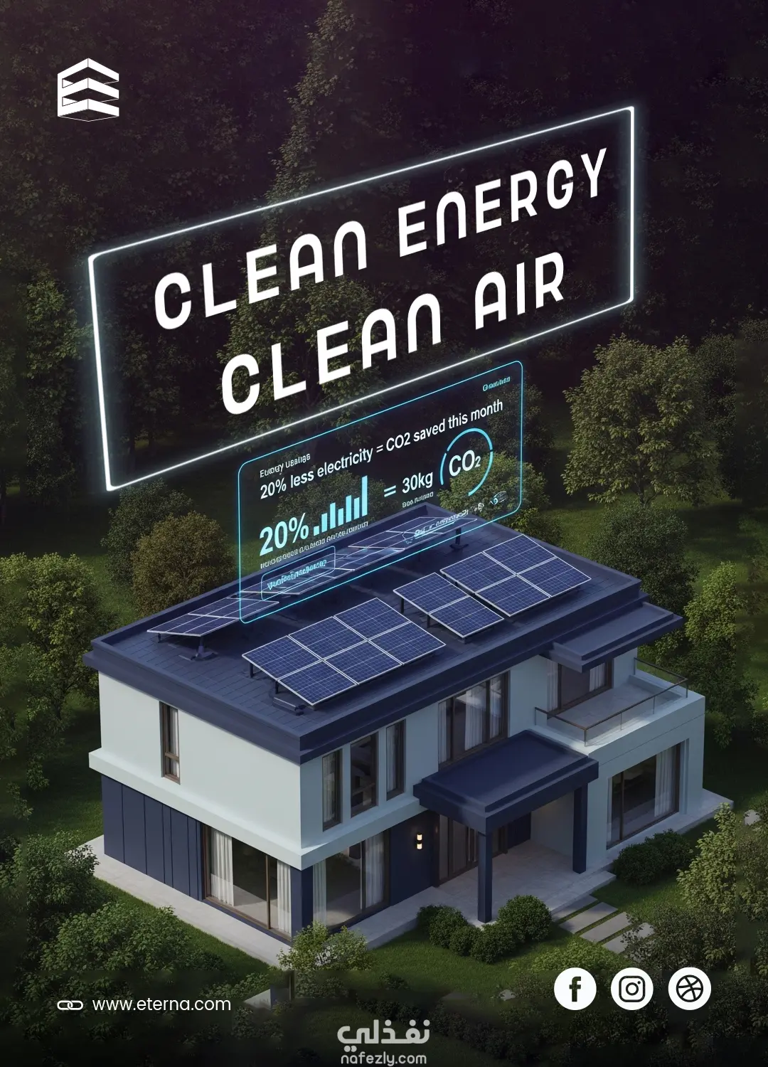قمت بتصميم بوستر دعائي يعرض مفهوم الطاقة النظيفة للمنازل الذكية بشكل عصري وجذاب. يركز التصميم على إبراز دور الألواح الشمسية في تحسين جودة الهواء، من خلال دمج عناصر مثل البيانات البيئية، الرسوم التوضيحية وإنفوغرافيك بسيط يعكس فوائد الطاقة المتجددة.